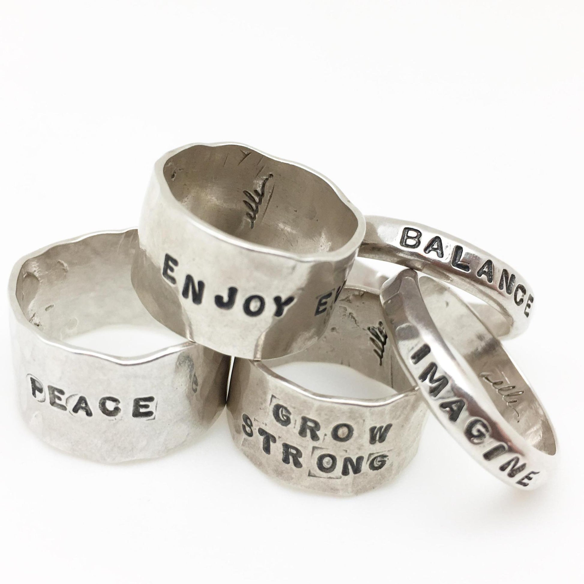 Hand forged sterling silver rings. (Please note: These are not machine made/machine engraved rings.) Our local artist hand makes each ring "to-order." They take three to four weeks to get to you. Each ring is hand-cut and then (if you choose) hand-stamped with your custom word. Next the artist hand-shapes it to size, it is then hand-soldered and hand-struck to give it that wonderful struck finish. Finally it is polished to a shine, but the artist uses a technique that retains the dark lettering. The lettering struck deep into the silver stands the test of time. Every ring is solid sterling silver.