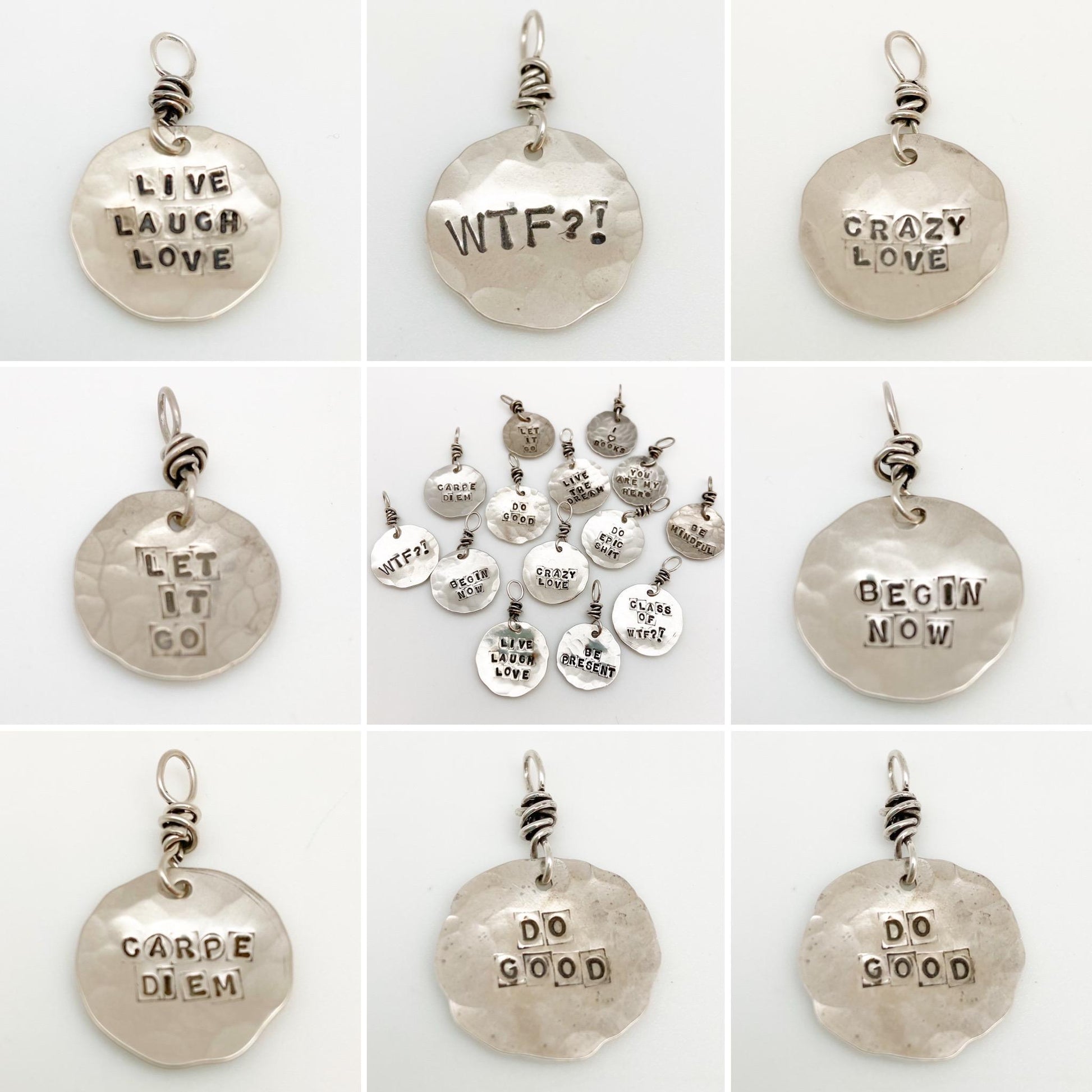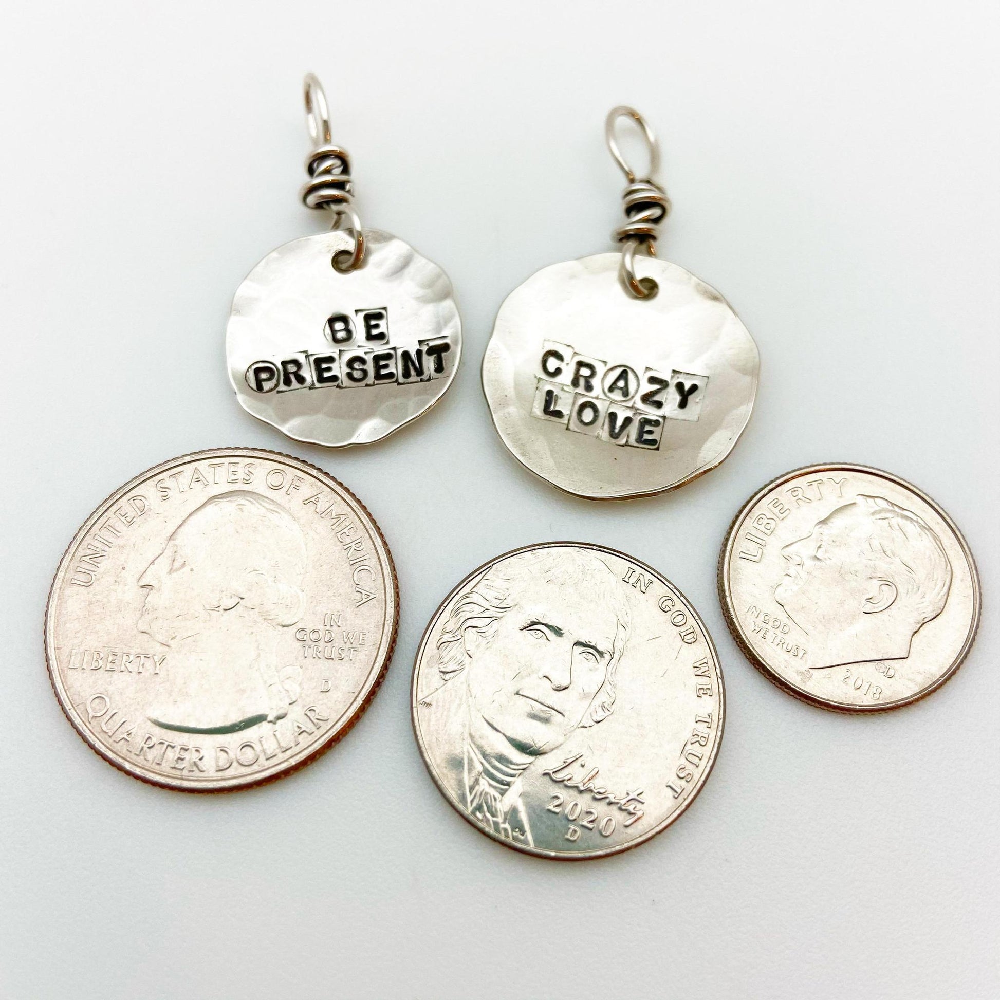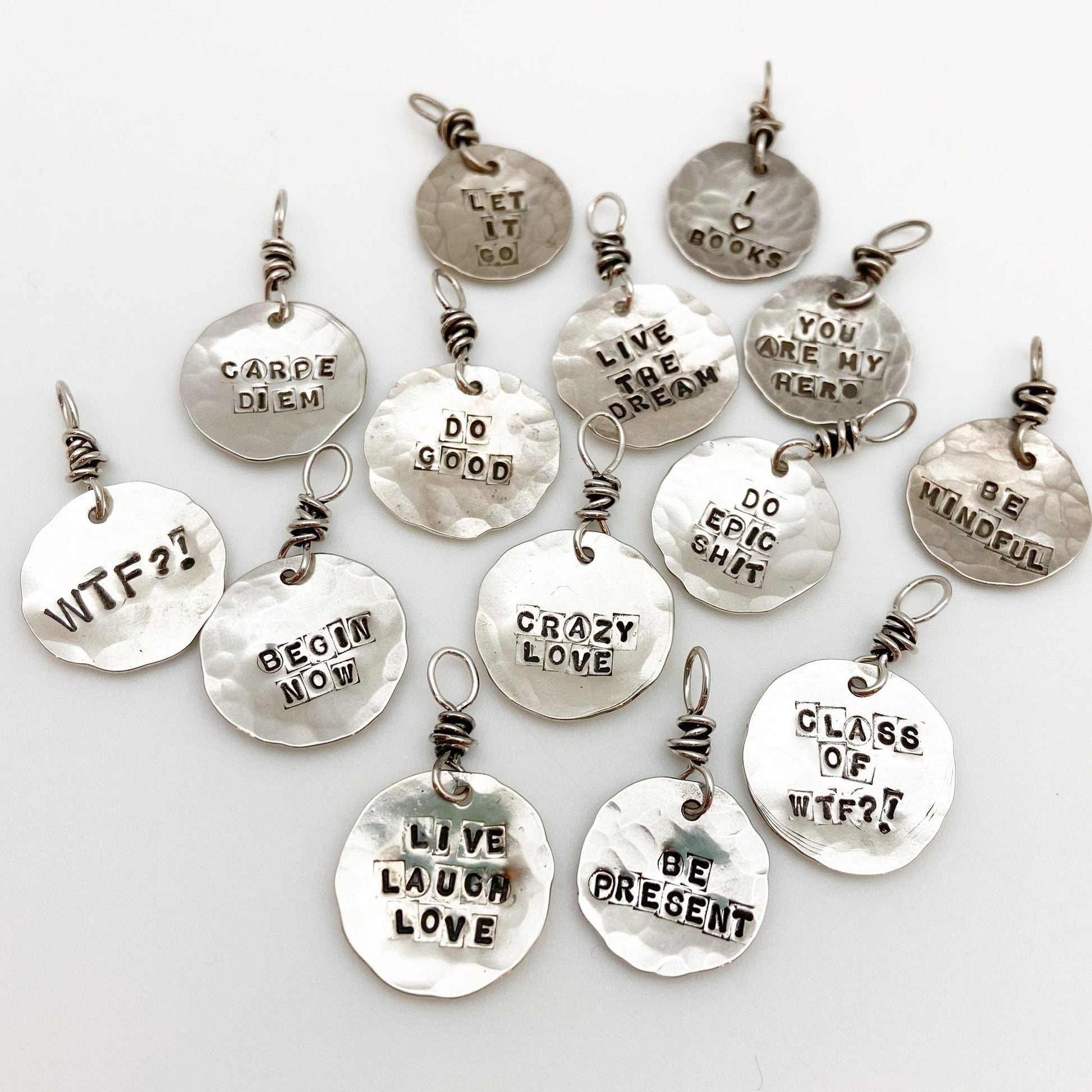 Handmade by a Kansas City artist. Sterling charms with inspiration. The artist named these "Wisdom Nuggets". These pieces are solid sterling, hand-cut discs that are hand-struck to give the surface texture and strengthen them. She even shapes then into a shallow bowl shape to help them hang nicely when the are added to necklaces, bracelets, and key rings. She hand stamps each individual letter. These are completely handmade, each piece will be slightly unique.