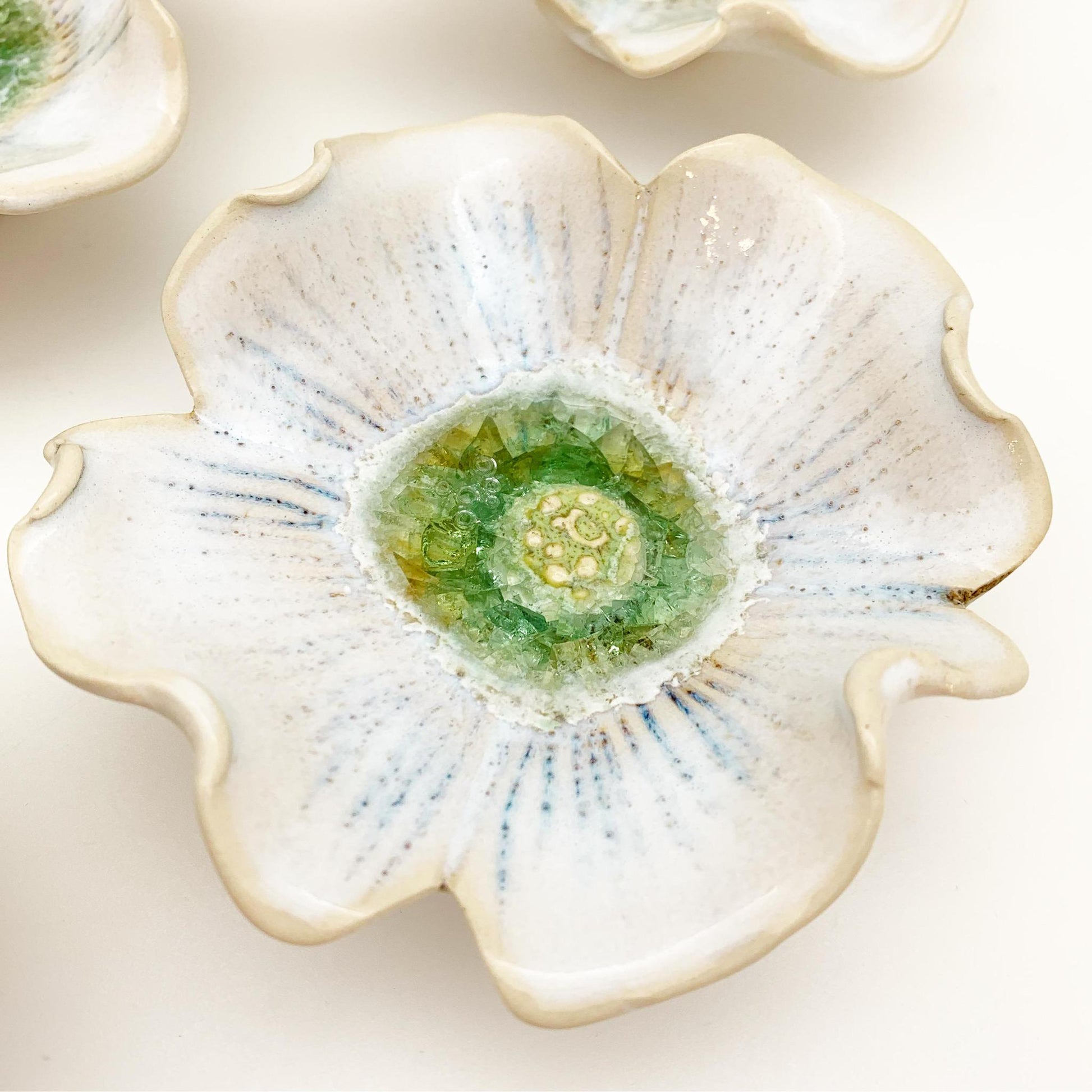 These pieces are individually handmade, kiln fired ceramic with fused glass. They are all one-of-a-kind. They are not molded/poured ceramics. They hang beautifully on the wall and can also sit on a table. The footed design allows the piece to sit or hang flat on most surfaces. Each piece is hand sculpted, carved, and glazed by the artist in her Kansas City studio. The center of the piece features glass frit (recycled glass powder) that creates the water-like center of the flower.