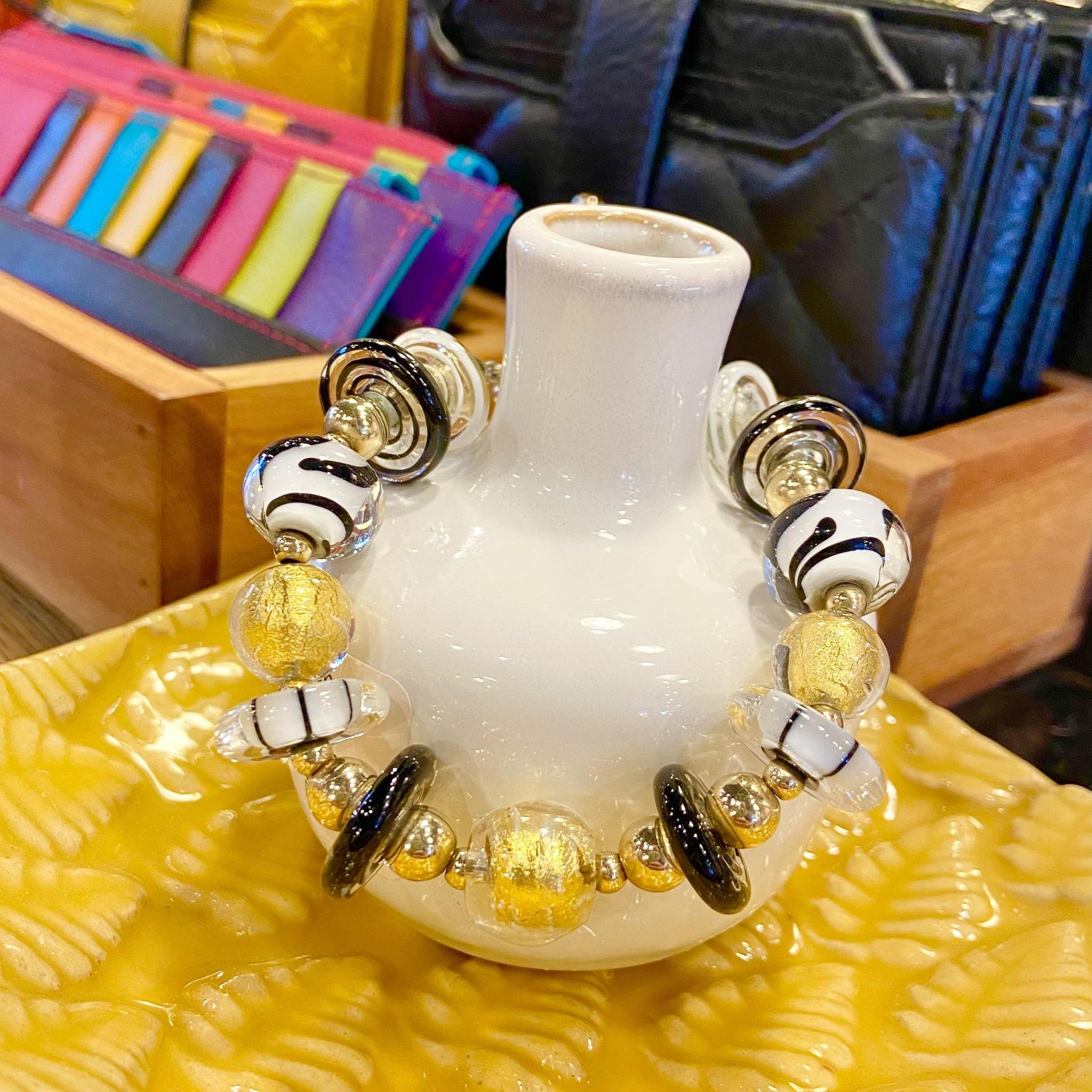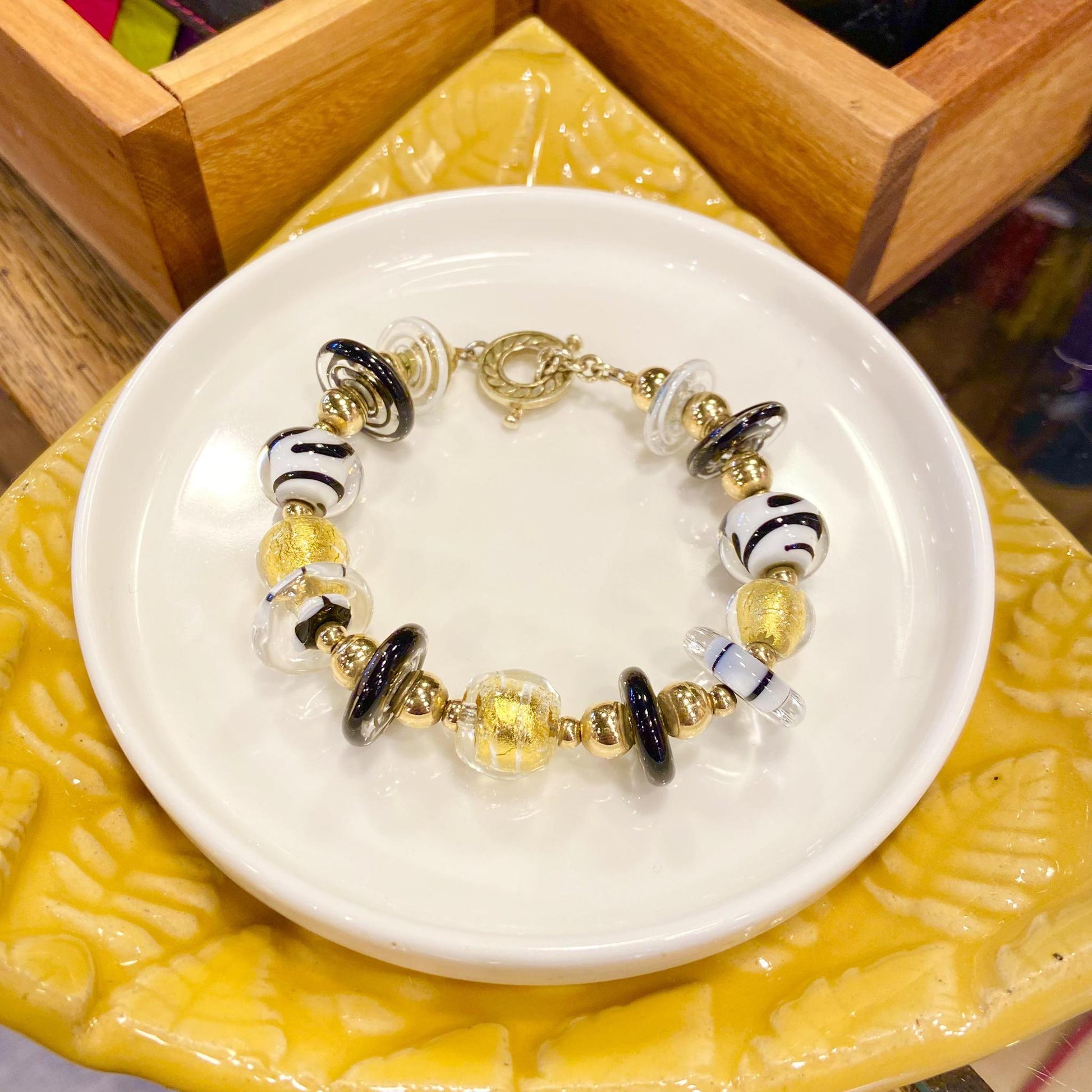Bracelet - Black & White & Gold Leaf - Glass Beads & Gold Plate