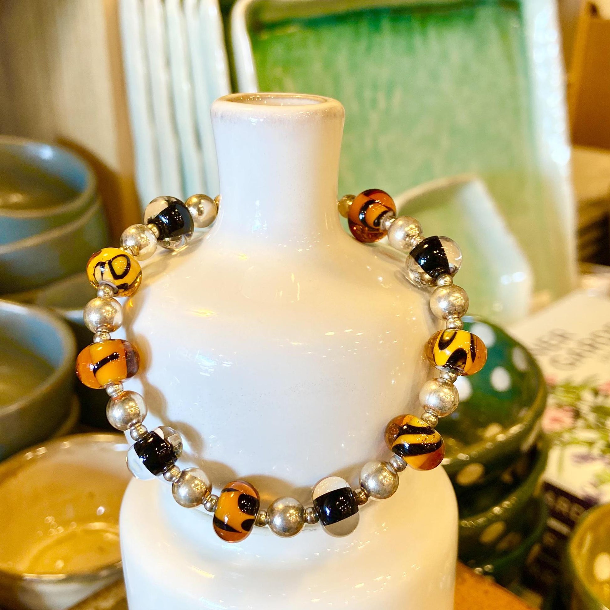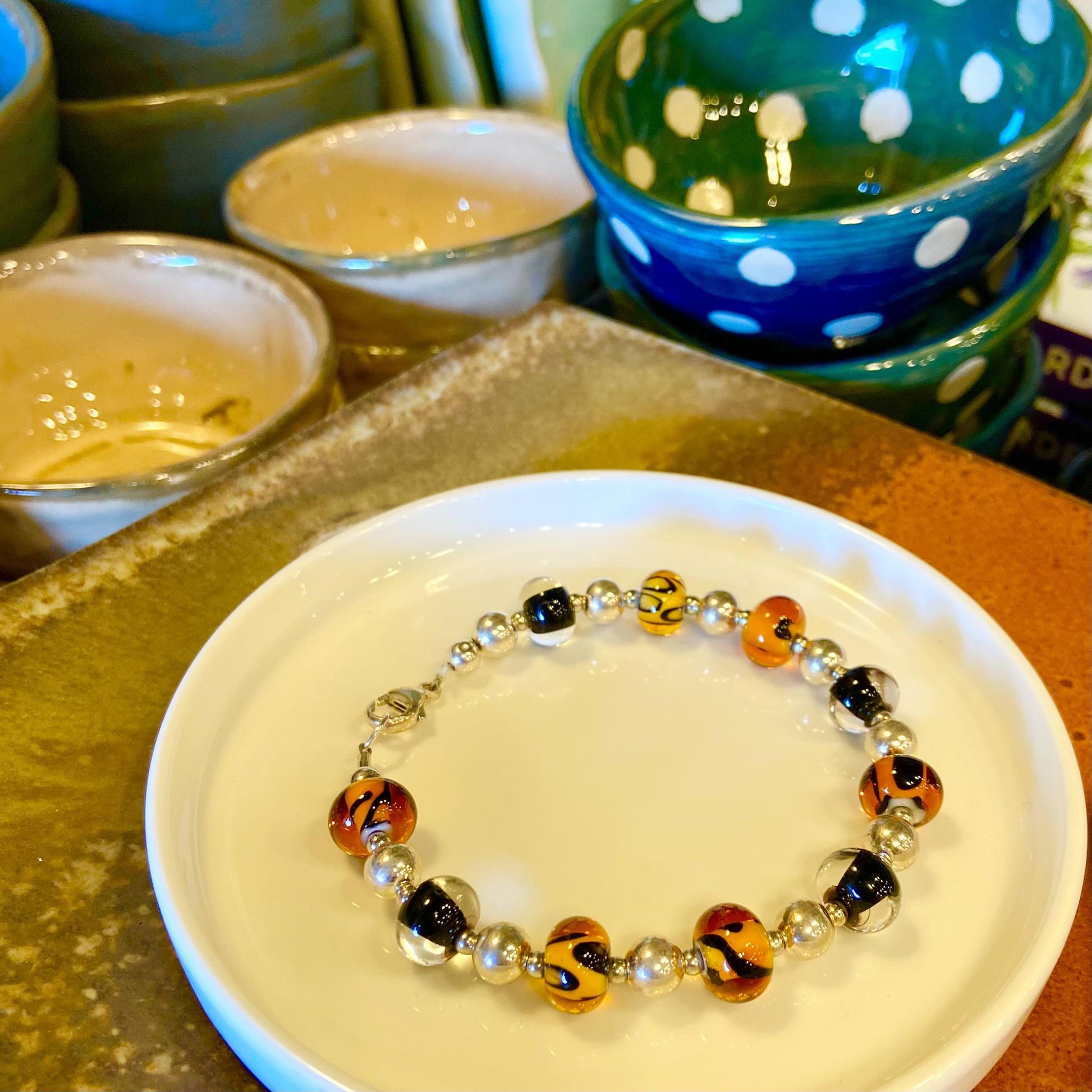 Handmade in Kansas City by an incredible glass bead artist. Each glass bead is handmade in our artist's home studio. She then combines her original beads with intricate sterling silver findings and clasps, creating a true one-of-a-kind bracelet.