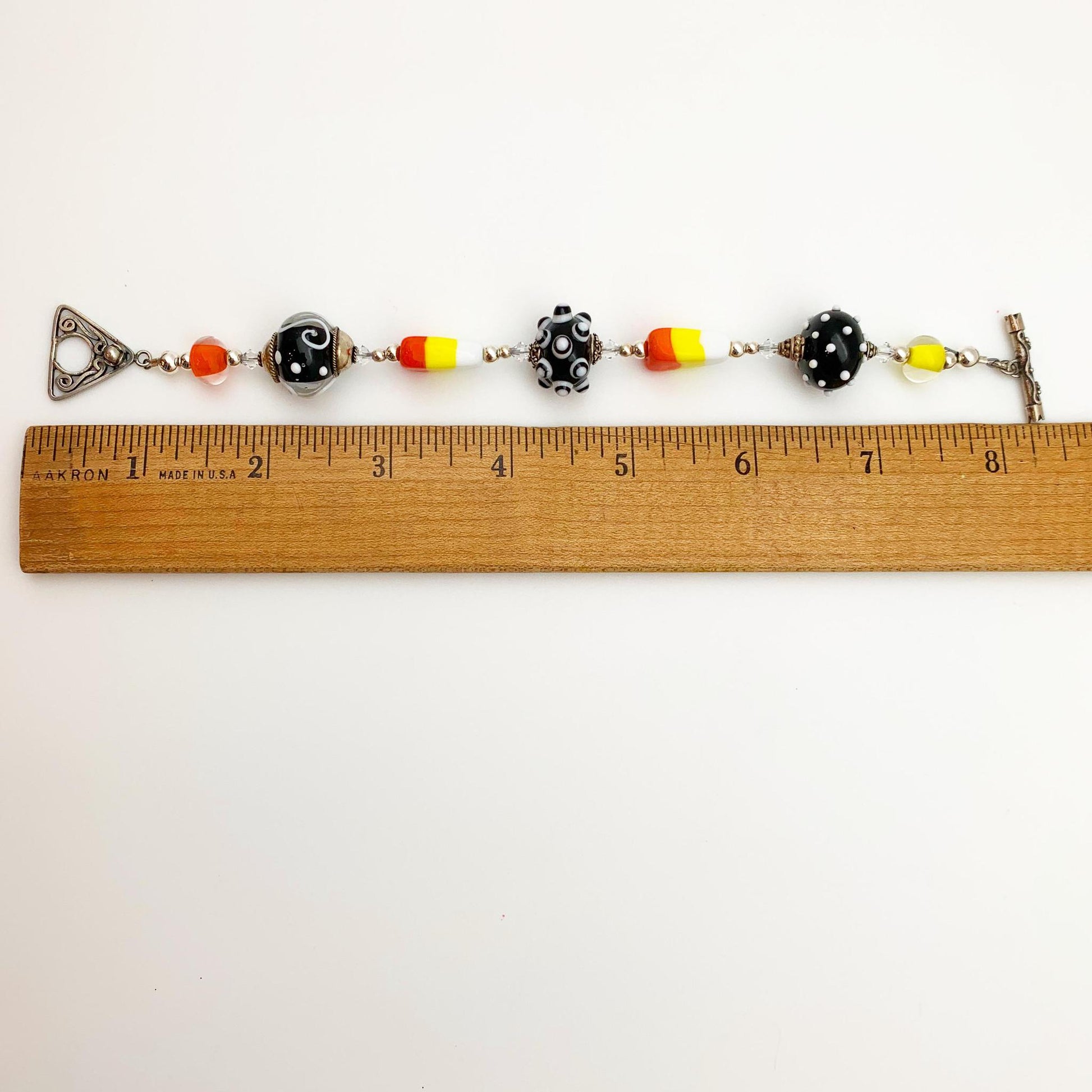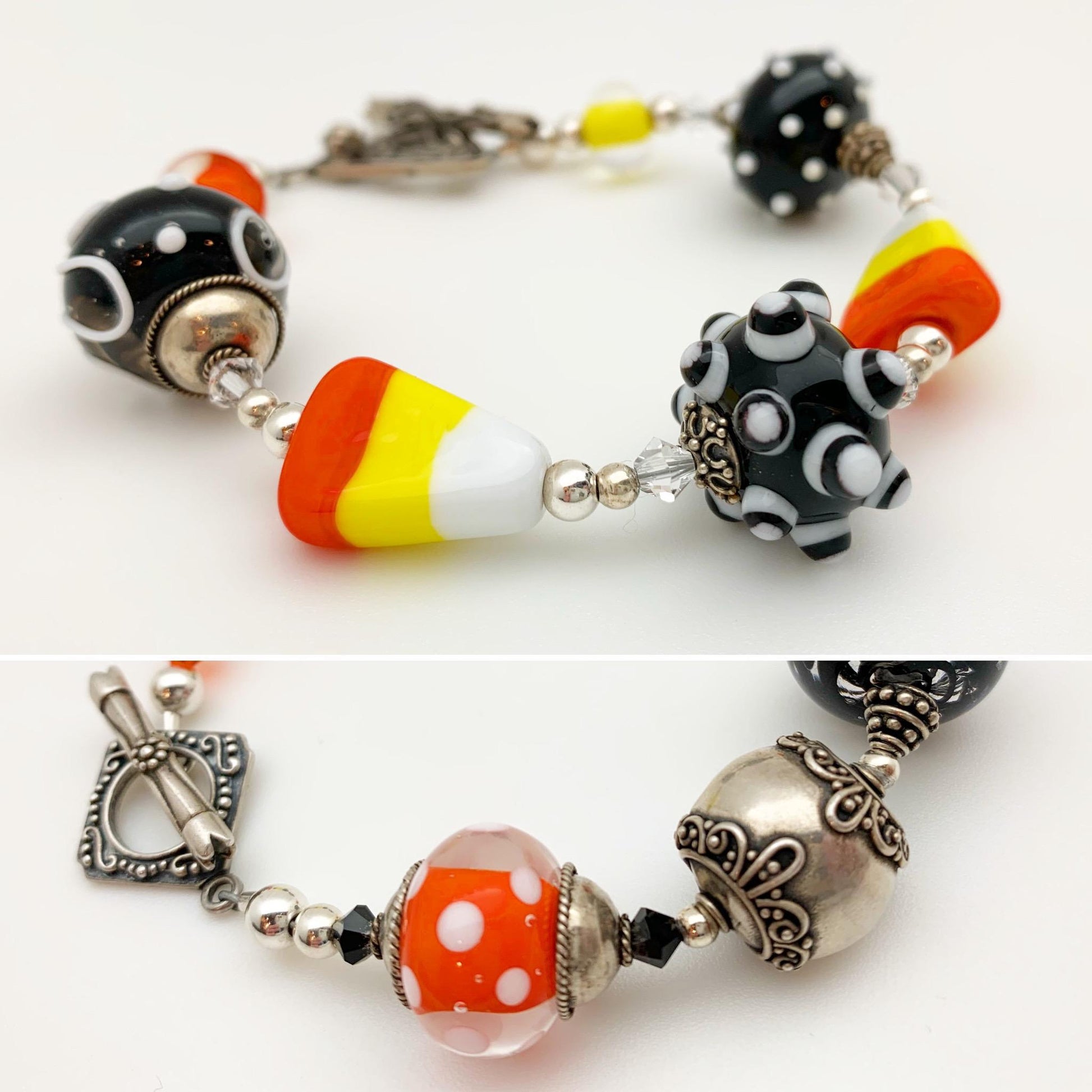 Handmade in Kansas City by an incredible glass bead artist. Each glass bead in handmade in our artist's home studio. She then combines her original beads with intricate sterling beads, creating a true one-of-a-kind bracelet. Sterling silver findings and clasp.