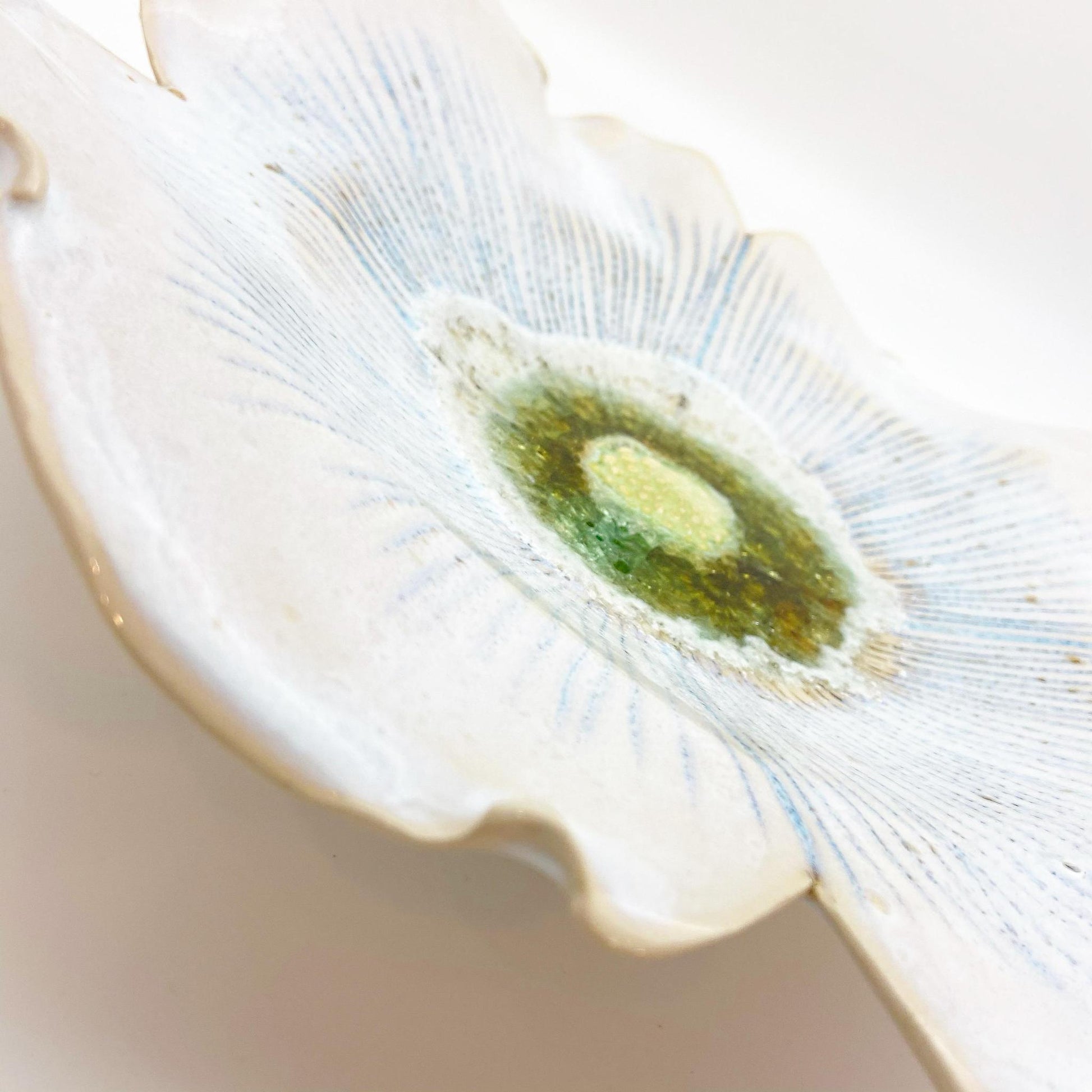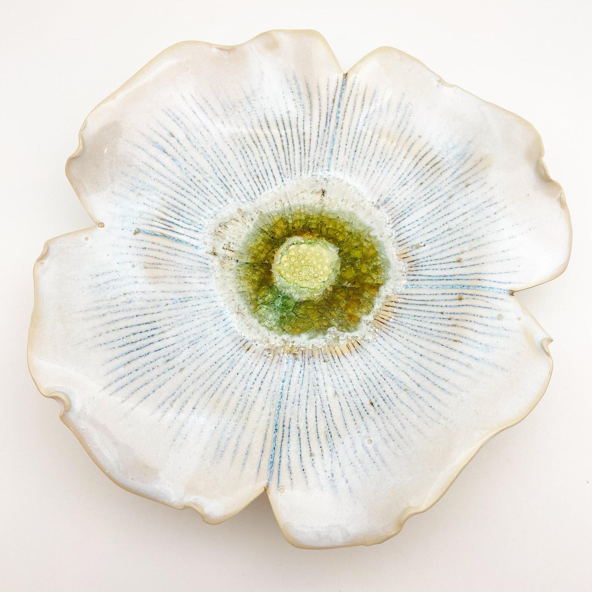 This ceramic sculpture is made by hand by an accomplished Kansas City artist. The hand-formed and carved dogwood flower has a slightly bowl-shaped design that enhances the gentle look of the petals. The artist hand forms and carves a footed disc to the back to allow it to hang or sit as a centerpiece on a table or riser. These one-of-a-kind works are all artist-made organic sculptures that celebrate the beauty of the natural world.