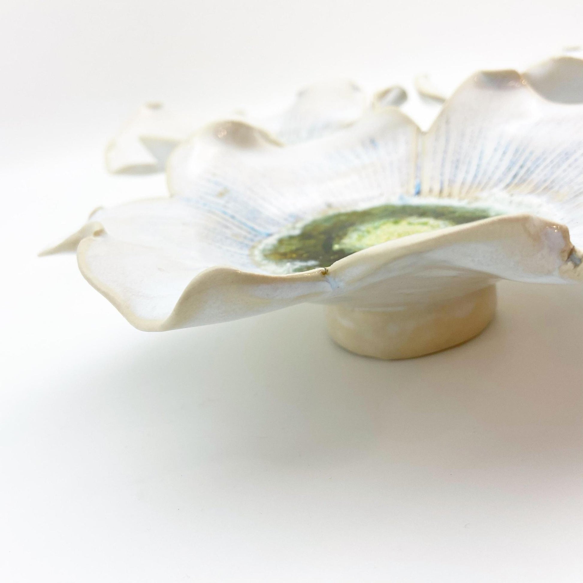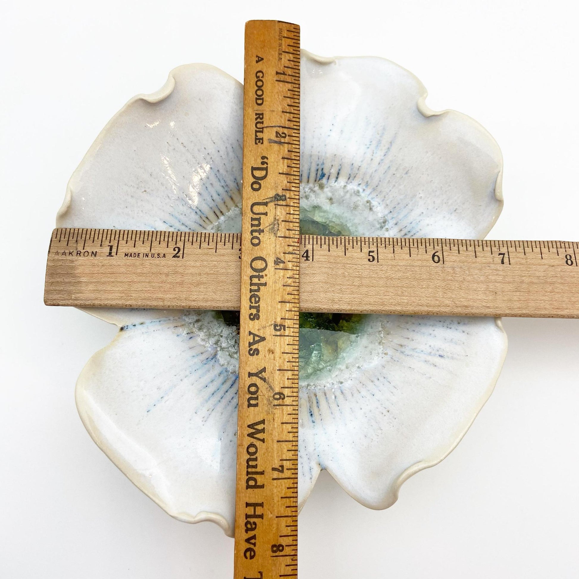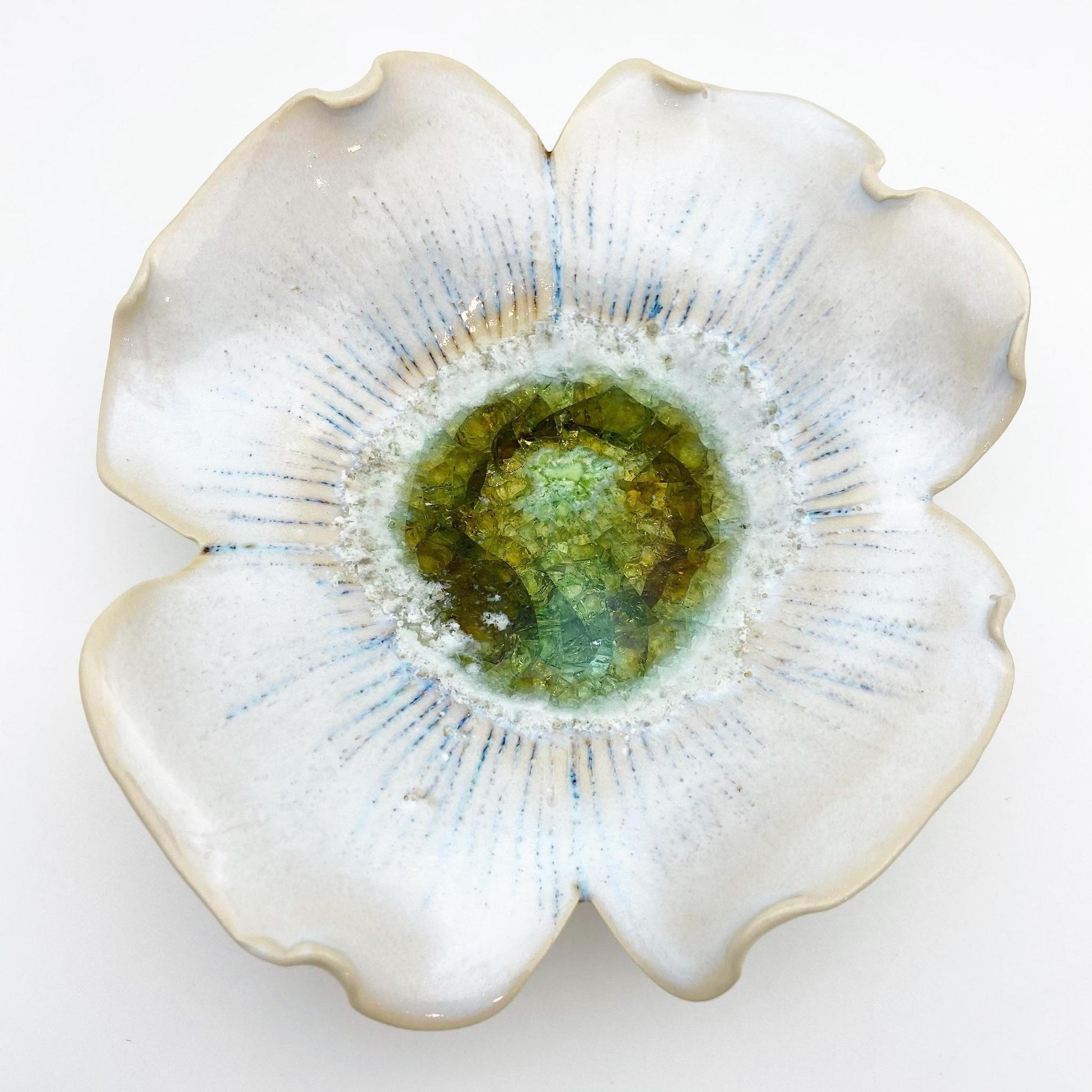 This ceramic sculpture is made by hand by an accomplished Kansas City artist. The hand-formed and carved dogwood flower has a slightly bowl-shaped design that enhances the gentle look of the petals. The artist hand forms and carves a footed disc to the back to allow it to hang or sit as a centerpiece on a table or riser. The center of the piece features glass frit (recycled glass powder) that creates the water-like center of the flower.