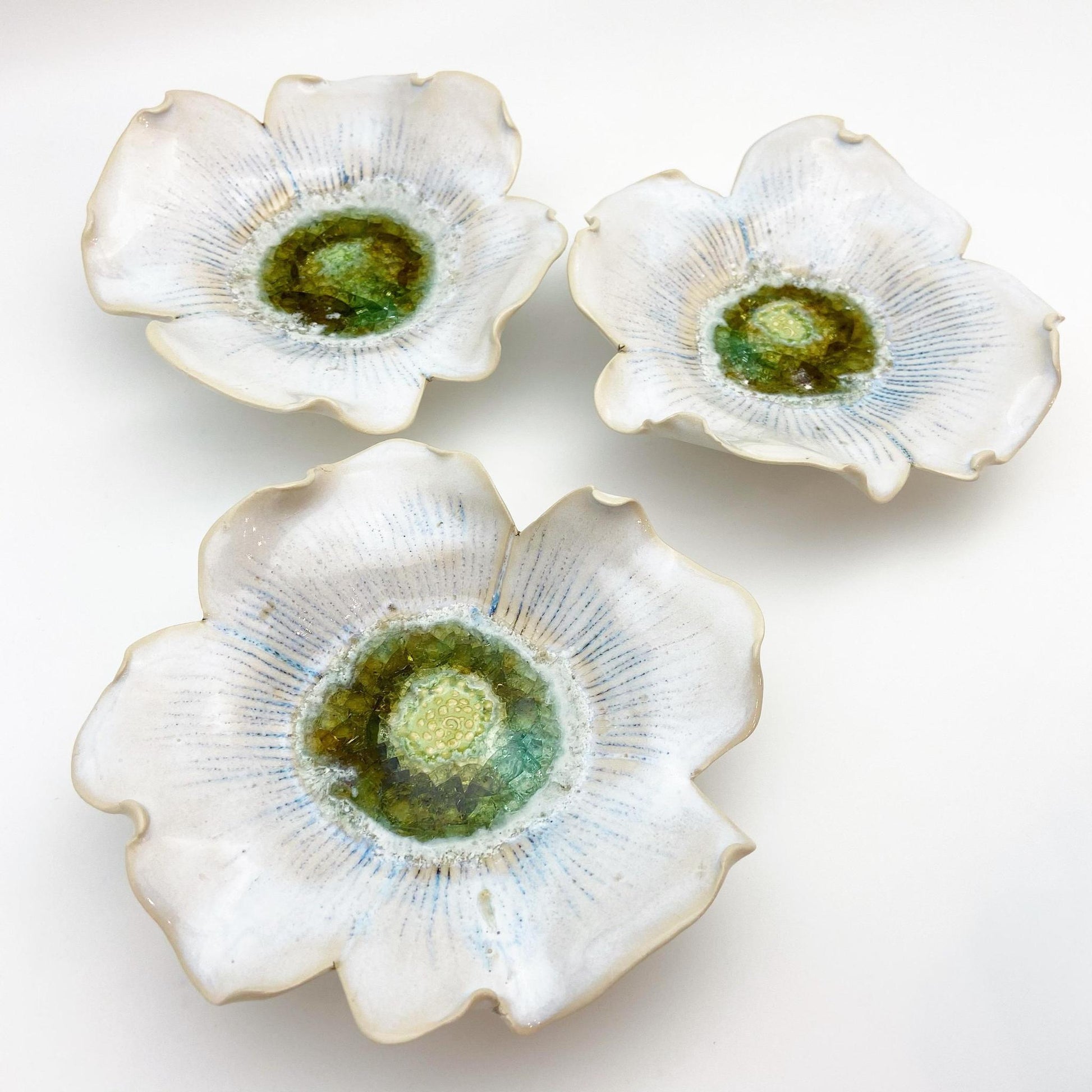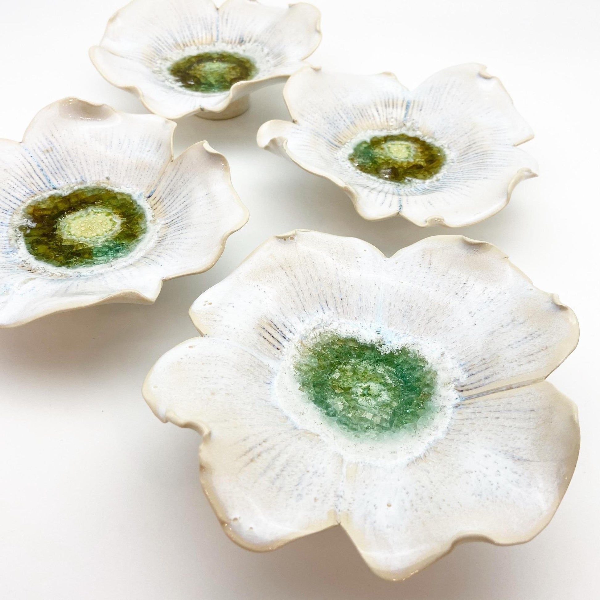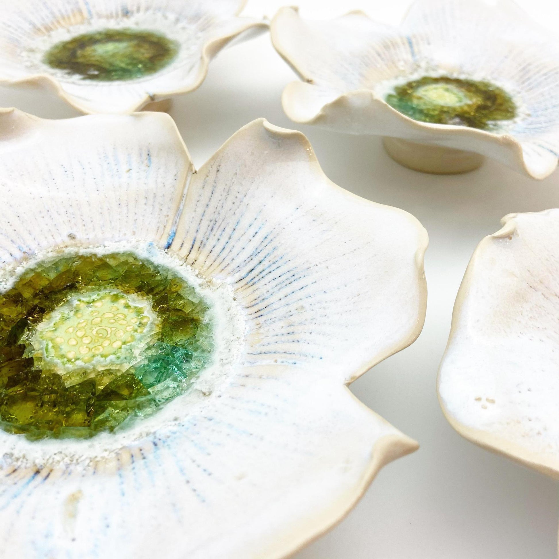 This ceramic sculpture is made by hand by an accomplished Kansas City artist. The hand-formed and carved dogwood flower has a slightly bowl-shaped design that enhances the gentle look of the petals. The artist hand forms and carves a footed disc to the back to allow it to hang or sit as a centerpiece on a table or riser. The center of the piece features glass frit (recycled glass powder) that creates the water-like center of the flower.