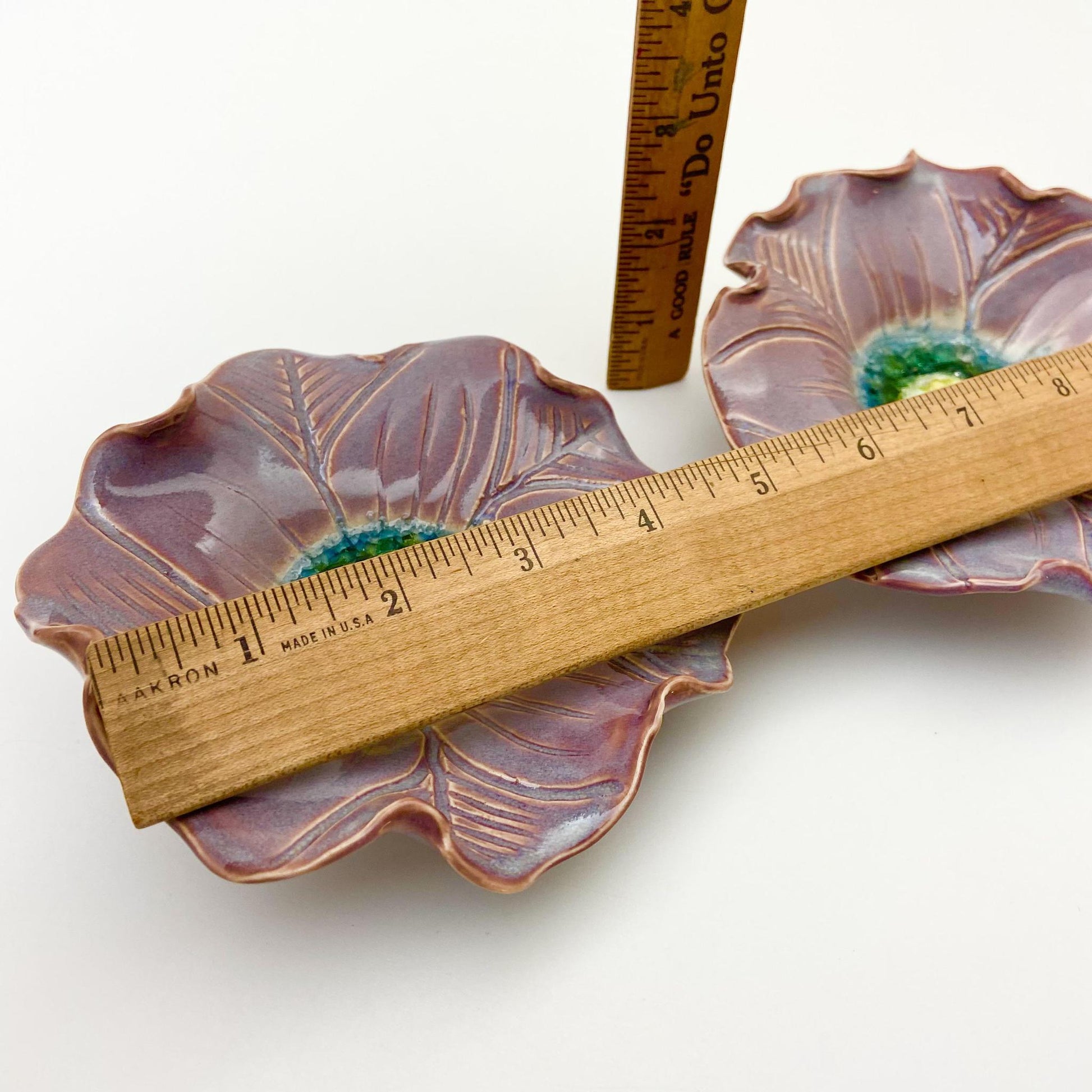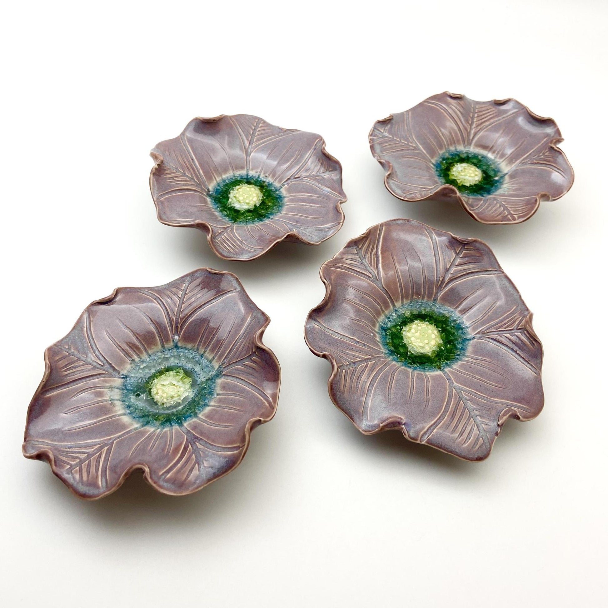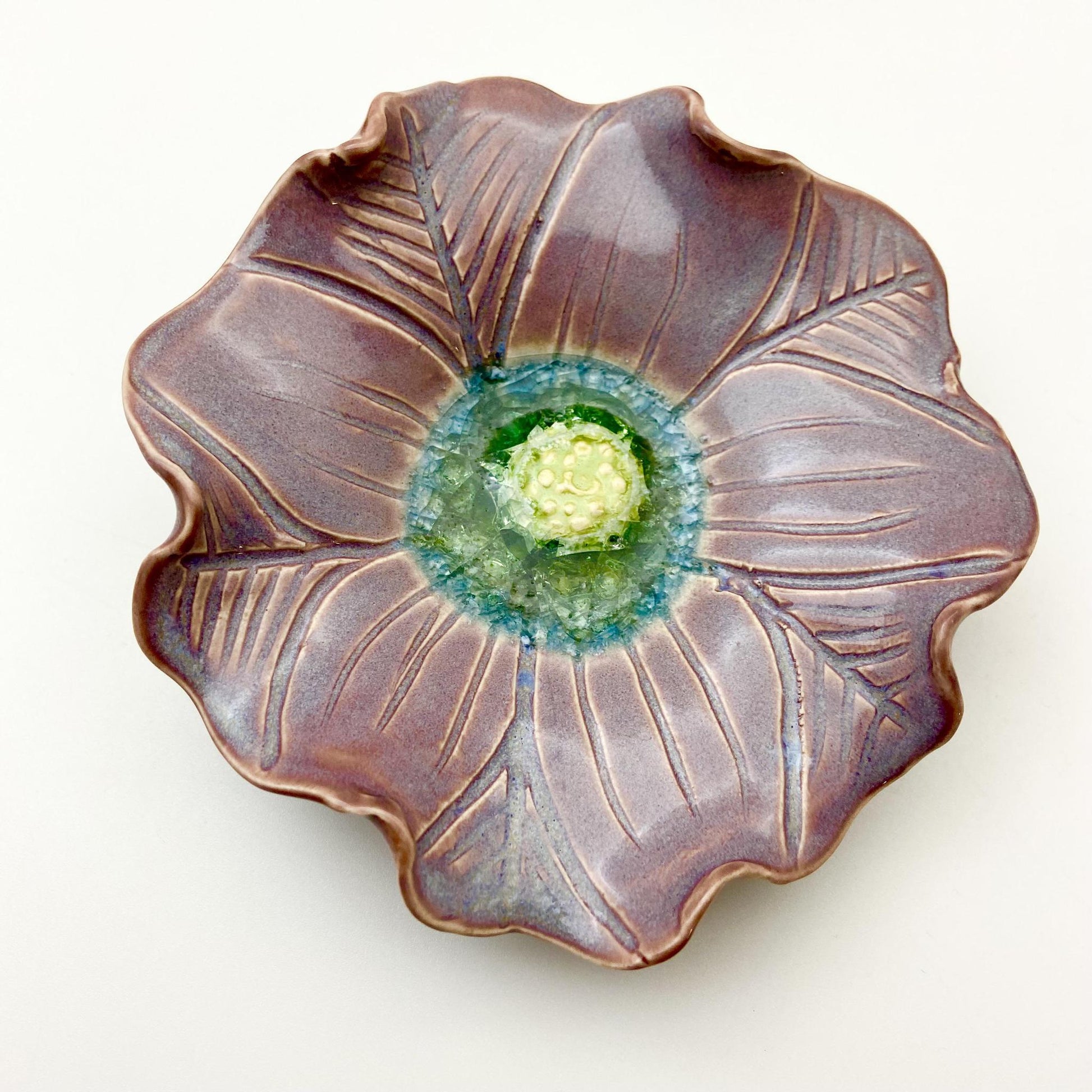 These pieces are individually handmade, kiln fired ceramic with fused glass. They are all one-of-a-kind. They are not molded/poured ceramics. They hang beautifully on the wall and can also sit on a table. The footed design allows the piece to sit or hang flat on most surfaces. Each piece is hand sculpted, carved, and glazed by the artist in her Kansas City studio. The center of the piece features glass frit (recycled glass powder) that creates the water-like center of the flower.