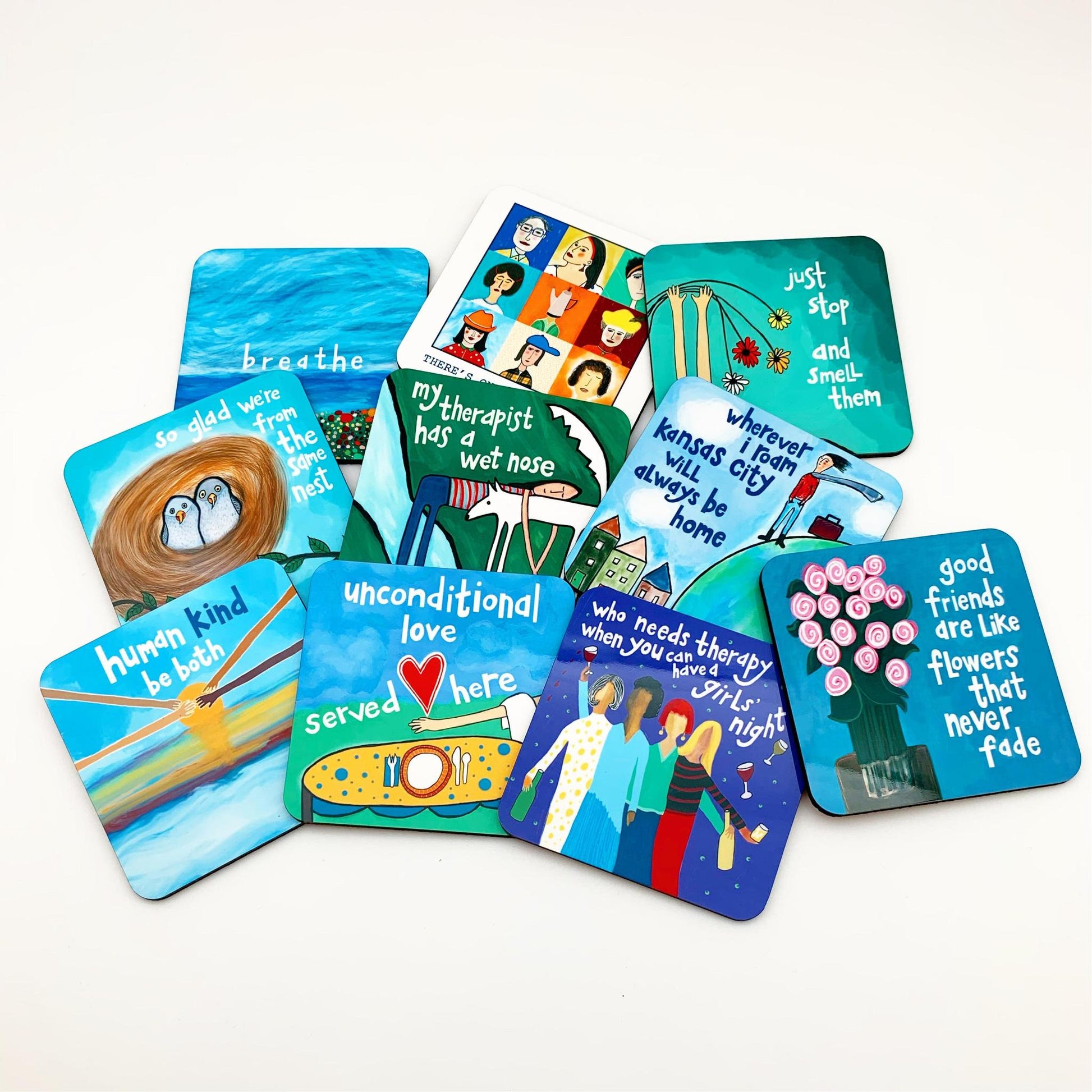 Each little piece of art is a 4" x 4" cork-backed coaster. The drawings are permanently adhered to the hardboard surface through a process of heat sublimation. The glossy surface is very durable, the colors are deeply saturated, and the messages are positive -- sometimes irreverent -- but always fun! Each is an original artwork created by the artist.