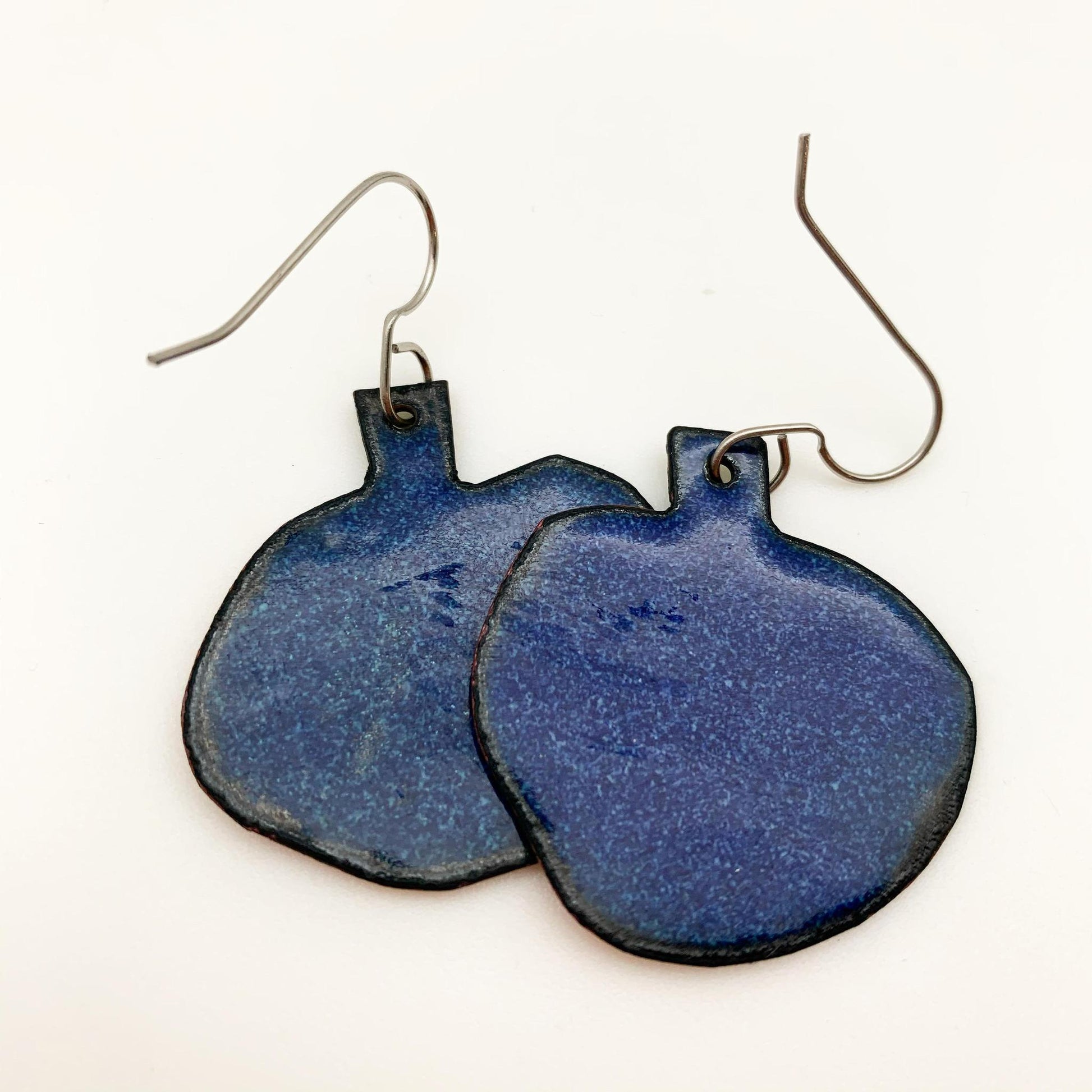 Our collection of enamel-on-copper earrings is playful, beautiful, and unexpected. This New Mexico artist is quite accomplished. Enameling takes creativity, detail, and focus. We believe our pieces have an attention to detail and finish quality you don't always find with enamel work. Additionally, all of her pieces are enamel-finished on the back. (This eliminates patina marks on your skin, creates a more polished look, and reduces corrosion.)