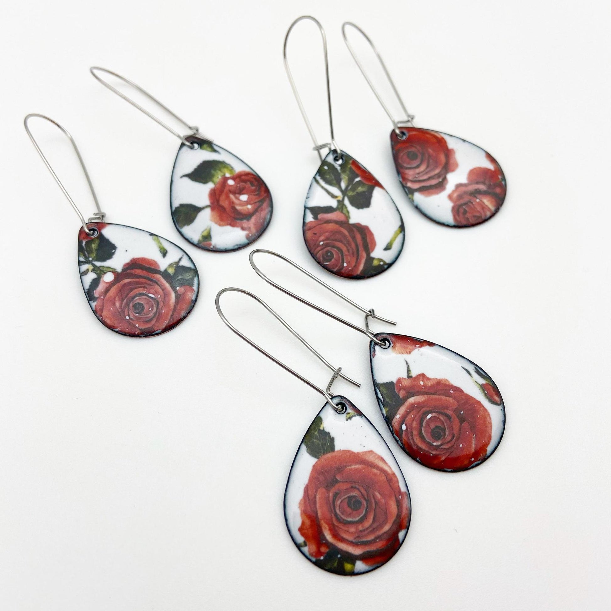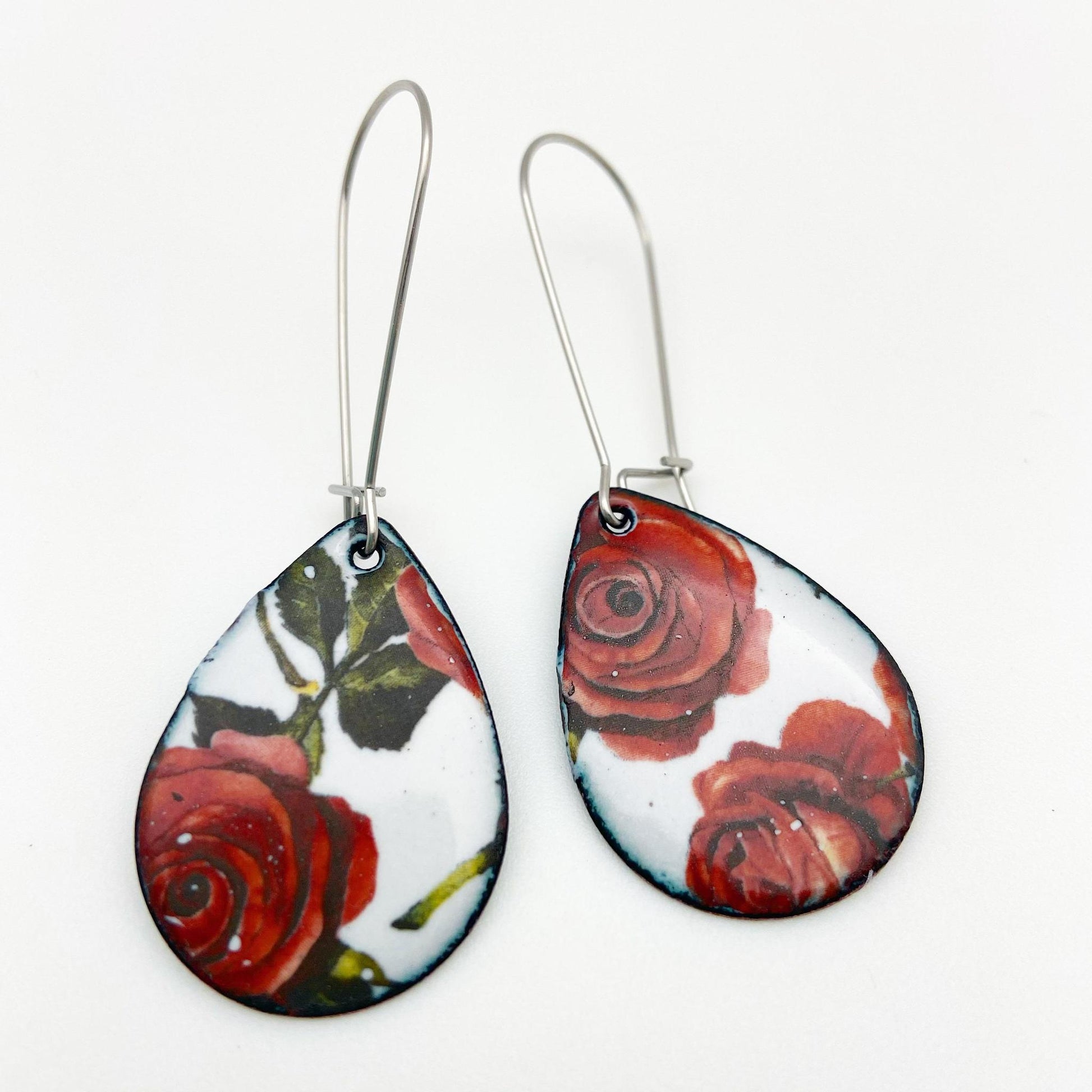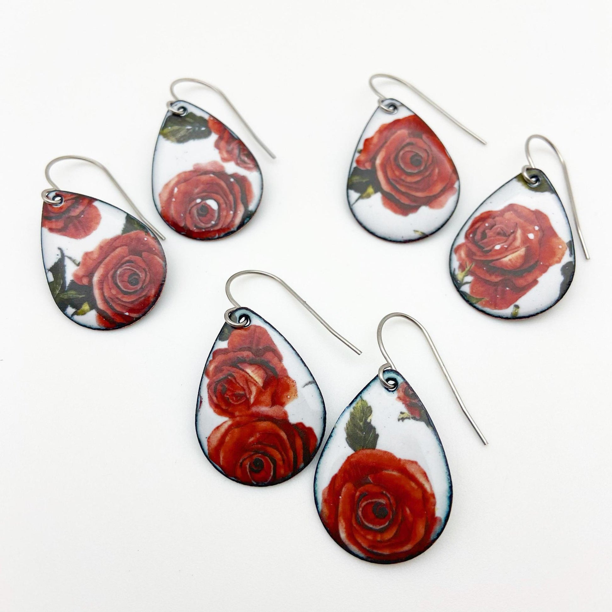 Our collection of enamel-on-copper earrings is playful, beautiful, and unexpected. This New Mexico artist is quite accomplished. Enameling takes creativity, detail, and focus. We believe our pieces have an attention to detail and finish quality you don't always find with enamel work. Additionally, all of her pieces are enamel-finished on the back. (This eliminates patina marks on your skin, creates a more polished look, and reduces corrosion.)