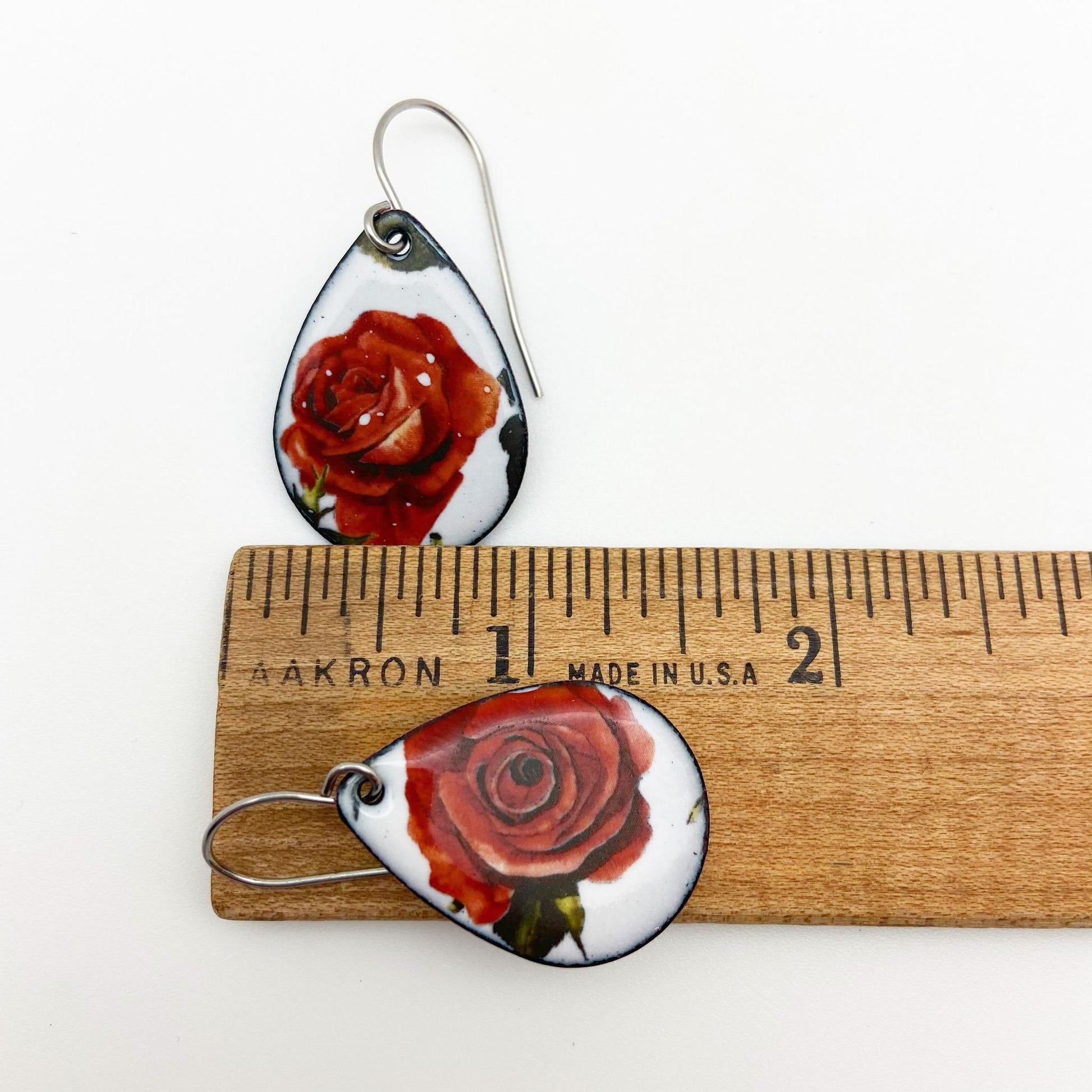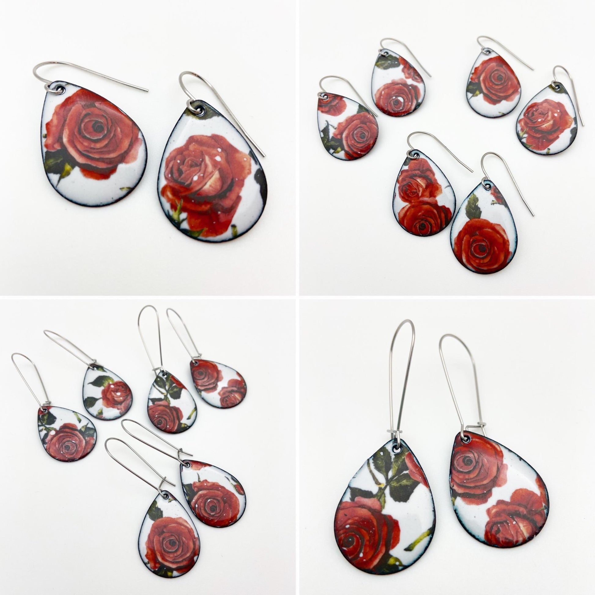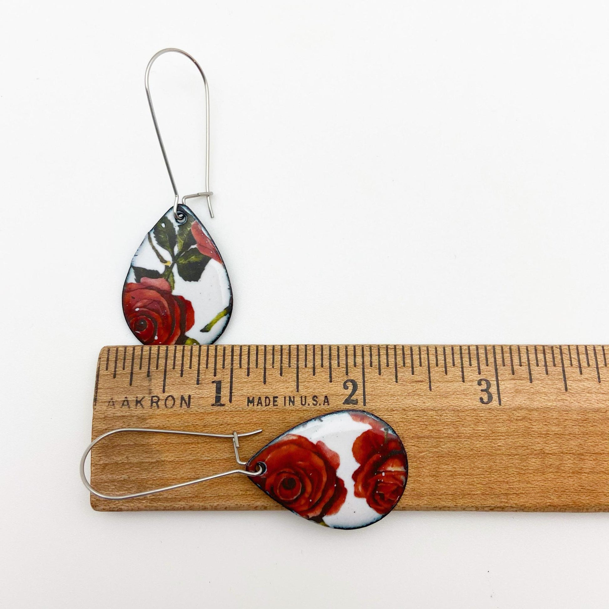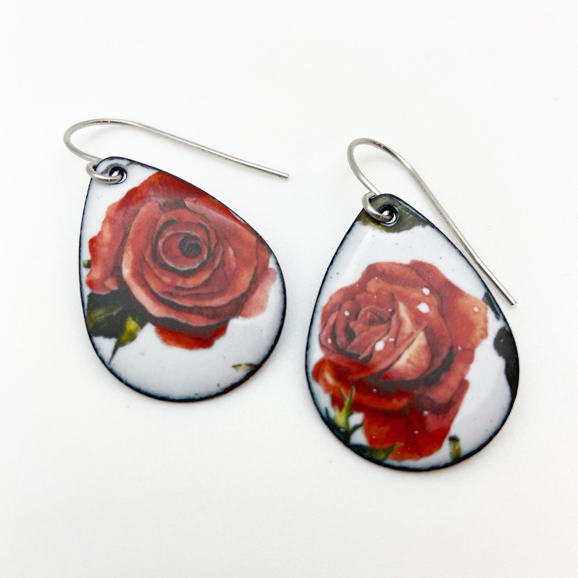 Our collection of enamel-on-copper earrings is playful, beautiful, and unexpected. This New Mexico artist is quite accomplished. Enameling takes creativity, detail, and focus. We believe our pieces have an attention to detail and finish quality you don't always find with enamel work. Additionally, all of her pieces are enamel-finished on the back. (This eliminates patina marks on your skin, creates a more polished look, and reduces corrosion.)
