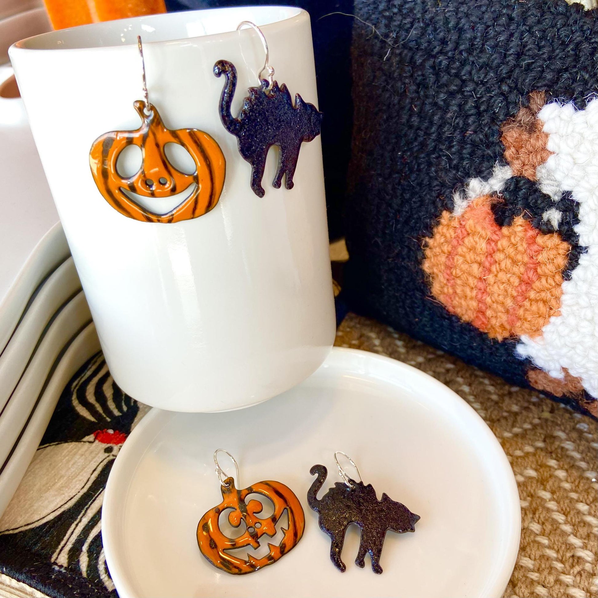 Earrings - Glitter Cat & Pumpkin - Enamel on Copper