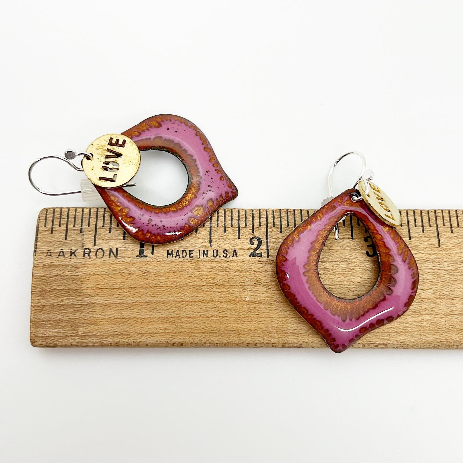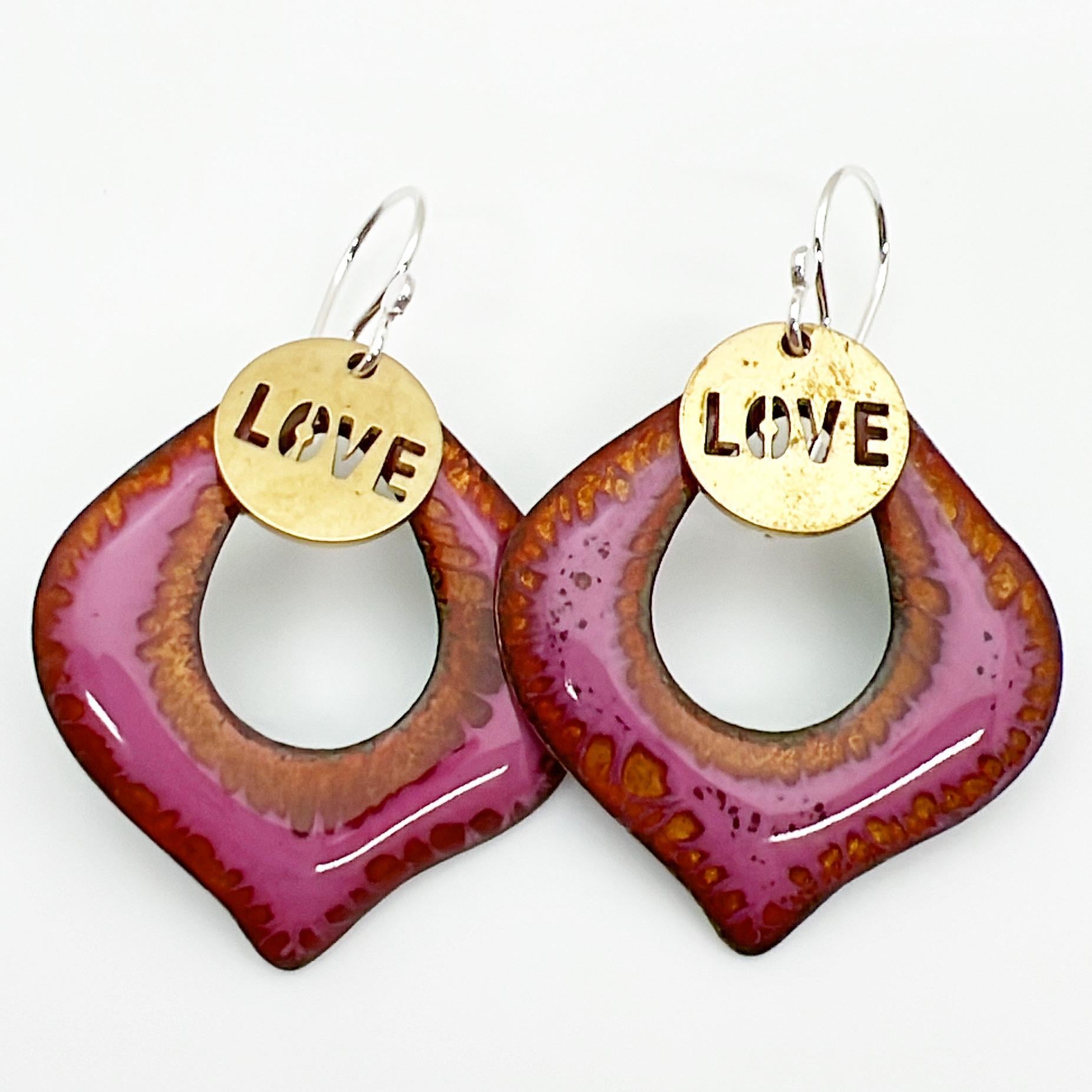 Earrings - Magenta Center-Cut Curved Diamonds - Brass "LOVE" Tag - Enamel on Copper