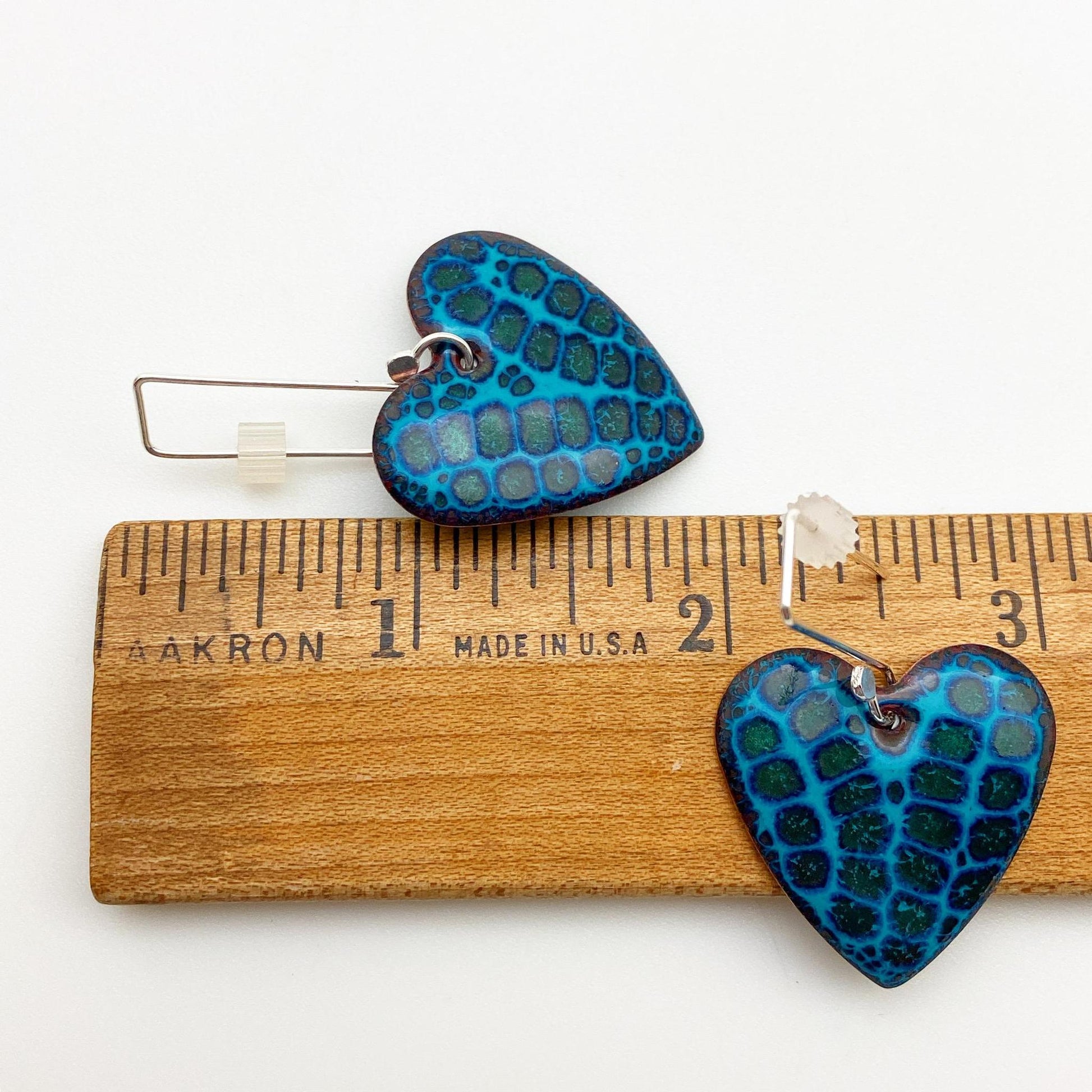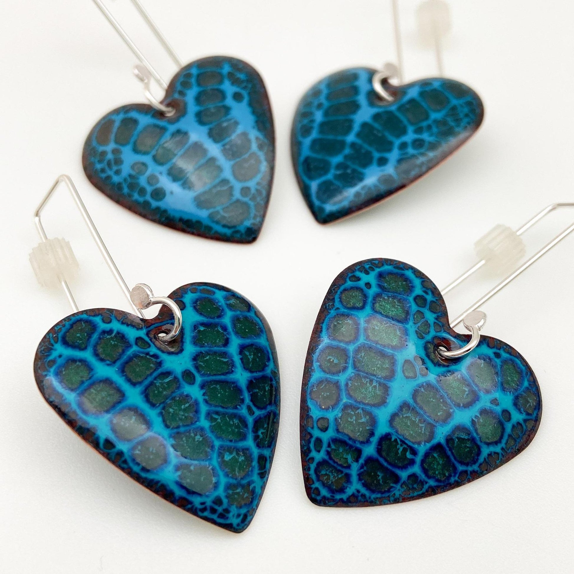 Earrings - Navy Print on Turquoise Hearts - Enamel on Copper