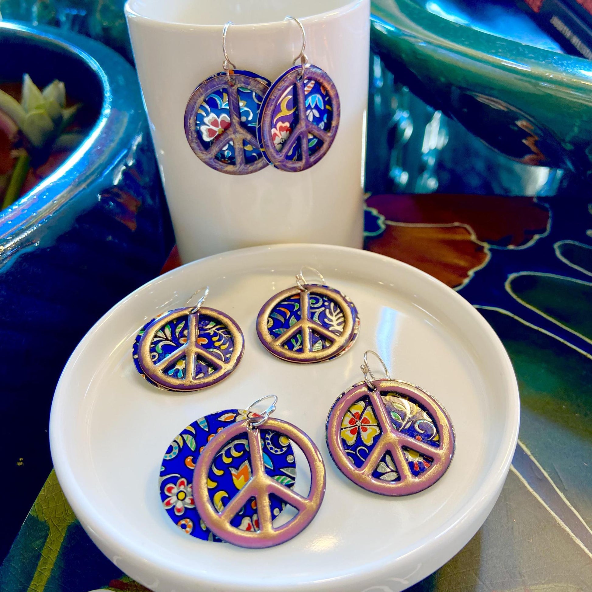 Earrings - Peace Signs on Blue Floral - Enamel on Copper