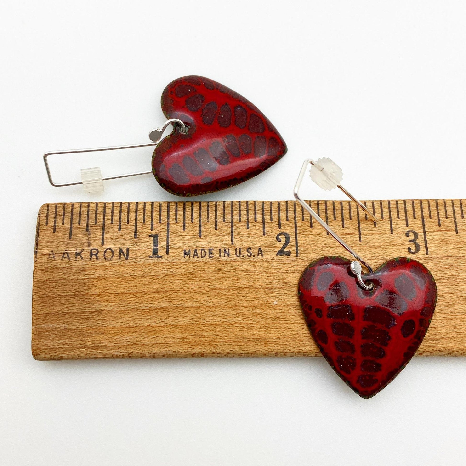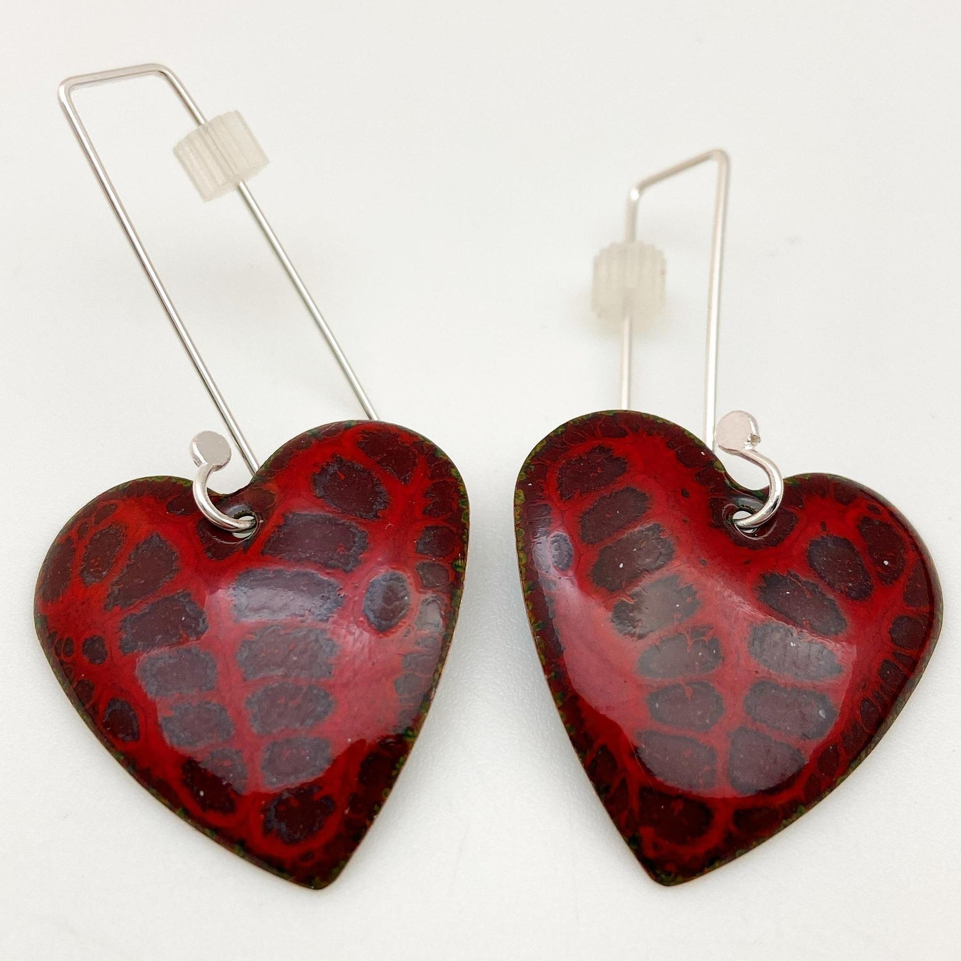 Earrings - Purple Print on Red Hearts - Enamel on Copper