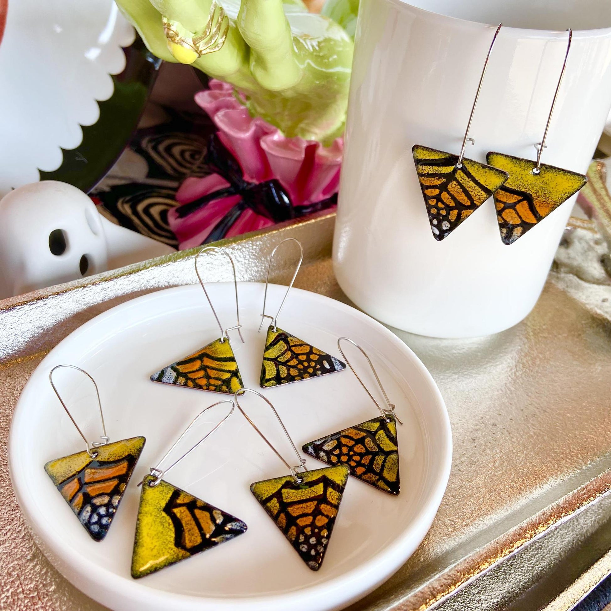 Our collection of enamel-on-copper earrings is playful, beautiful, and unexpected. This New Mexico artist is quite accomplished. Enameling takes creativity, detail, and focus. We believe our pieces have an attention to detail and finish quality you don't always find with enamel work. Additionally, all of her pieces are enamel-finished on the back. (This eliminates patina marks on your skin, creates a more polished look, and reduces corrosion.)