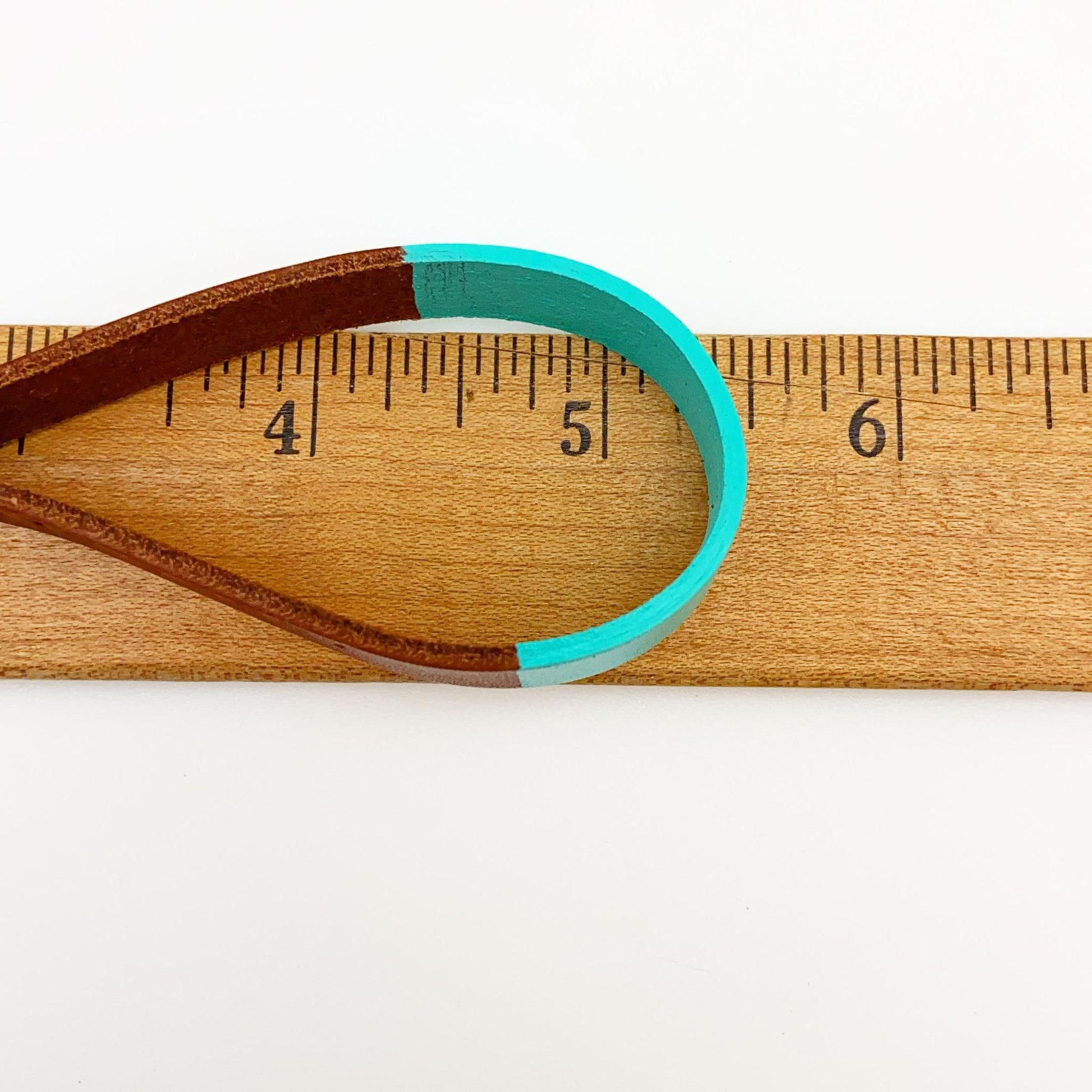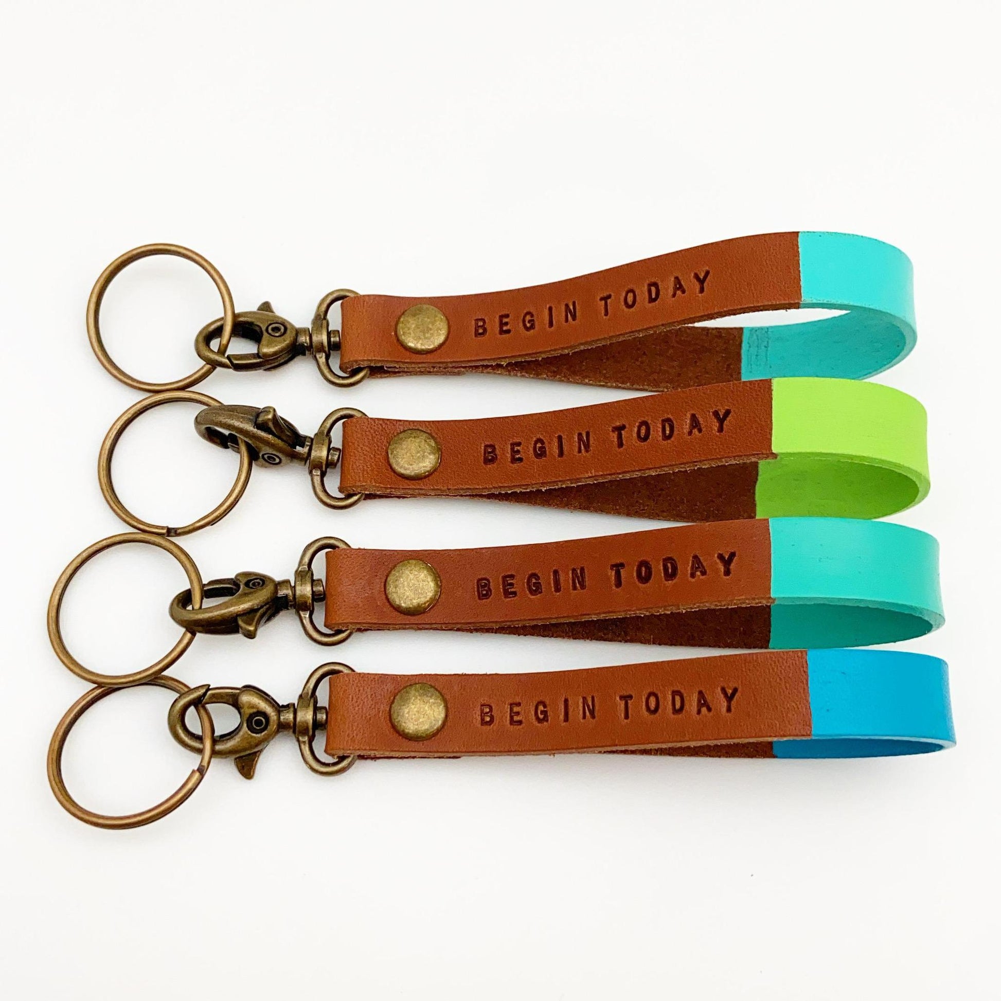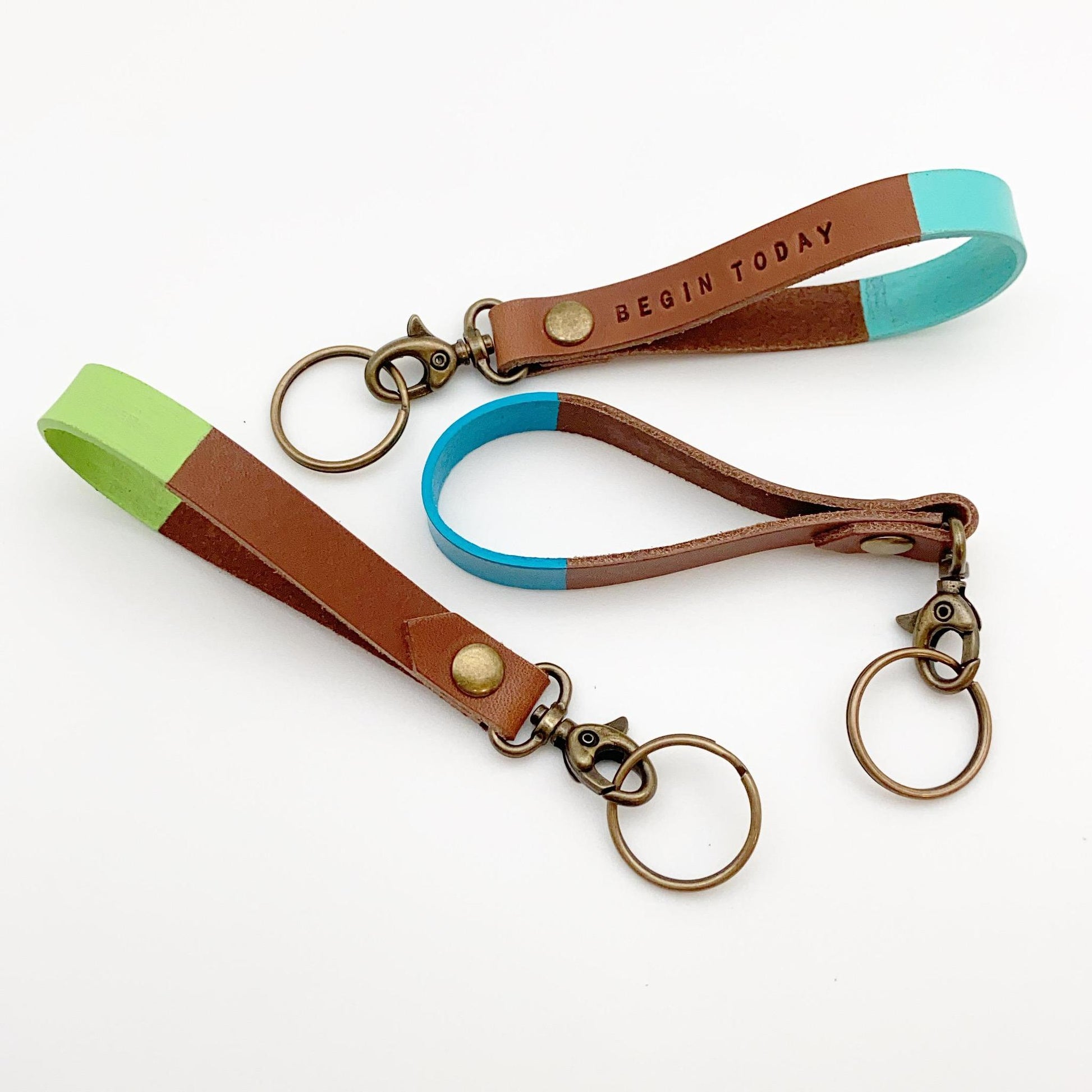 This keychain is made from natural tanned leather and then hand painted with color. Vegetable-tanned leather makes this keychain strong and sturdy. The loop of leather is hand-painted with artisan leather paint to give a bright and colorful touch. The keychain is fitted with an oversized lobster clasp and a keyring on the end. Hardware is antiqued brass.