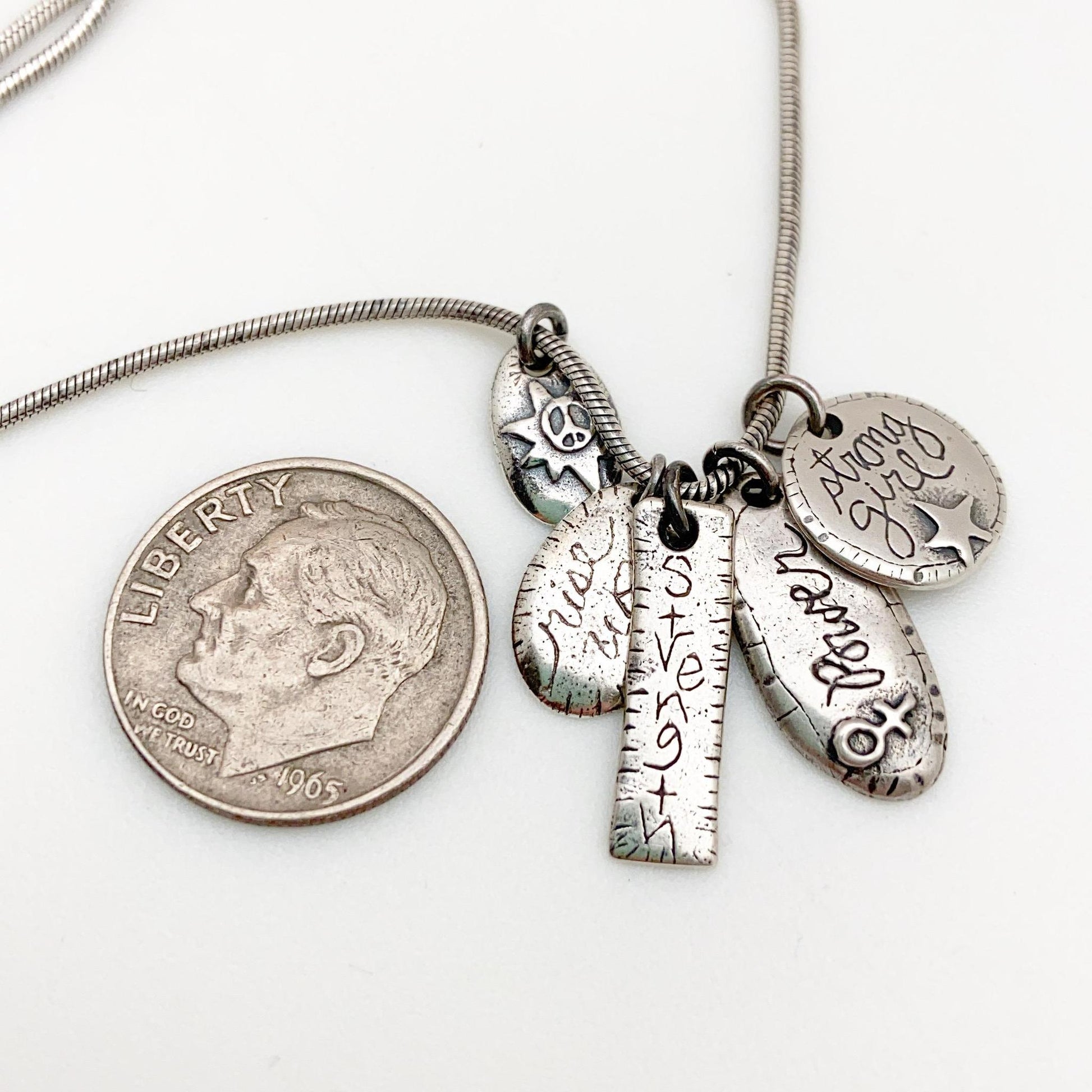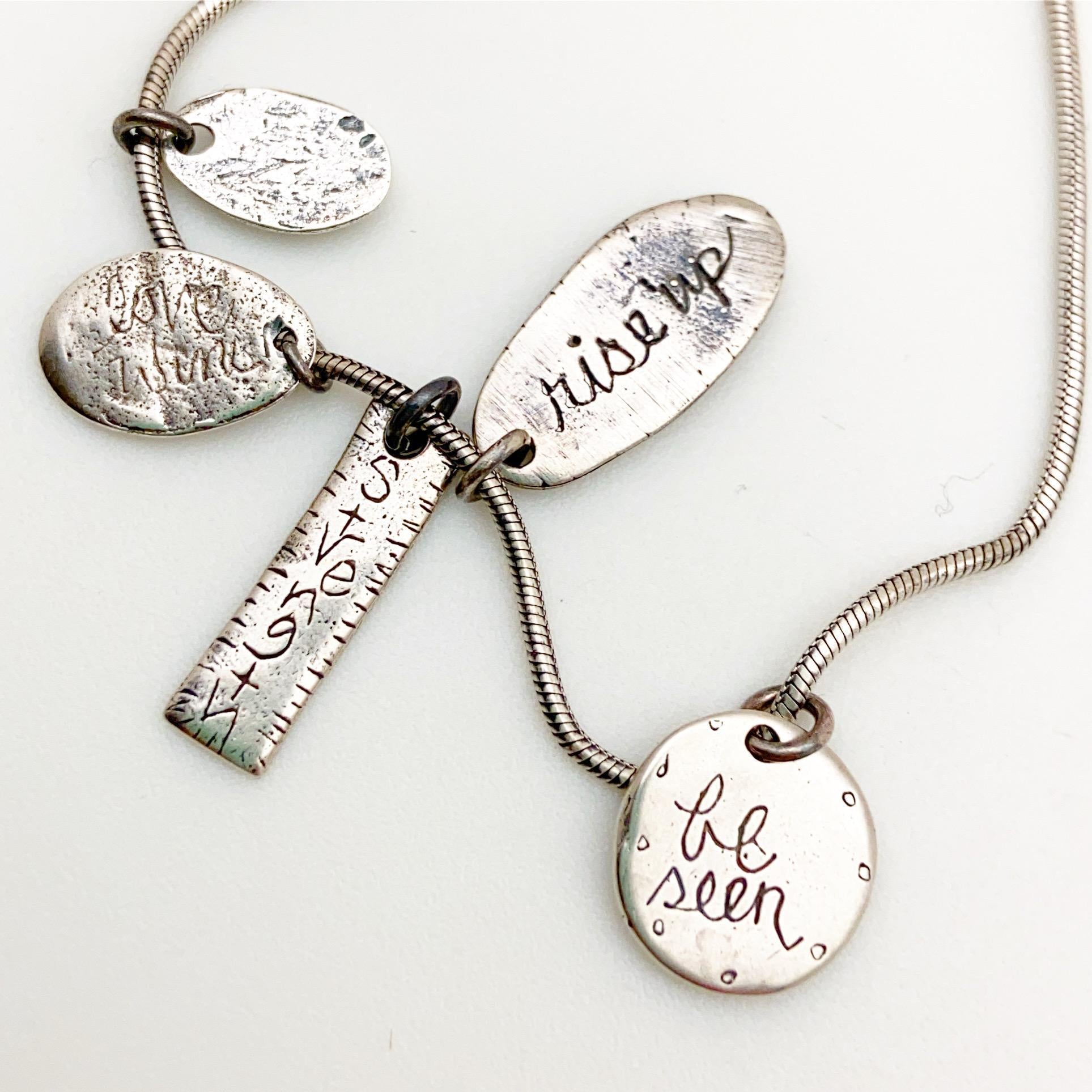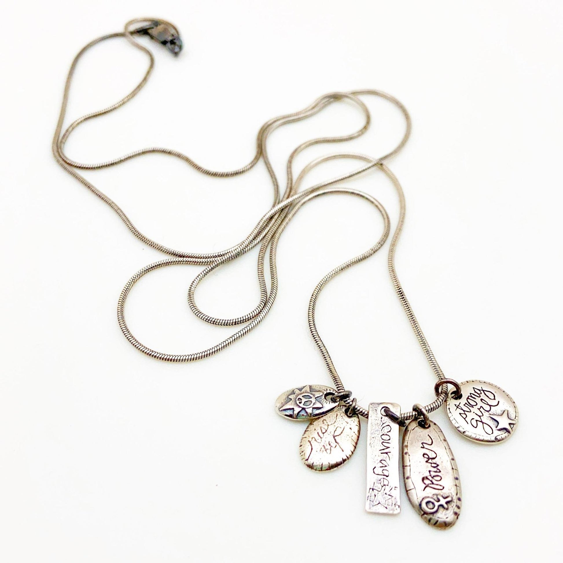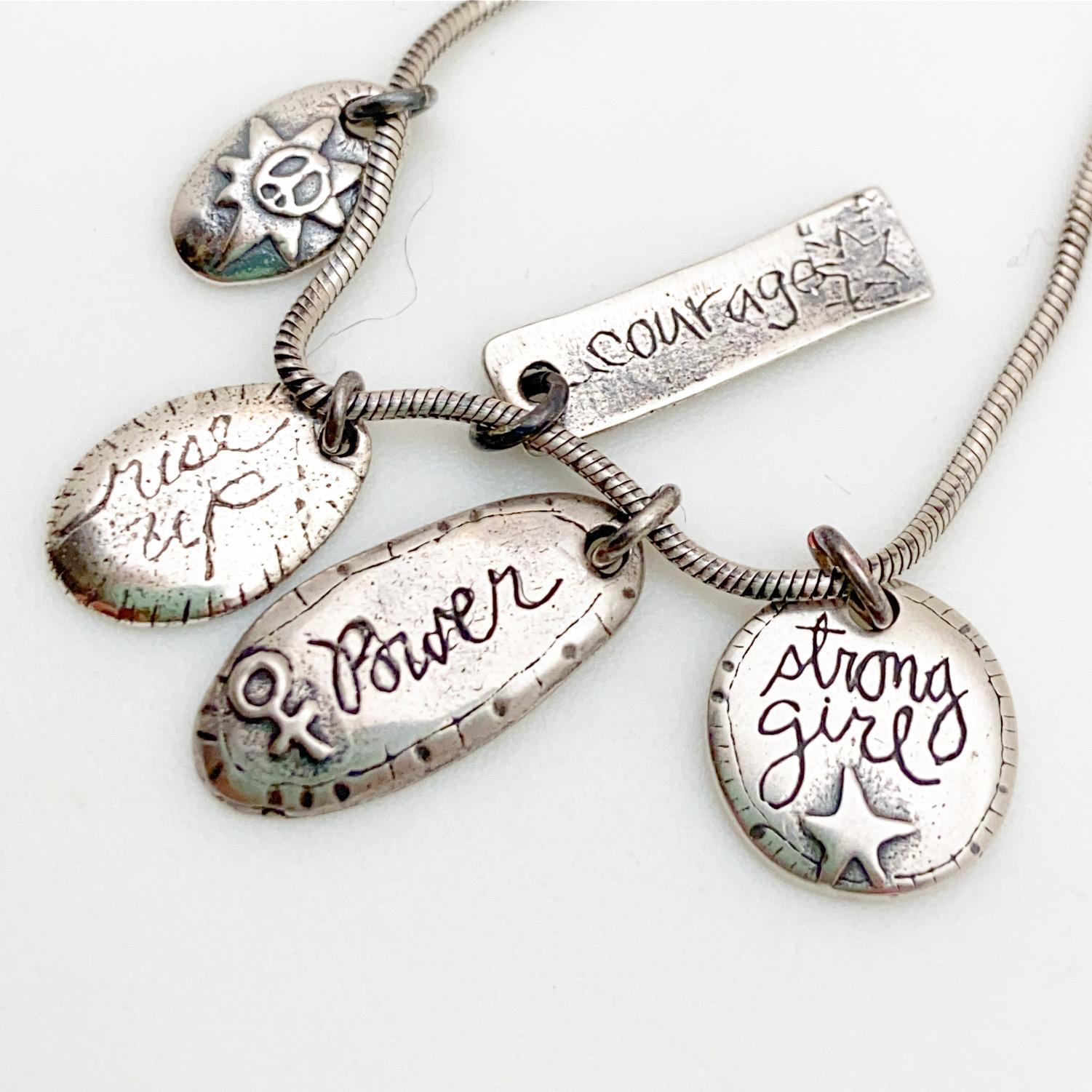 "Strong Girl" charm necklace. This necklace features 5 handmade charms that celebrate girls. Strong girls...may we celebrate them, may we be them, and may we raise them. This is a piece that will become a favorite very quickly.