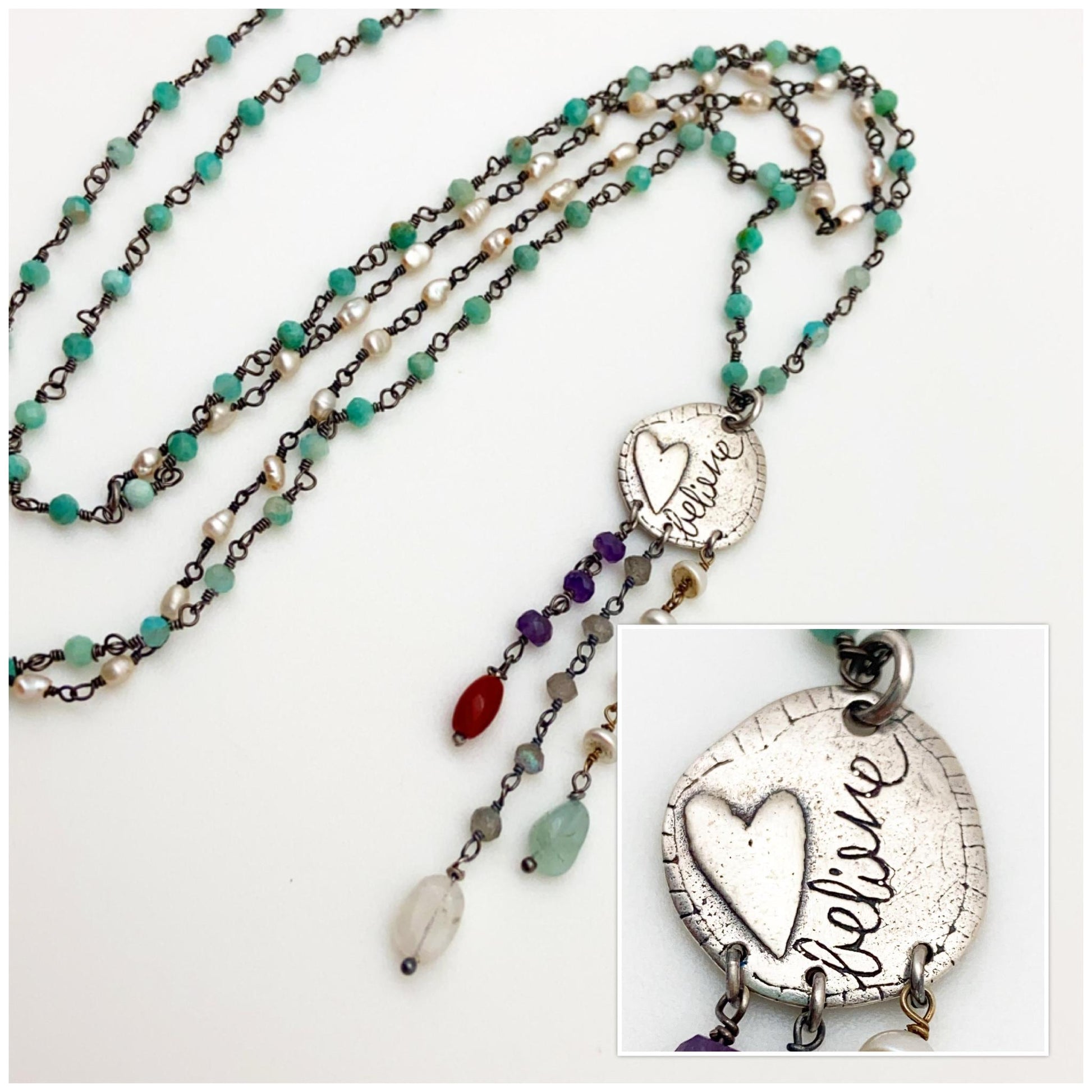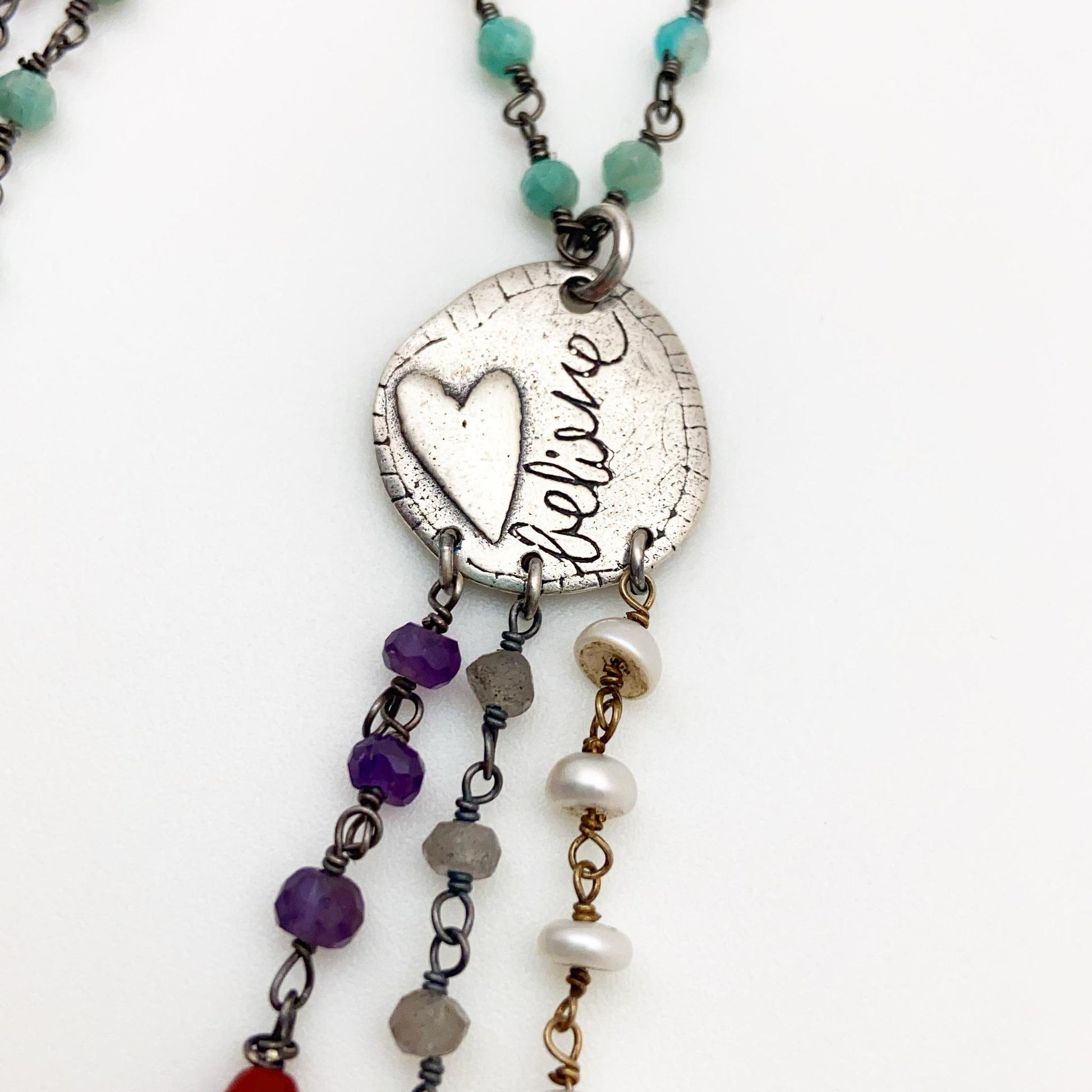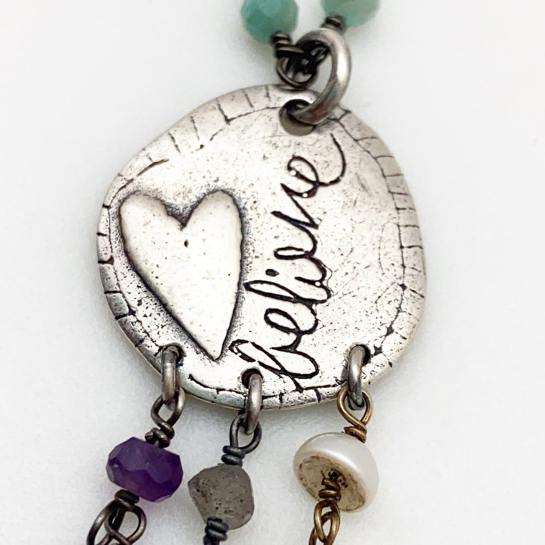 Believe! In ideas, yourself, The Universe, the future, miracles, magic, nature, others, good, tomorrow...you decide. But, remember "believing in it" is where it all begins. The handmade pendant, on this necklace, features a raised heart, organic patterns (on back), and the word "Believe" written in script all on a small sterling heart-shaped pendant. The pendant has three stands of beaded "drops" and the necklace is hand-wired beads. The beads are all real gemstones, natural stones, and pearl. This sterling and beaded handmade necklace looks great as a stand-alone piece or mixed with other necklaces.
