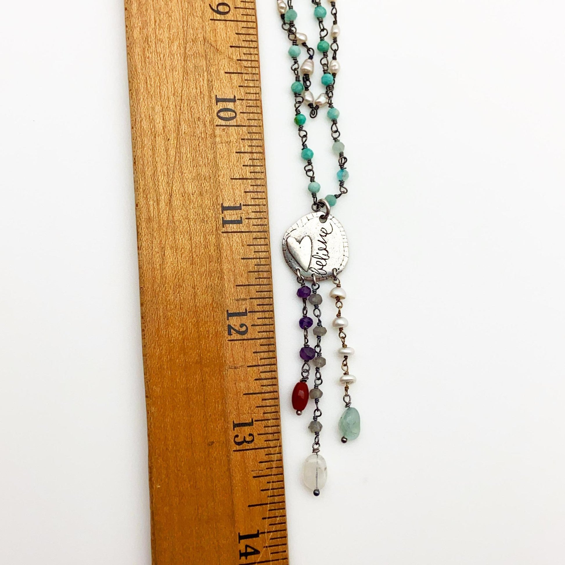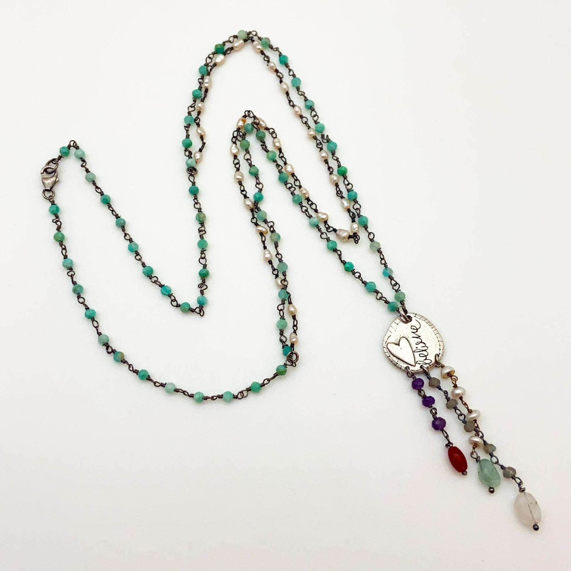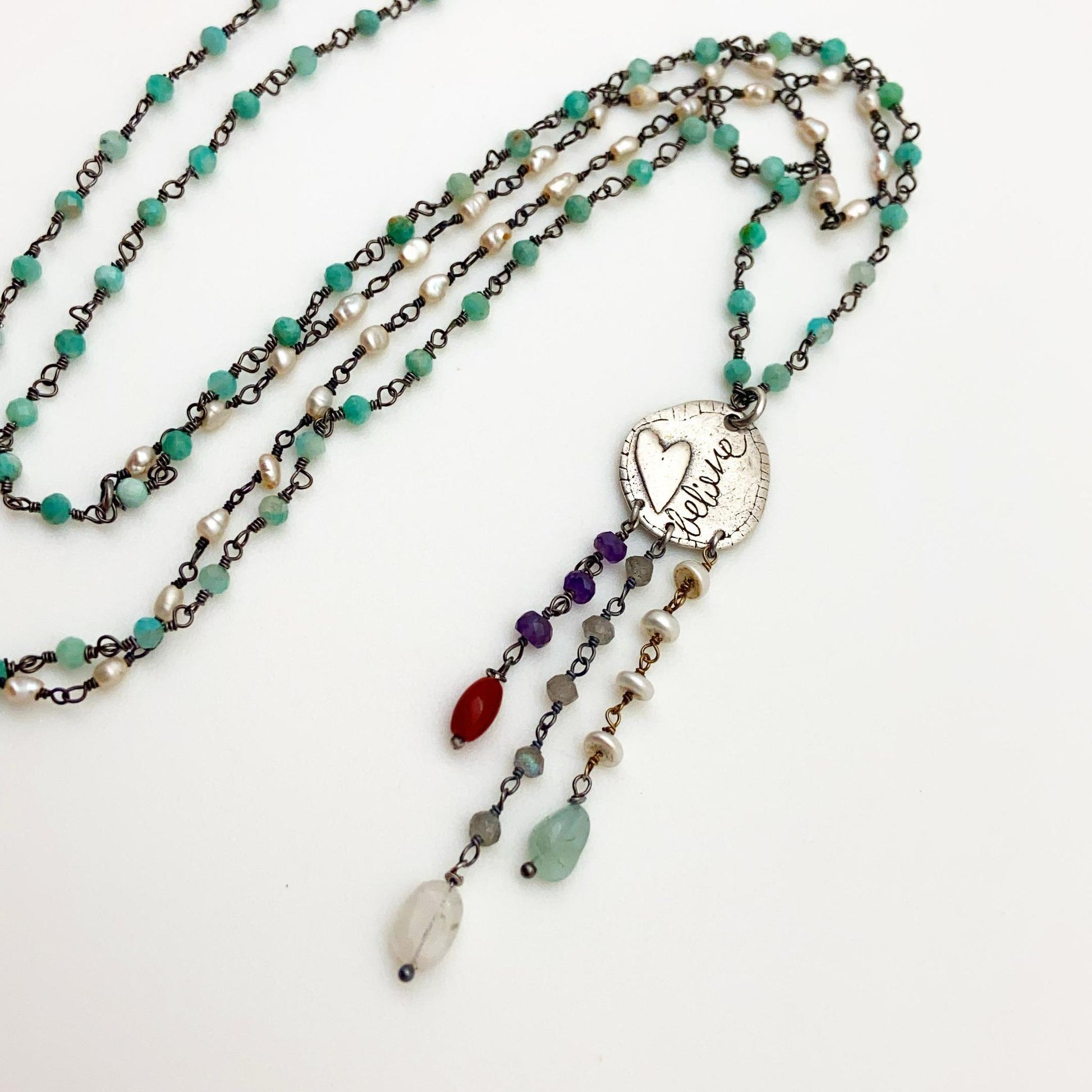 Believe! In ideas, yourself, The Universe, the future, miracles, magic, nature, others, good, tomorrow...you decide. But, remember "believing in it" is where it all begins. The handmade pendant, on this necklace, features a raised heart, organic patterns (on back), and the word "Believe" written in script all on a small sterling heart-shaped pendant. The pendant has three stands of beaded "drops" and the necklace is hand-wired beads. The beads are all real gemstones, natural stones, and pearl. This sterling and beaded handmade necklace looks great as a stand-alone piece or mixed with other necklaces.