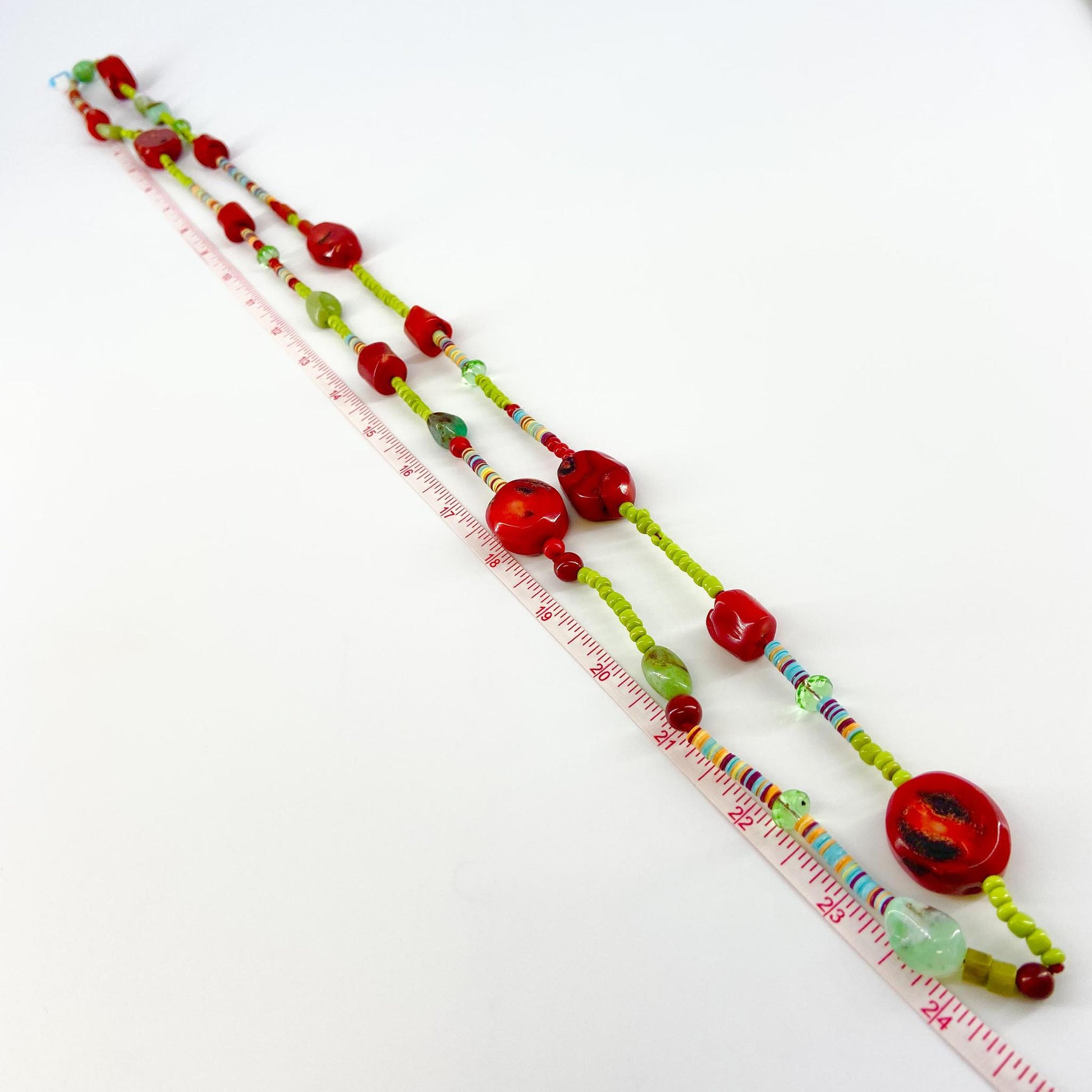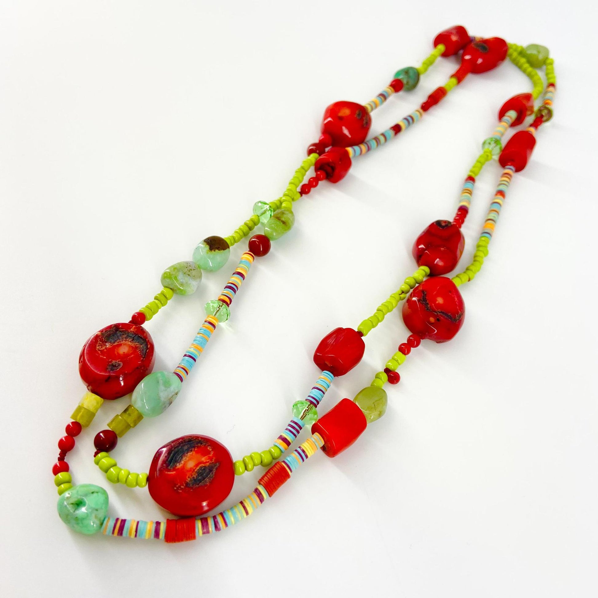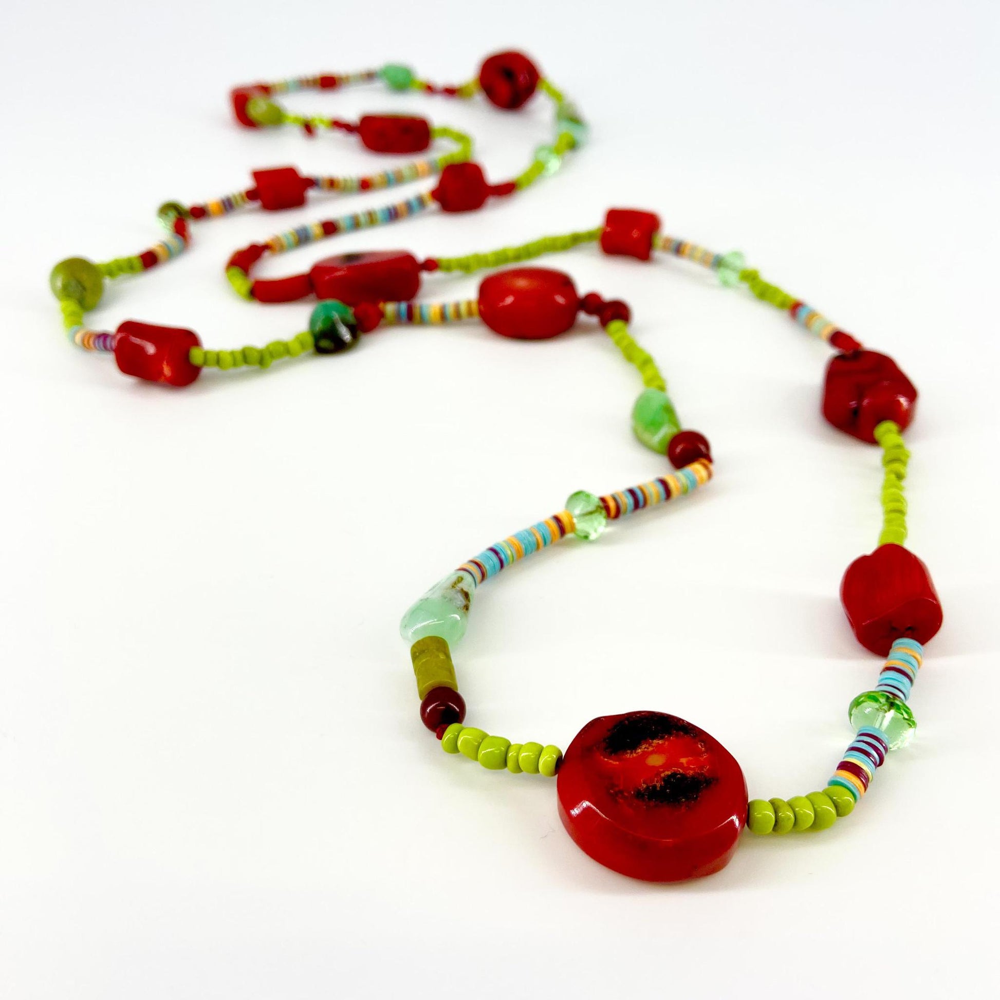 Each piece is a combination of hand-picked beads. Featuring natural stone, real crystals, pearls, authentic trade beads, singular and rare finds, limited edition glasswork, and semi-precious stones is the short list of the handfuls of beads she selects for each piece of her work. You will notice a lot of variety in each piece. That is by design. Each necklace is clearly a labor of love with attention to each bead and every detail.