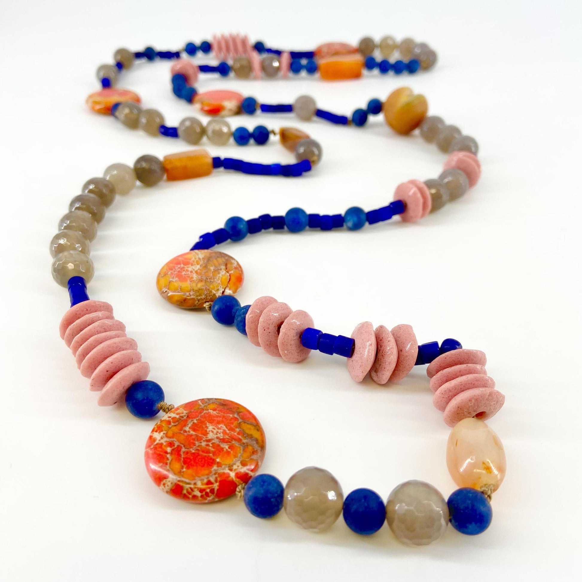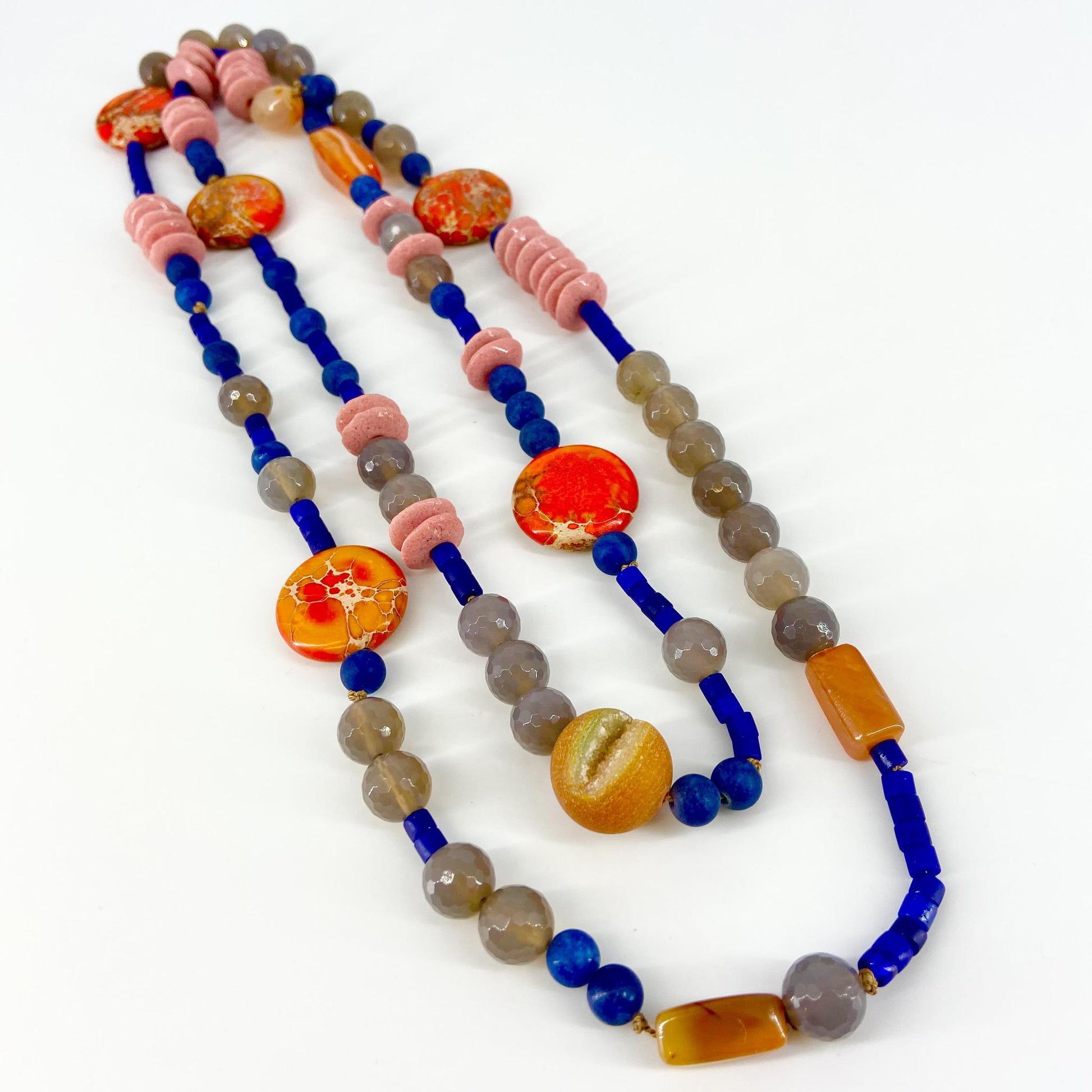 The necklaces are all designed to slip over your head. Some can be double or even tripled to wear in different configurations. They are purposely made without clasps. The necklaces are all designed and hand-knotted by the artist. The practice of hand-knotting jewelry dates back to ancient times. It is labor intensive, but worth the investment of time and requires a mastery of technique. Hand-knotting creates a more fluid piece of jewelry that lays beautifully against the body when worn. Examples of hand-knotted jewelry have been found in ancient Egypt and Mesopotamia.