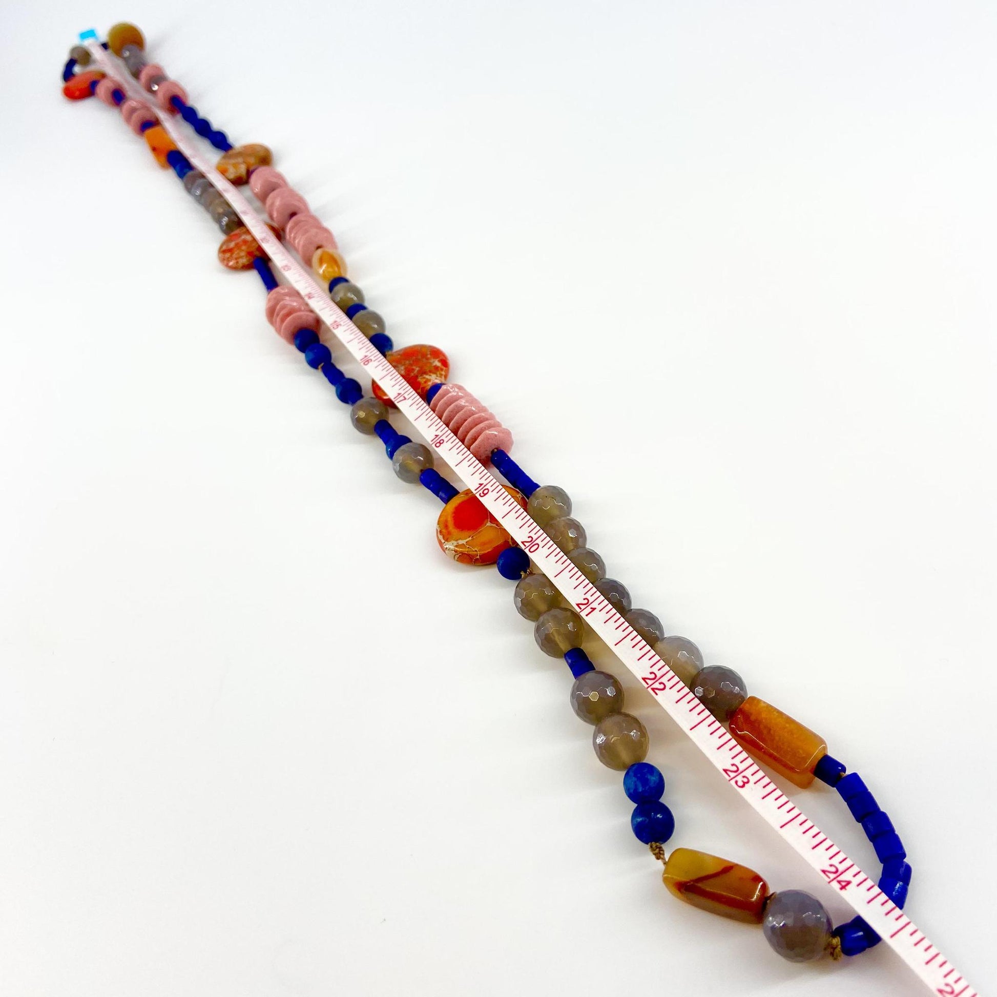 Each piece is a combination of hand-picked beads. Featuring natural stone, real crystals, pearls, authentic trade beads, singular and rare finds, limited edition glasswork, and semi-precious stones is the short list of the handfuls of beads she selects for each piece of her work. You will notice a lot of variety in each piece. That is by design. Each necklace is clearly a labor of love with attention to each bead and every detail.