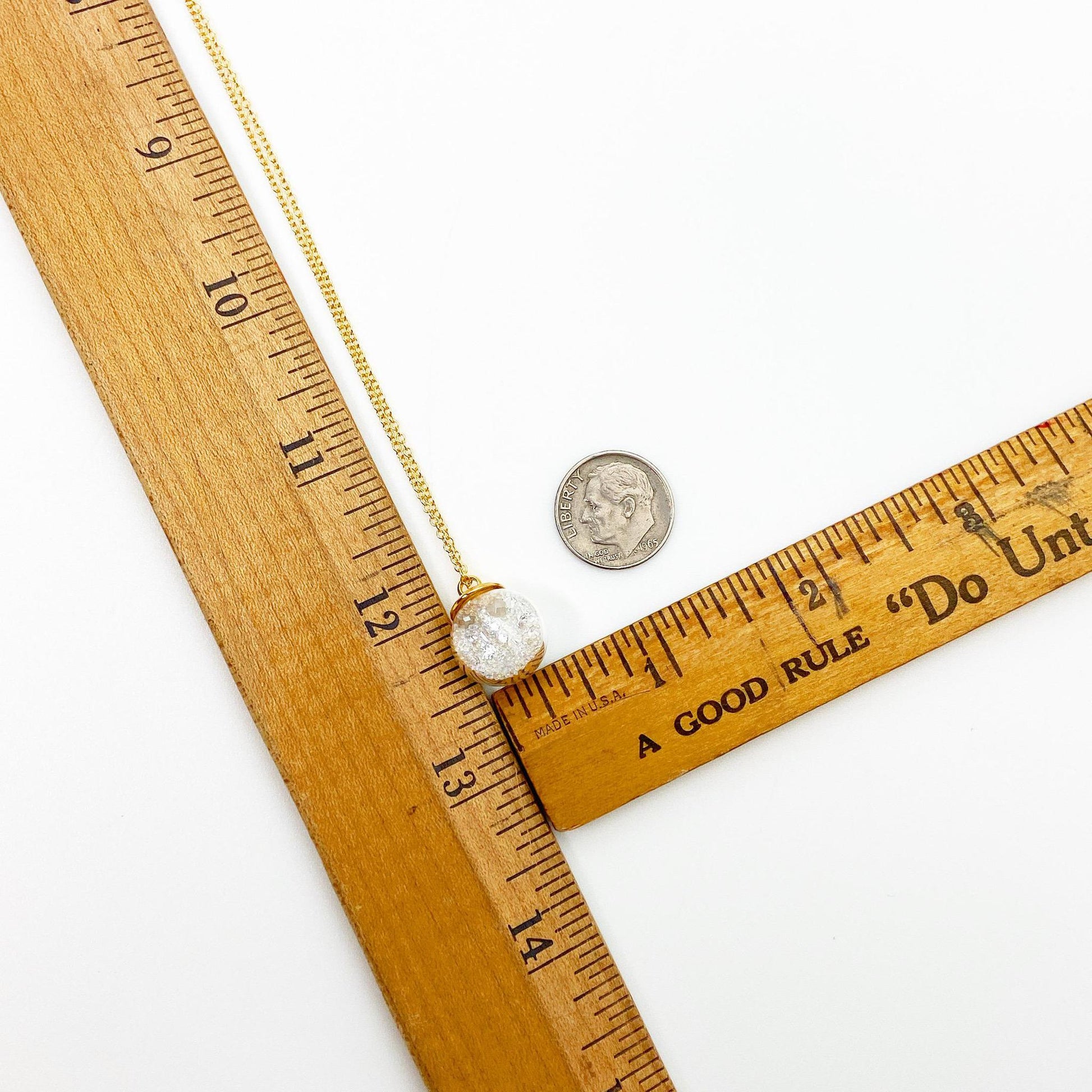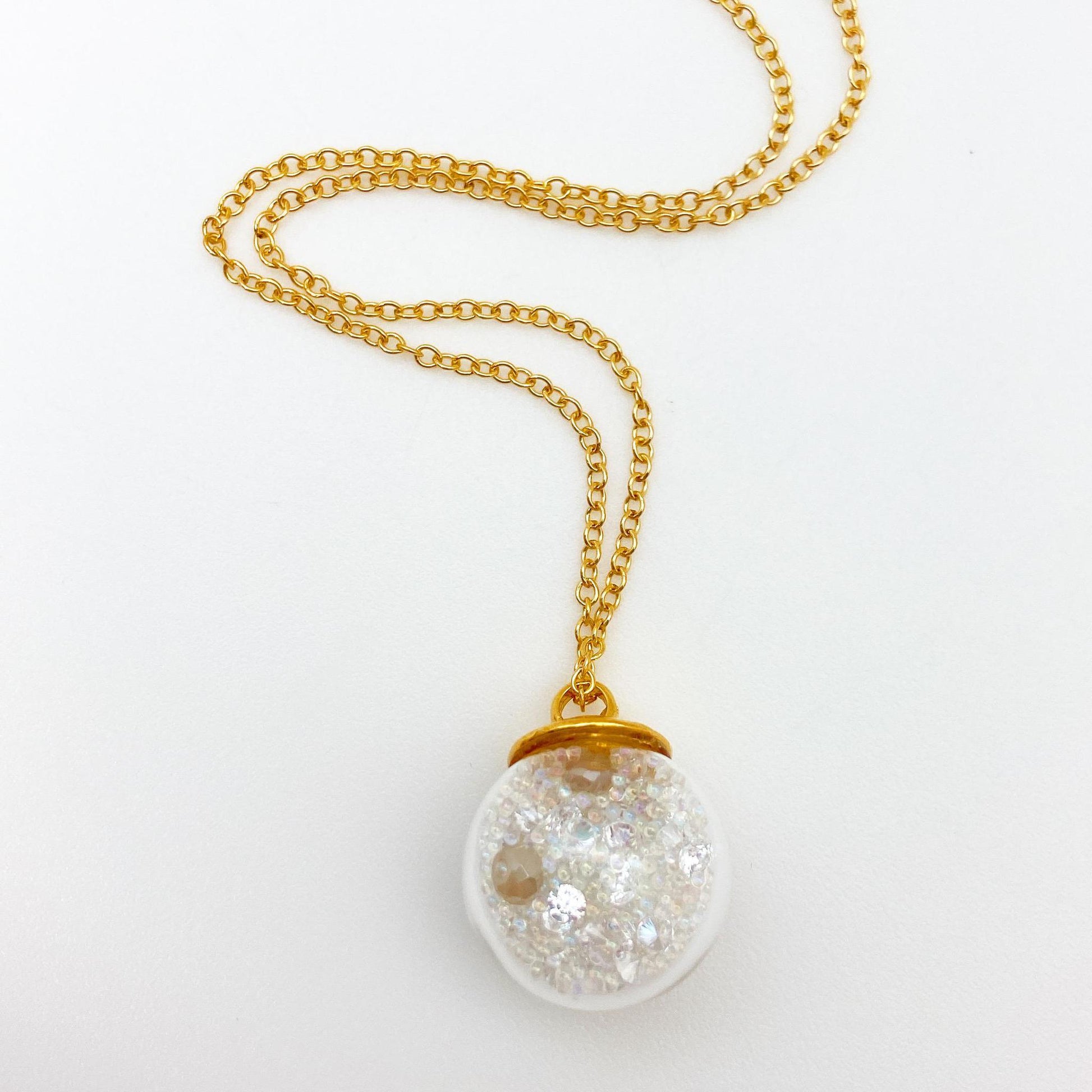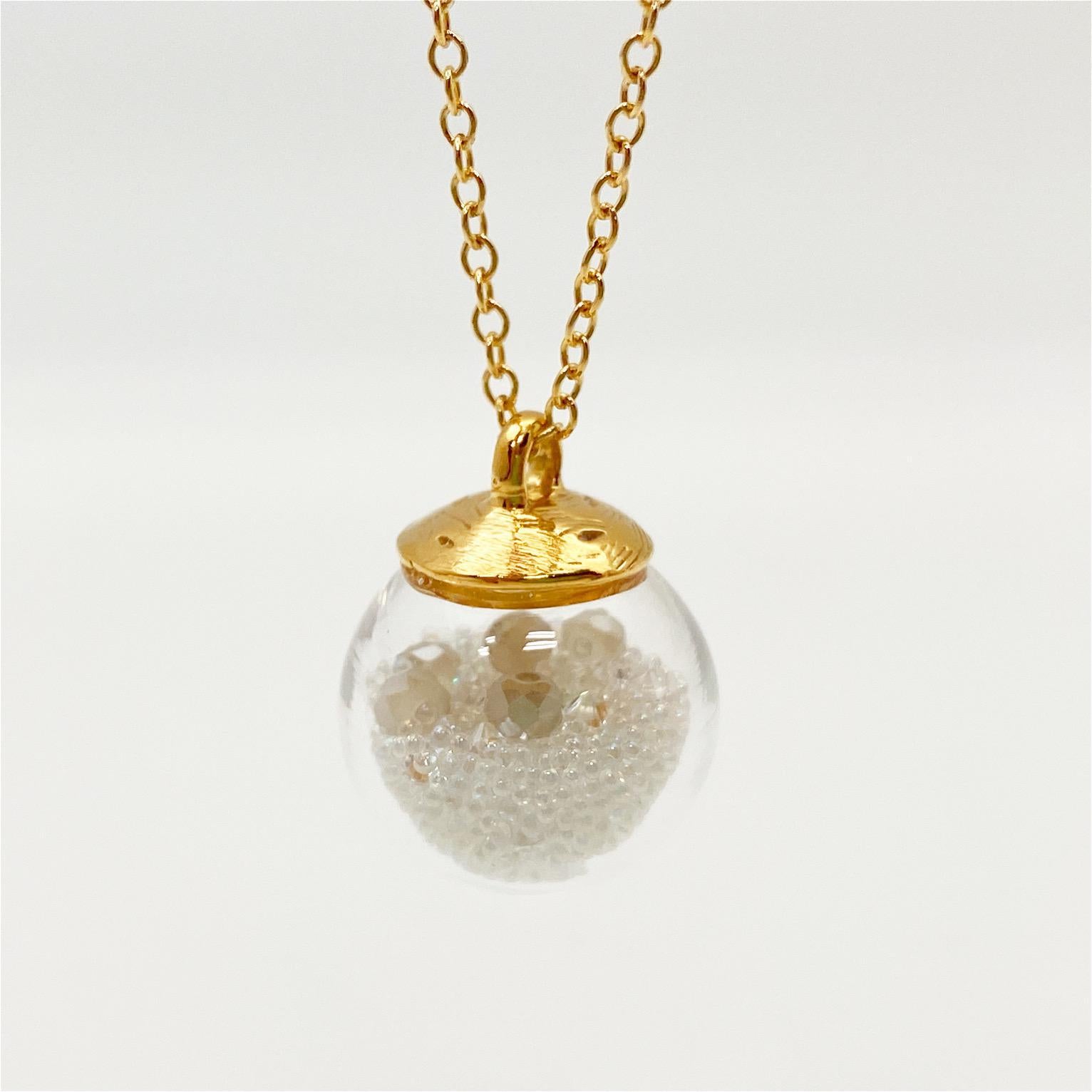 Let yourself be drawn into a miniature world of luminous colors and dynamic movement. A playful and dynamic design, the glass globe pendant is filled with crystals and gemstone dust. It's topped with a simple, organic-looking cap.