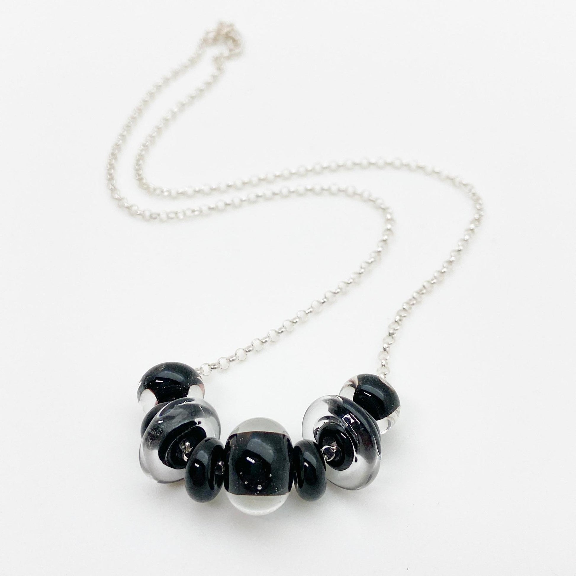 Handmade in Kansas City by an incredible glass bead artist. Each glass bead is handmade in our artist's home studio. She then combines her original beads with intricate sterling silver findings and clasps, creating a true one-of-a-kind necklace. The chain is made of fine sterling silver.