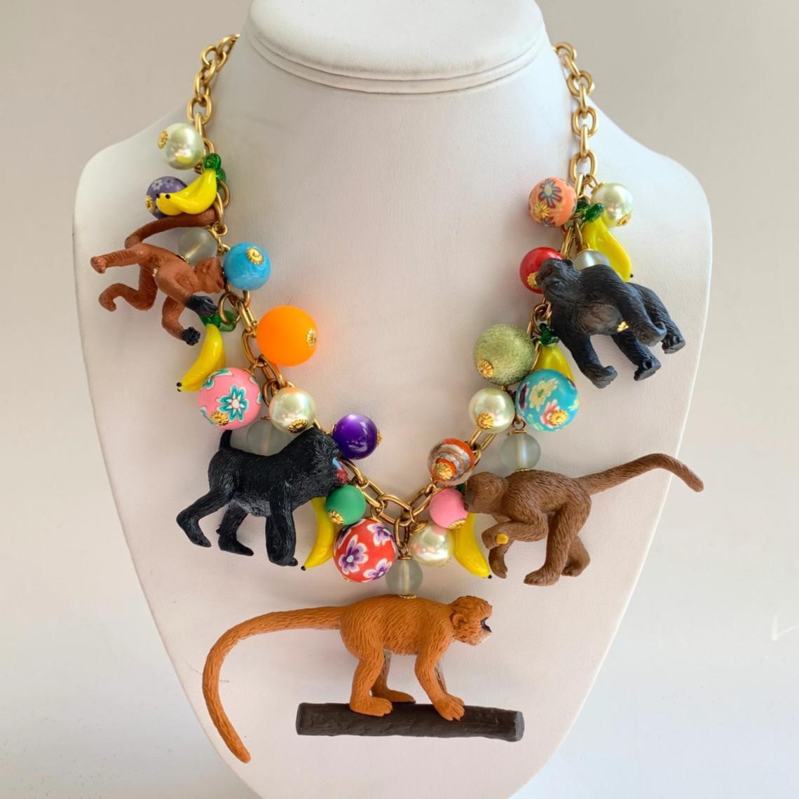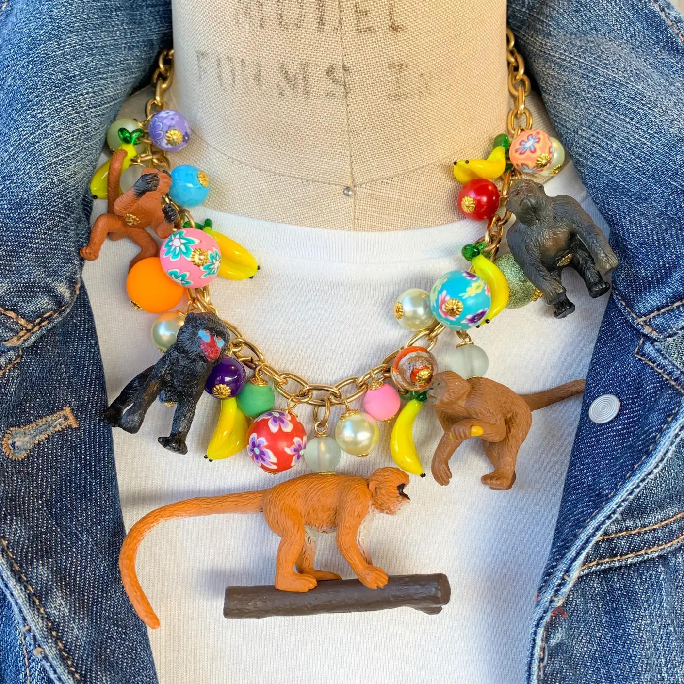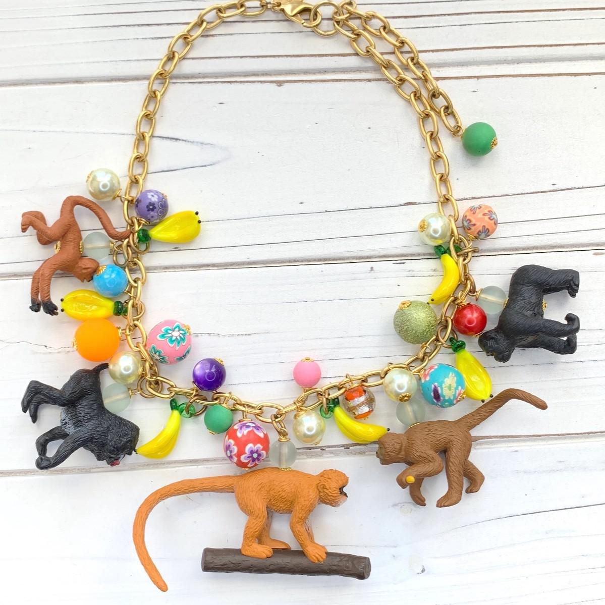 This wild, playful, and unexpected charm necklace is a conversation starter for sure. Tiny monkey, fun themed charms, and colorful beads make it quite "charming" (pun intended).