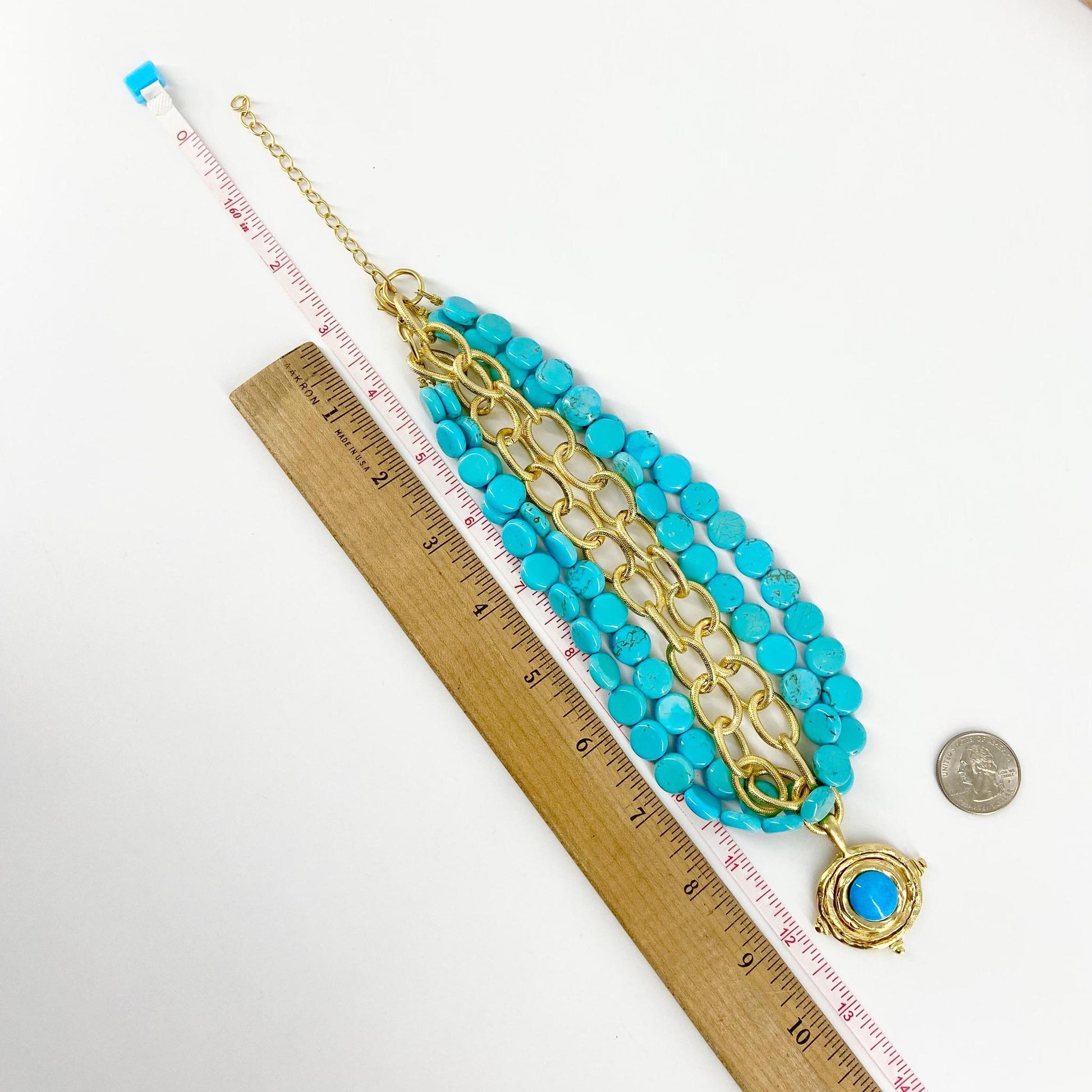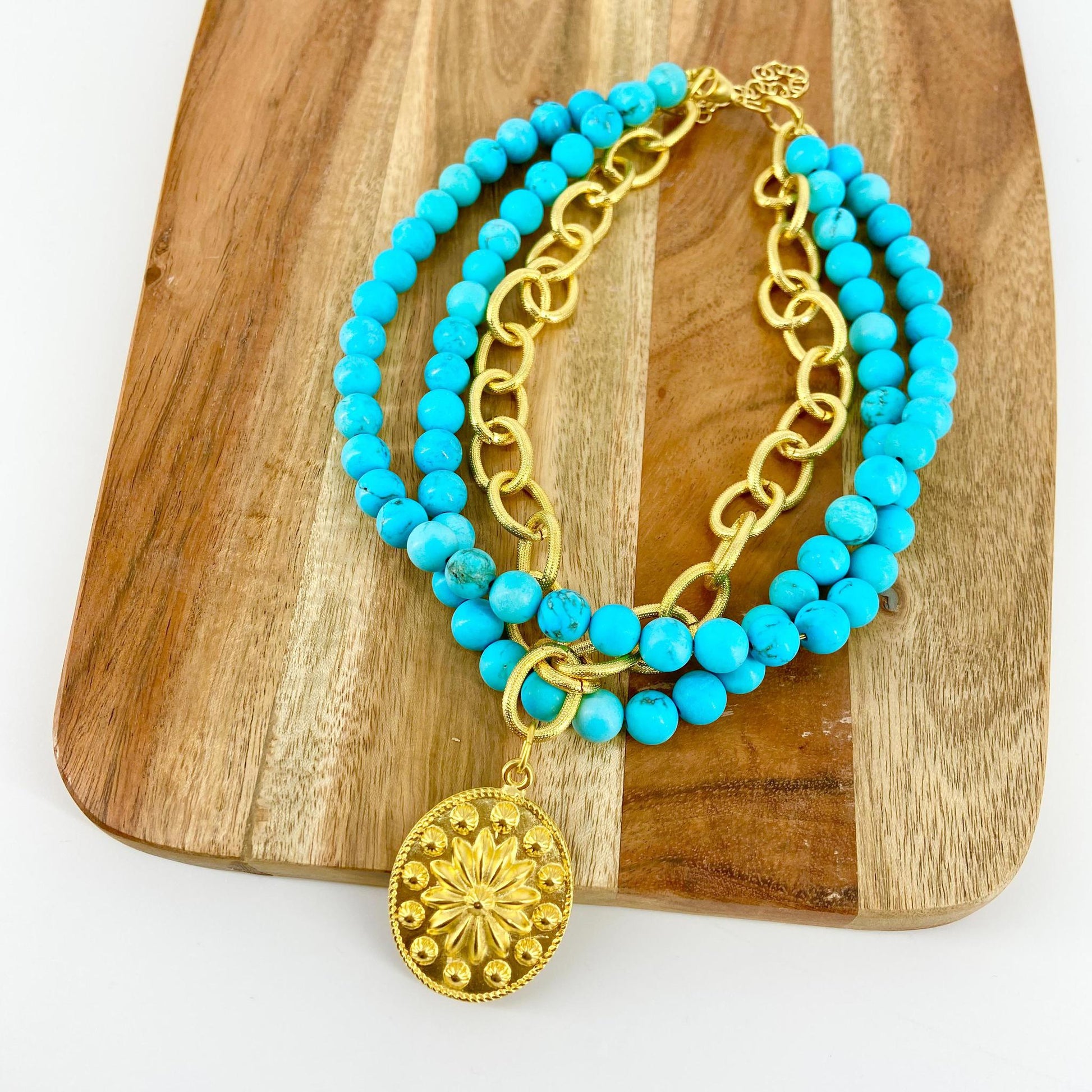 Necklace - Triple Strand with Burst Medallion in Turquoise and Gold