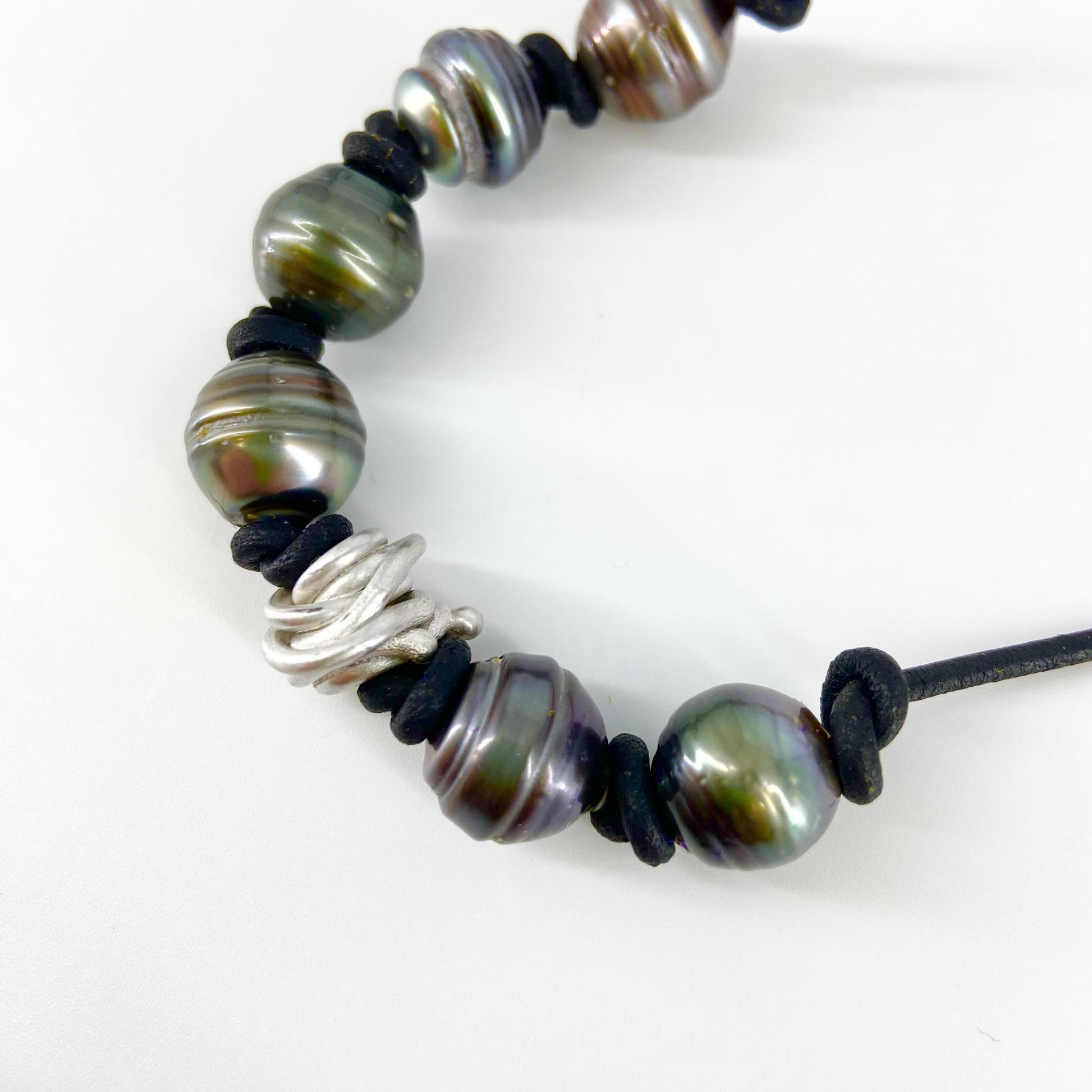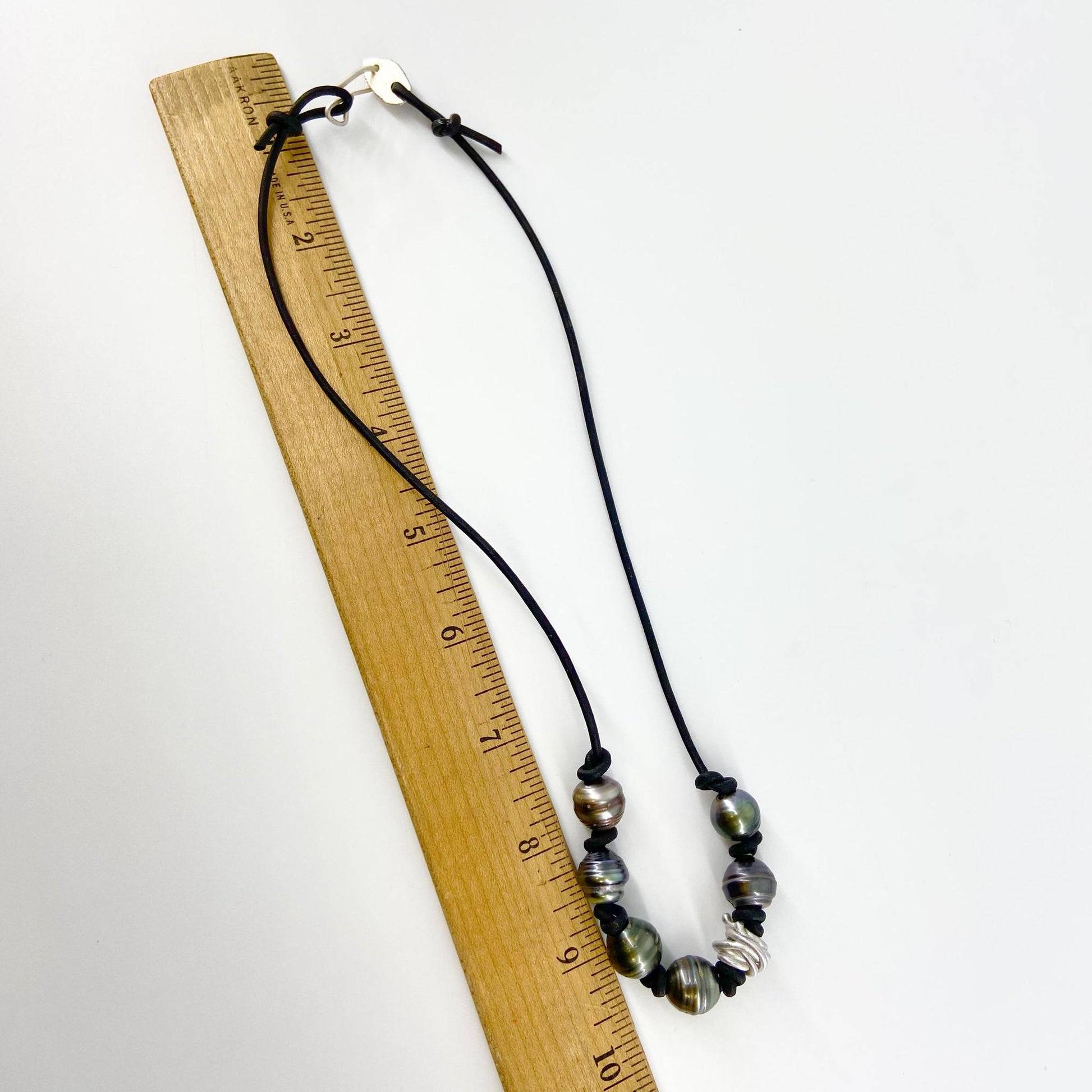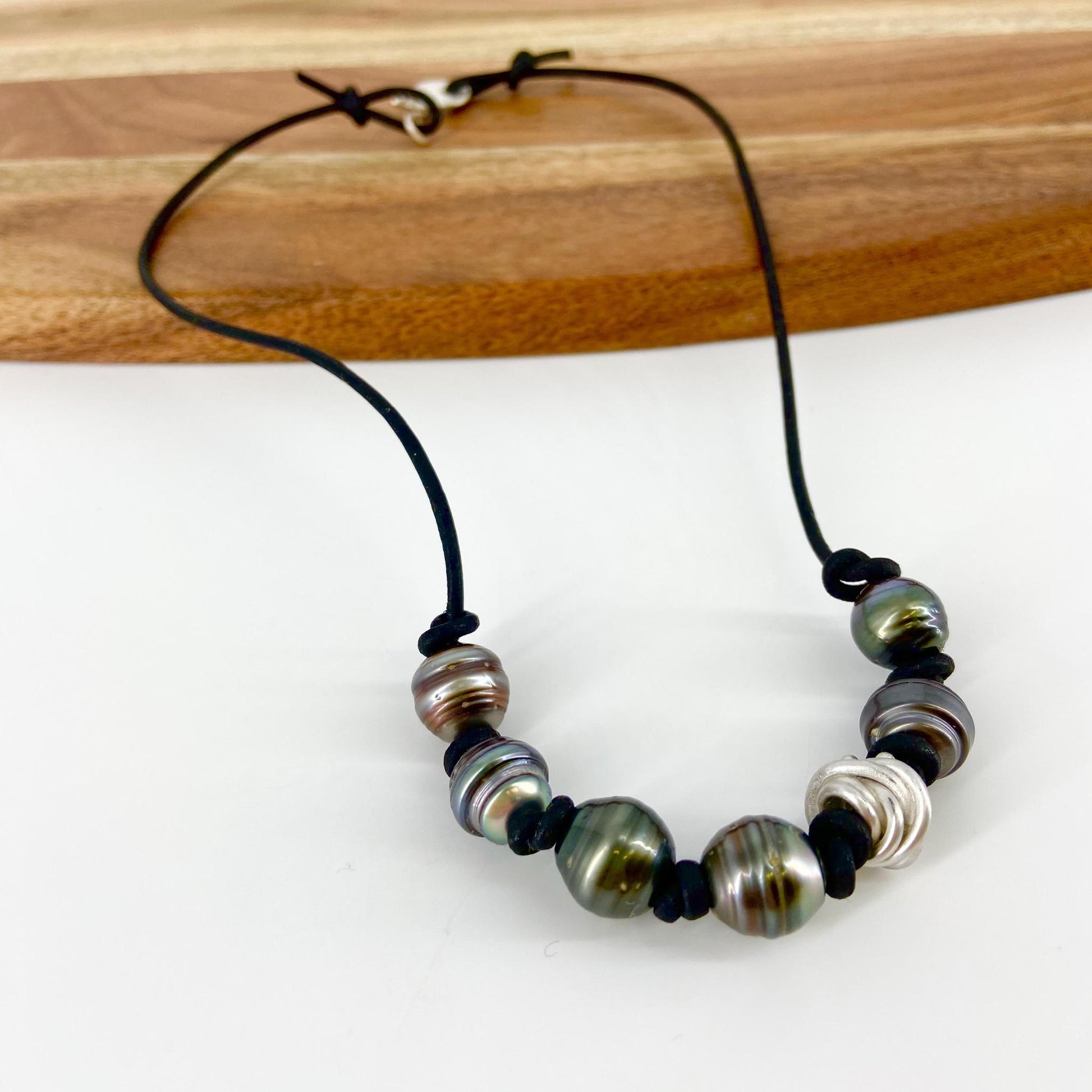 Necklace - Hand-Knotted Dark Grey Pearls on Leather with Sterling Silver