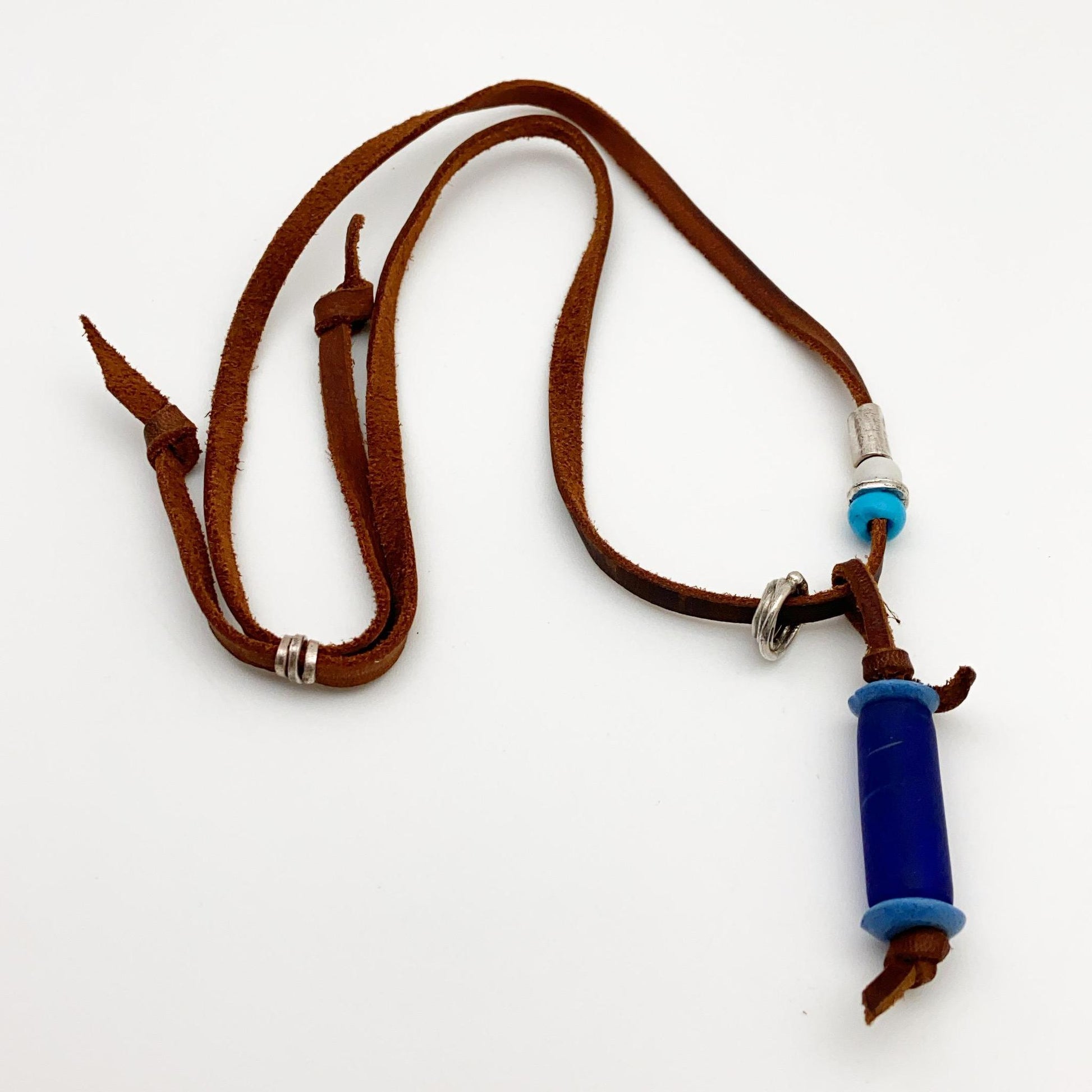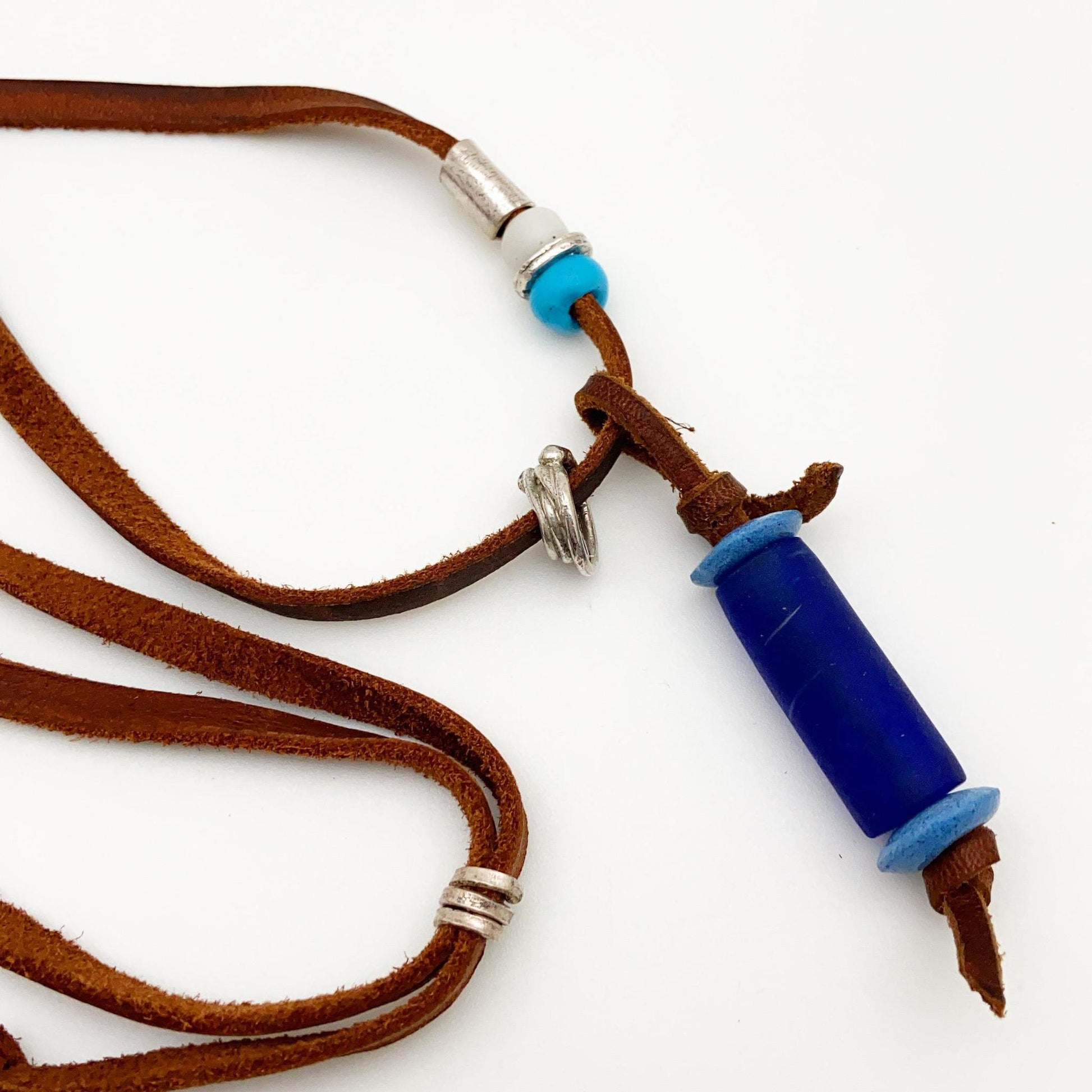 - Large blue tube African bead on pendant.