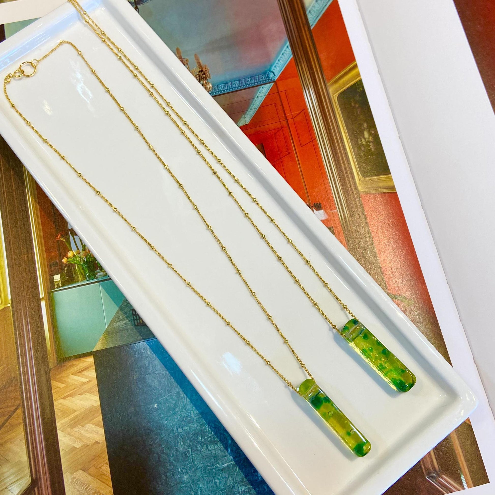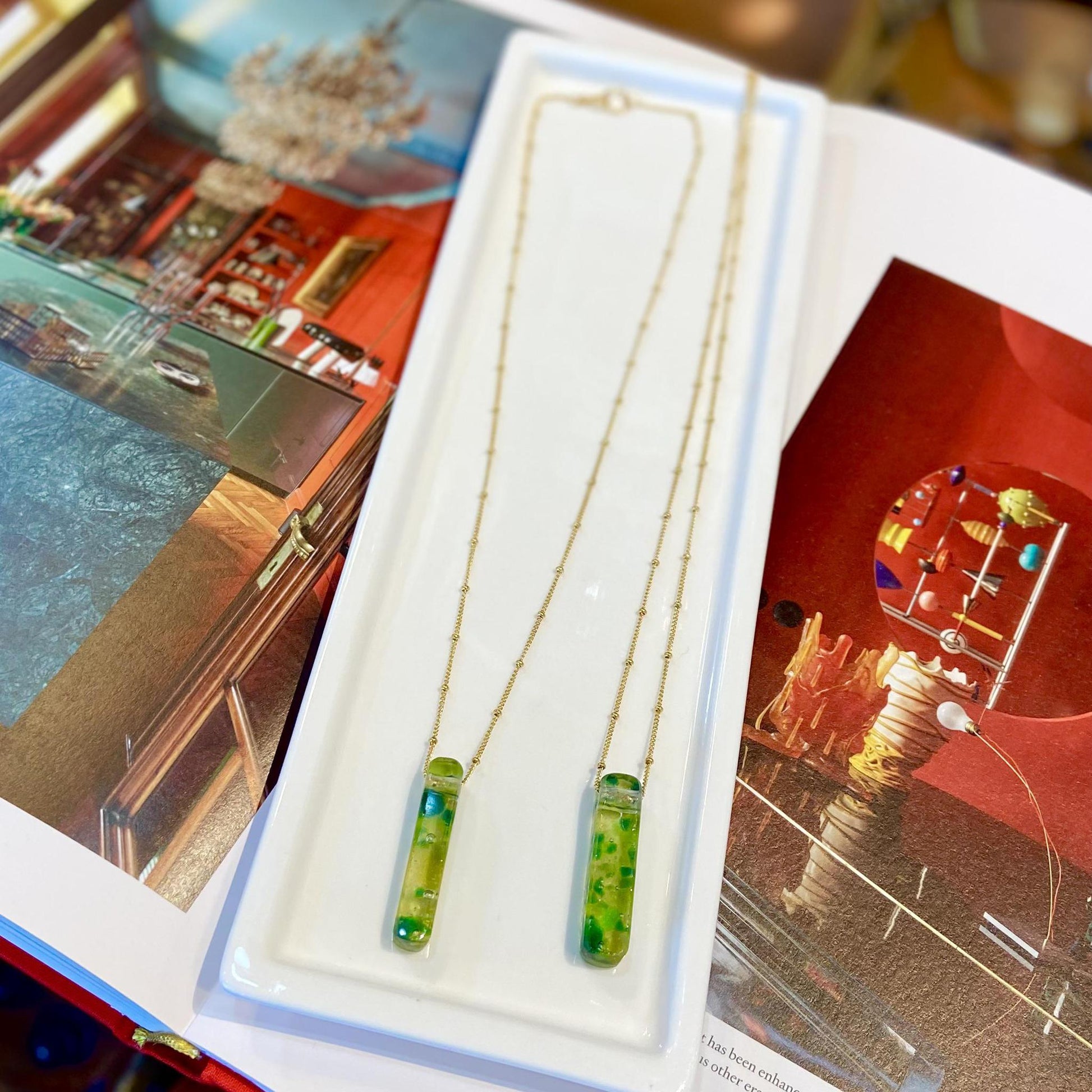 These necklaces feature reclaimed glass pieces from bottles. These necklaces feature glass shards "trapped" between glass "slices" from old wine bottles. They have been fused in a kiln to create one-of-a-kind pendants. Each necklace is a unique mosaic glass piece of art. This collection is handmade in the artist's studio. She uses delicate, sturdy chains that honor the simplicity of her work.