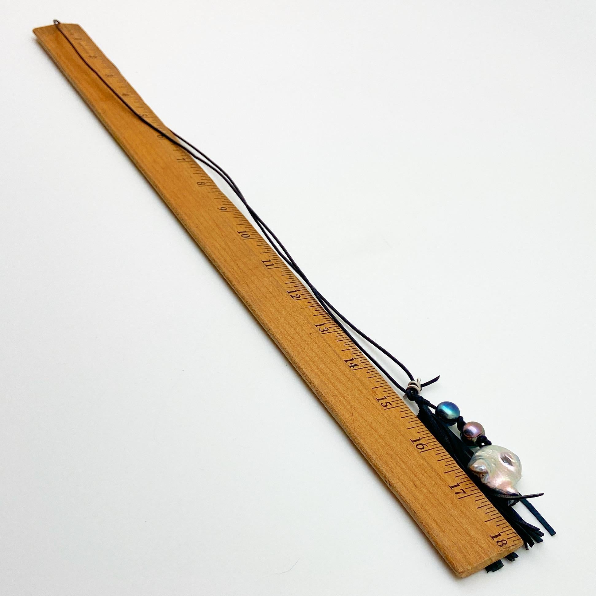 This statement piece is artistic, unexpected, and intricate; yet rugged and natural. The artist has hand-drawn sterling into a wire that is wrapped around the leather. The natural pearls are individually hand-knotted to create a dramatic drop from the bottom of the adjustable necklace. Zoom in for all the details.