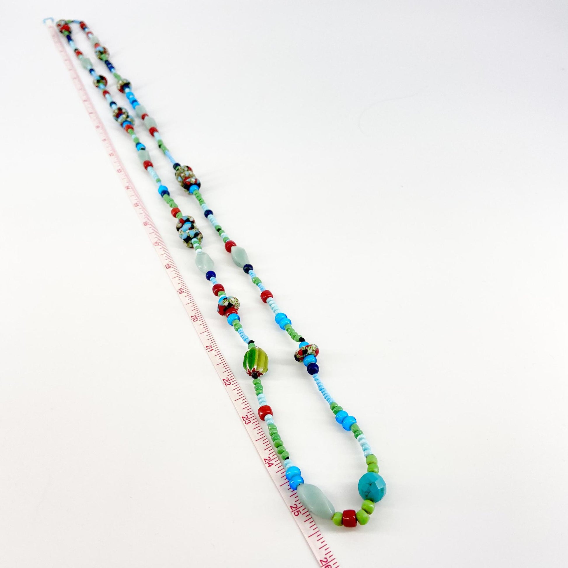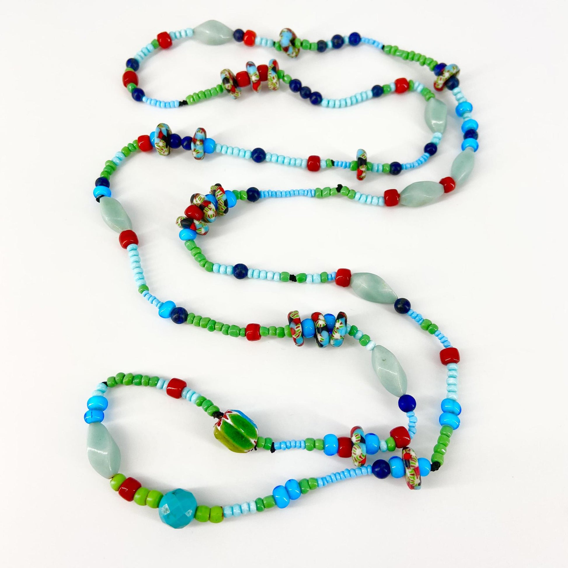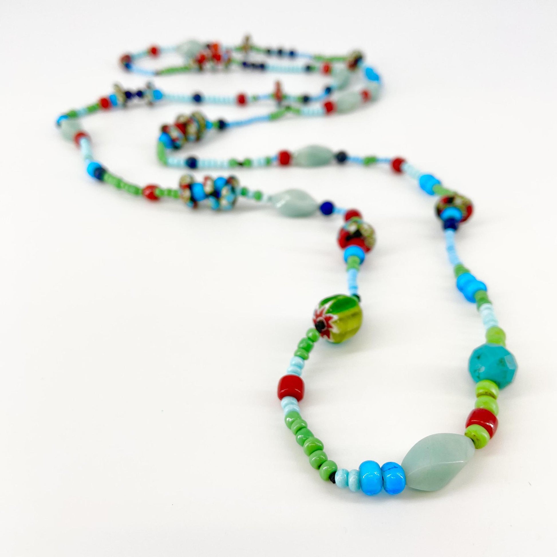Each piece is a combination of hand-picked beads. Featuring natural stone, real crystals, pearls, authentic trade beads, singular and rare finds, limited edition glasswork, and semi-precious stones is the short list of the handfuls of beads she selects for each piece of her work. You will notice a lot of variety in each piece. That is by design. Each necklace is clearly a labor of love with attention to each bead and every detail.
