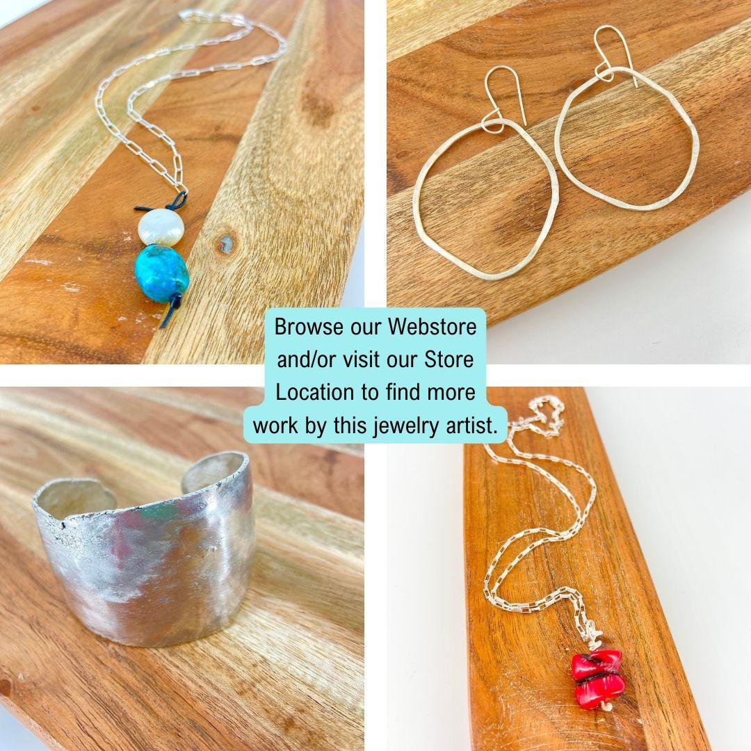 This artist's handiwork is characterized by hand-struck sterling silver. Her work is known for being organic, natural, and has a rough-hewn look and feel. This accomplished Kansas artist creates her sterling, gold, brass, and copper pieces from scratch. That means she smelts, pours, forms, and decorates each piece of metal herself. Each piece starts with the metal in its liquid form. The process can be labor some, but it results in a pure metal that is strikingly rugged, pure, and authentic.