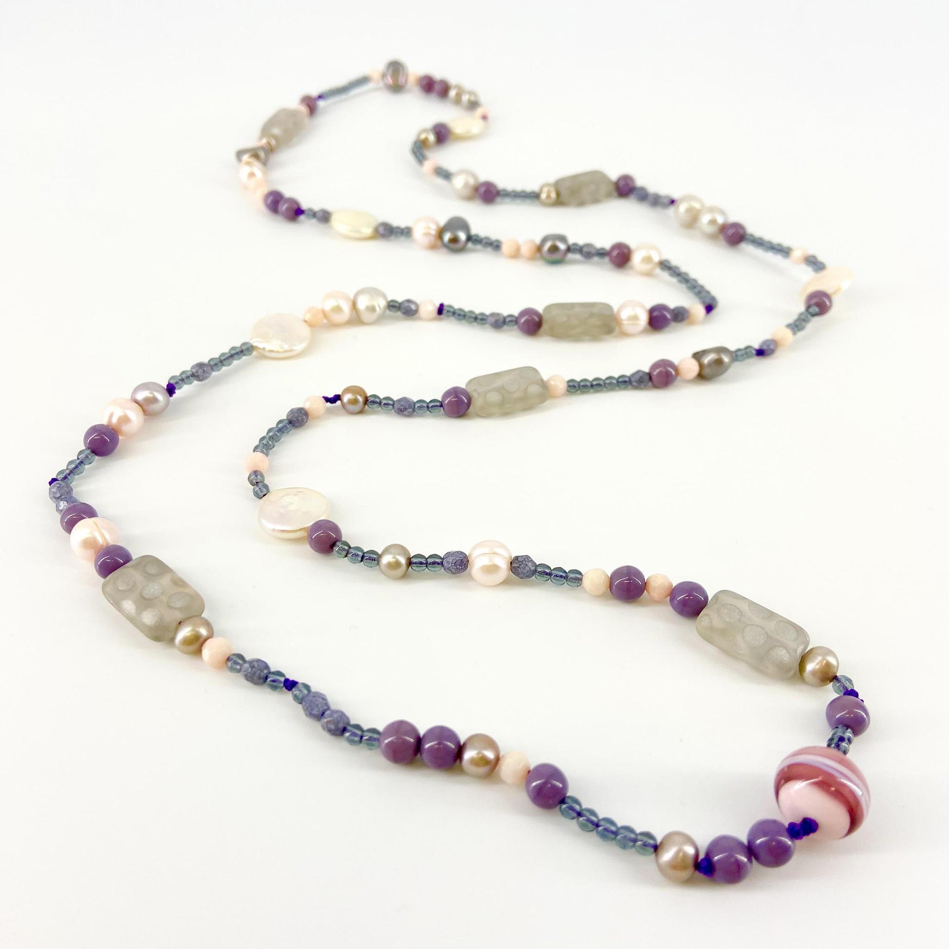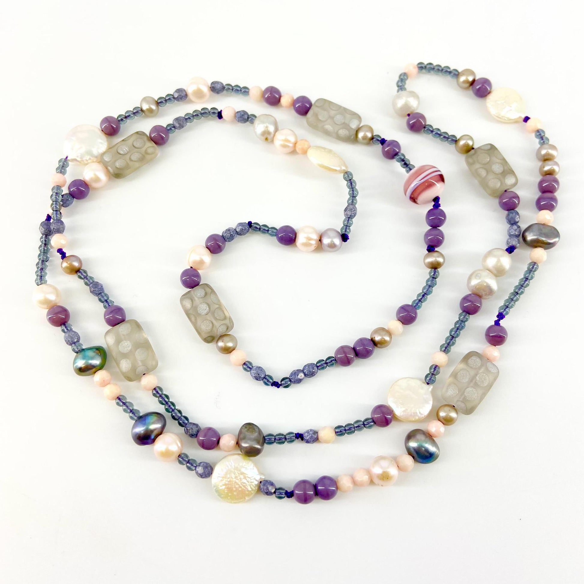 The necklaces are all designed to slip over your head. Some can be double or even tripled to wear in different configurations. They are purposely made without clasps. The necklaces are all designed and hand-knotted by the artist. The practice of hand-knotting jewelry dates back to ancient times. It is labor intensive, but worth the investment of time and requires a mastery of technique. Hand-knotting creates a more fluid piece of jewelry that lays beautifully against the body when worn. Examples of hand-knotted jewelry have been found in ancient Egypt and Mesopotamia.