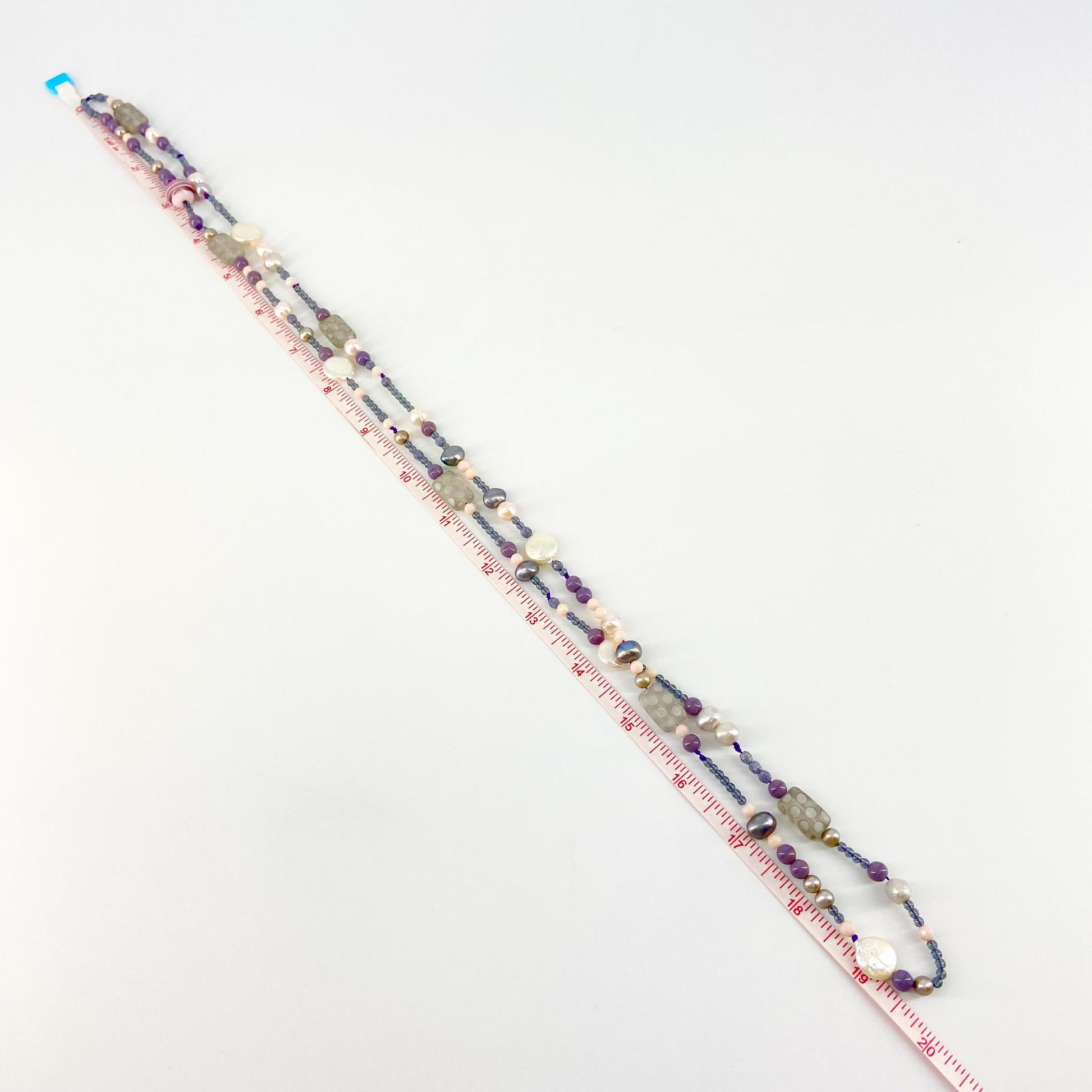 Each piece is a combination of hand-picked beads. Featuring natural stone, real crystals, pearls, authentic trade beads, singular and rare finds, limited edition glasswork, and semi-precious stones is the short list of the handfuls of beads she selects for each piece of her work. You will notice a lot of variety in each piece. That is by design. Each necklace is clearly a labor of love with attention to each bead and every detail.