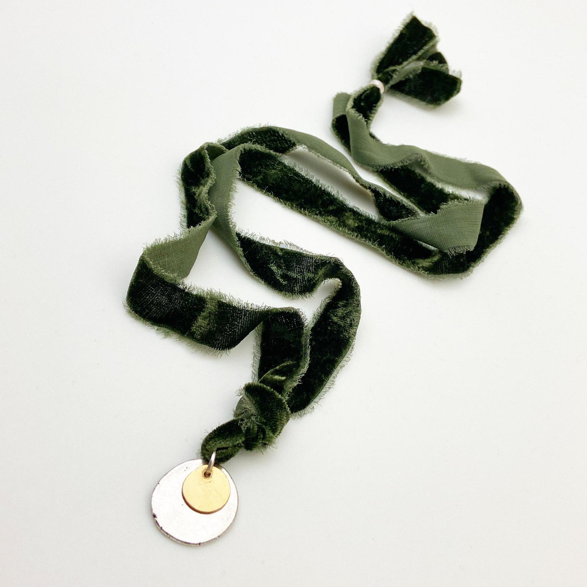 Necklace - Life Balance in Silver and Gold - Medallions on Green Silk Velvet