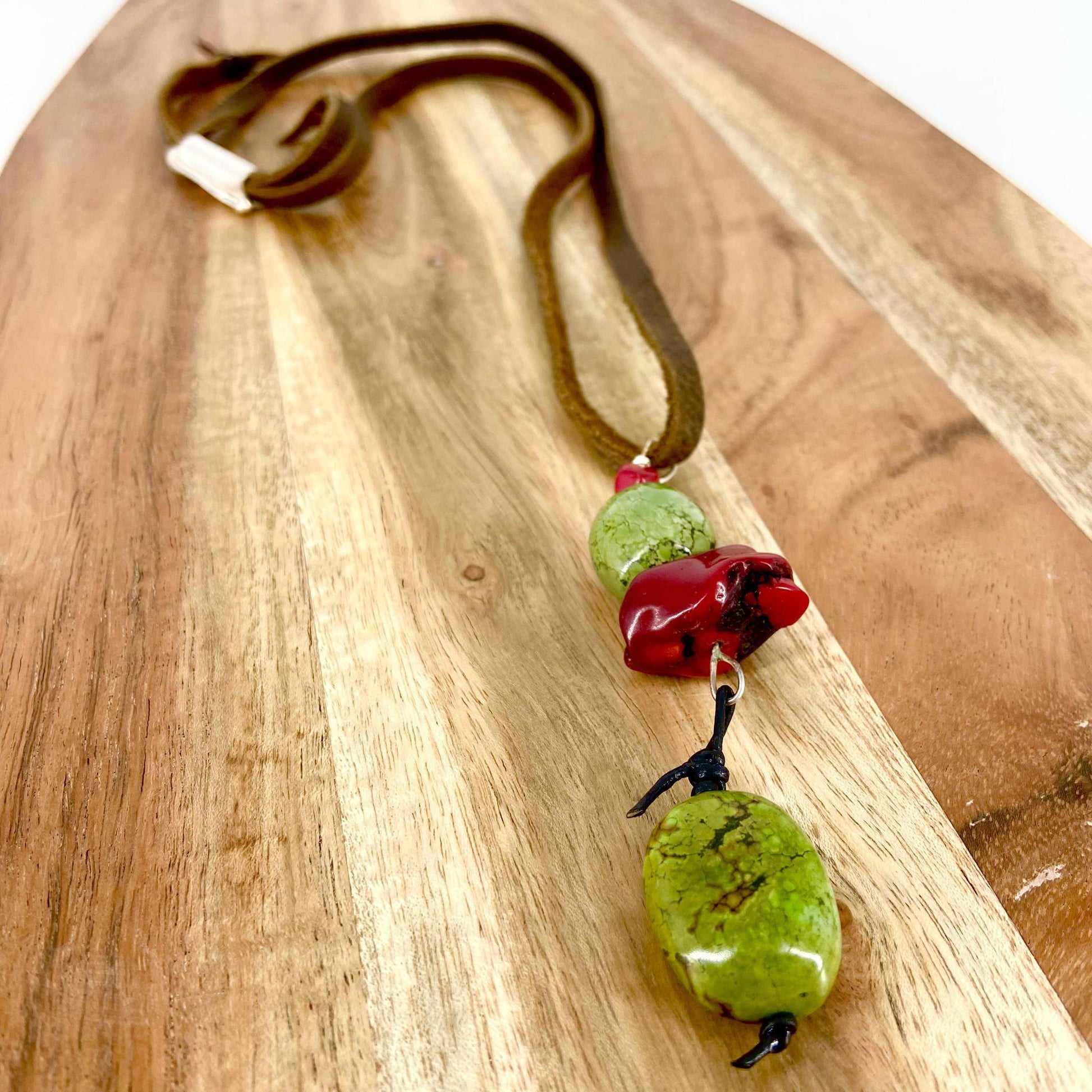 - Natural Bead Pendant on Leather w/ handmade sterling slider "bead".