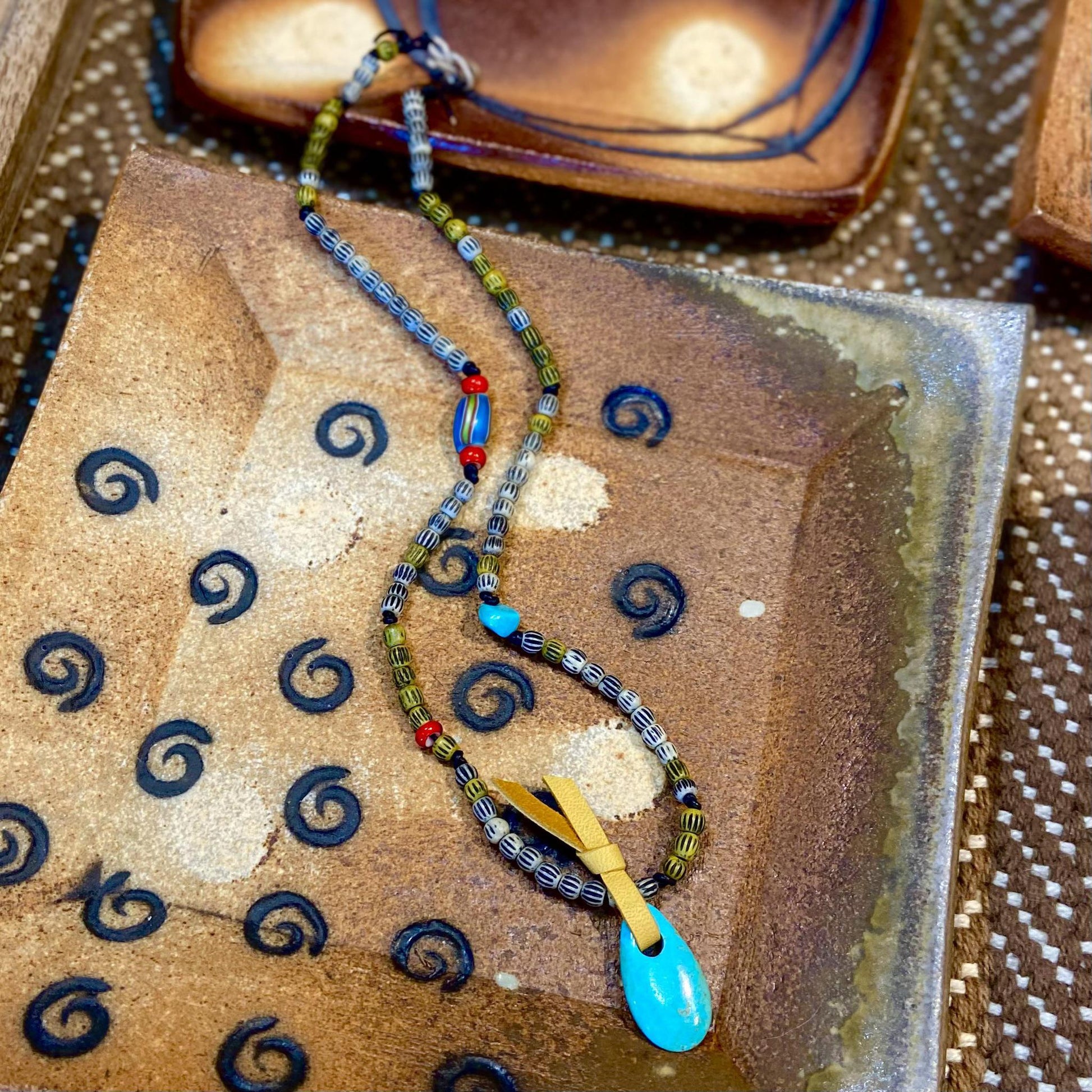 - Assorted African trade bead & turquoise pendant tied on with leather