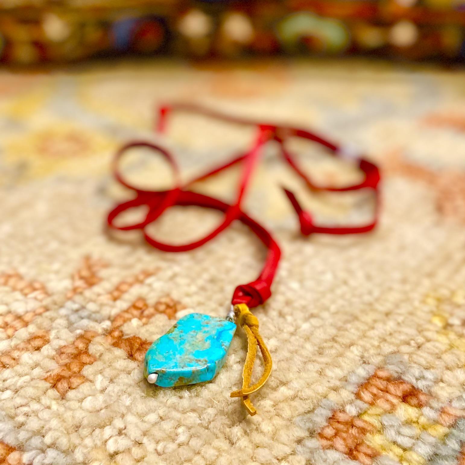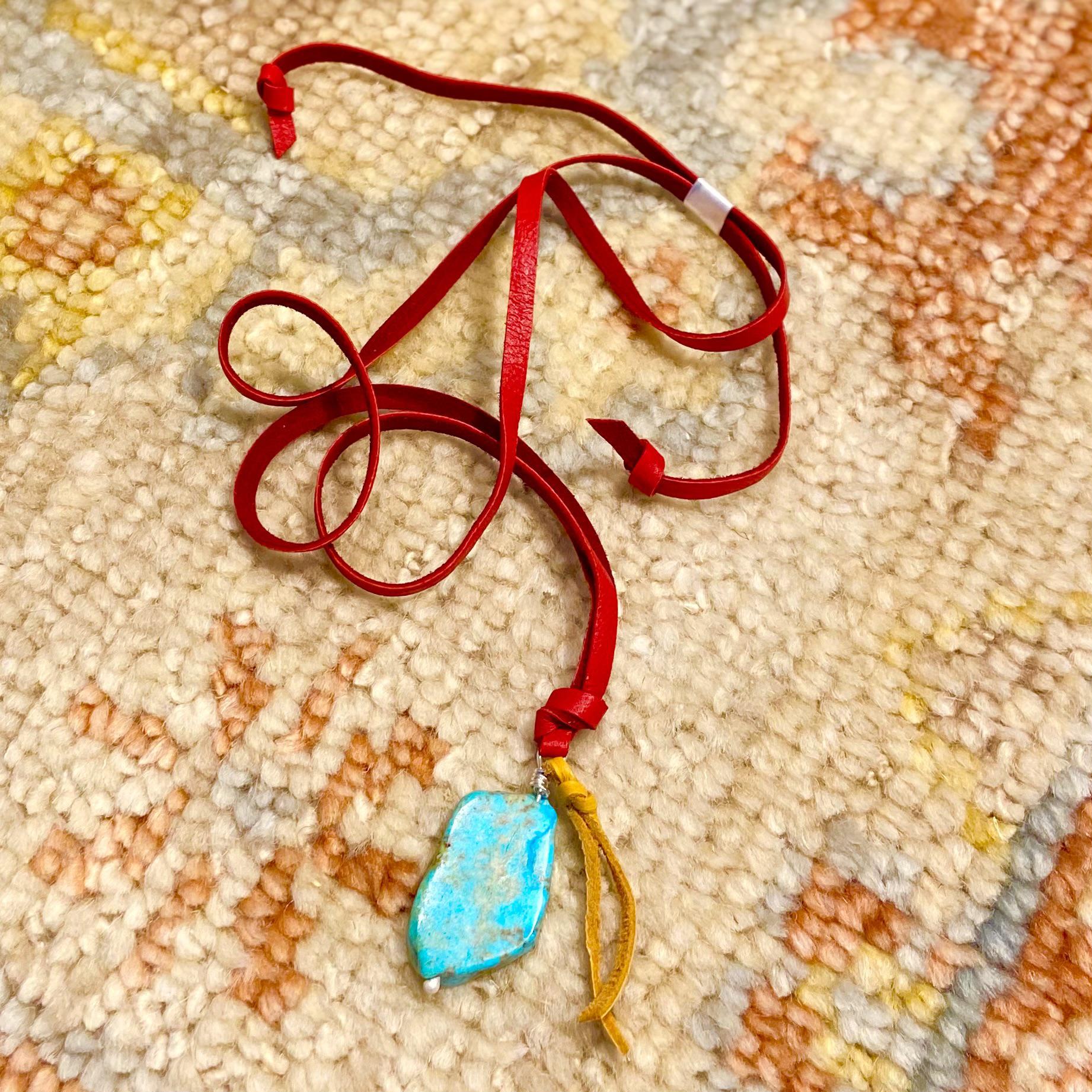 Necklace - Turquoise Slice with Sterling and Leather Tassel on Red Leather