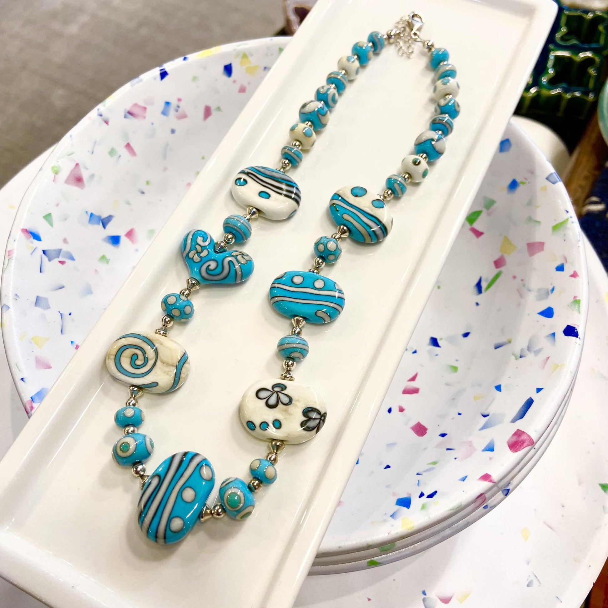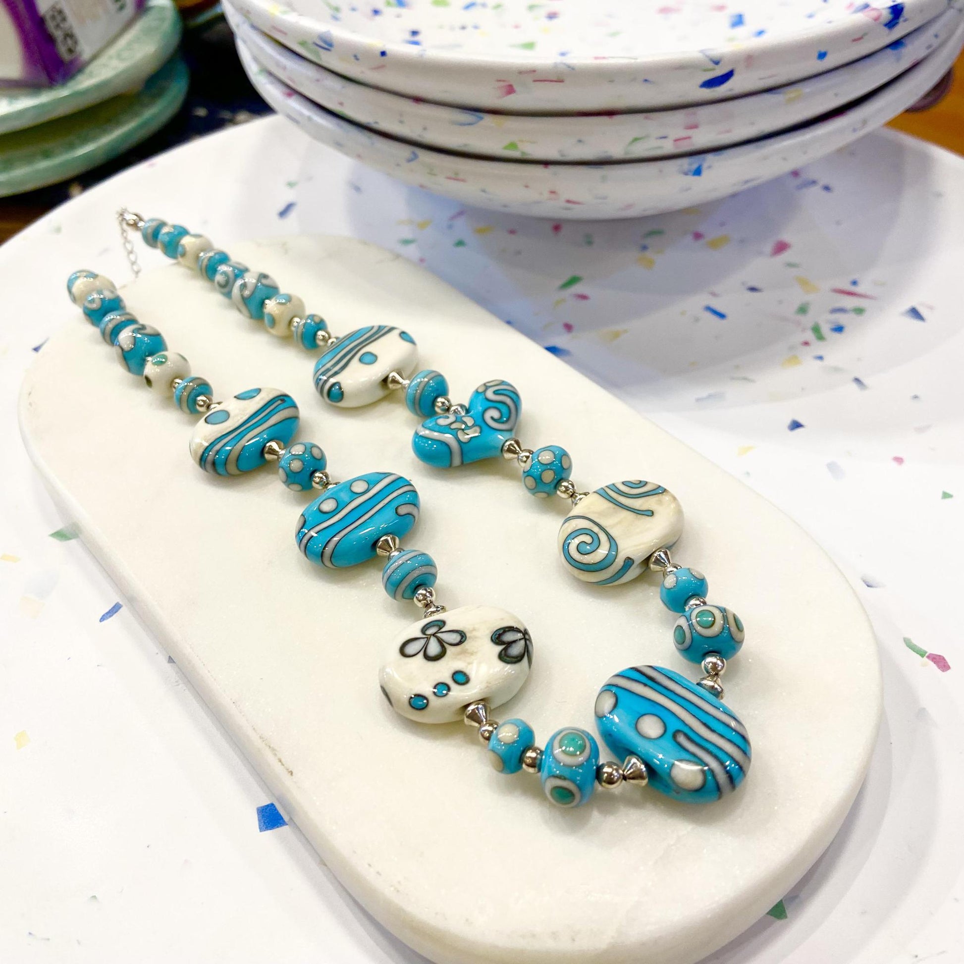 Necklace - Turquoise & White - Sterling Silver & Glass