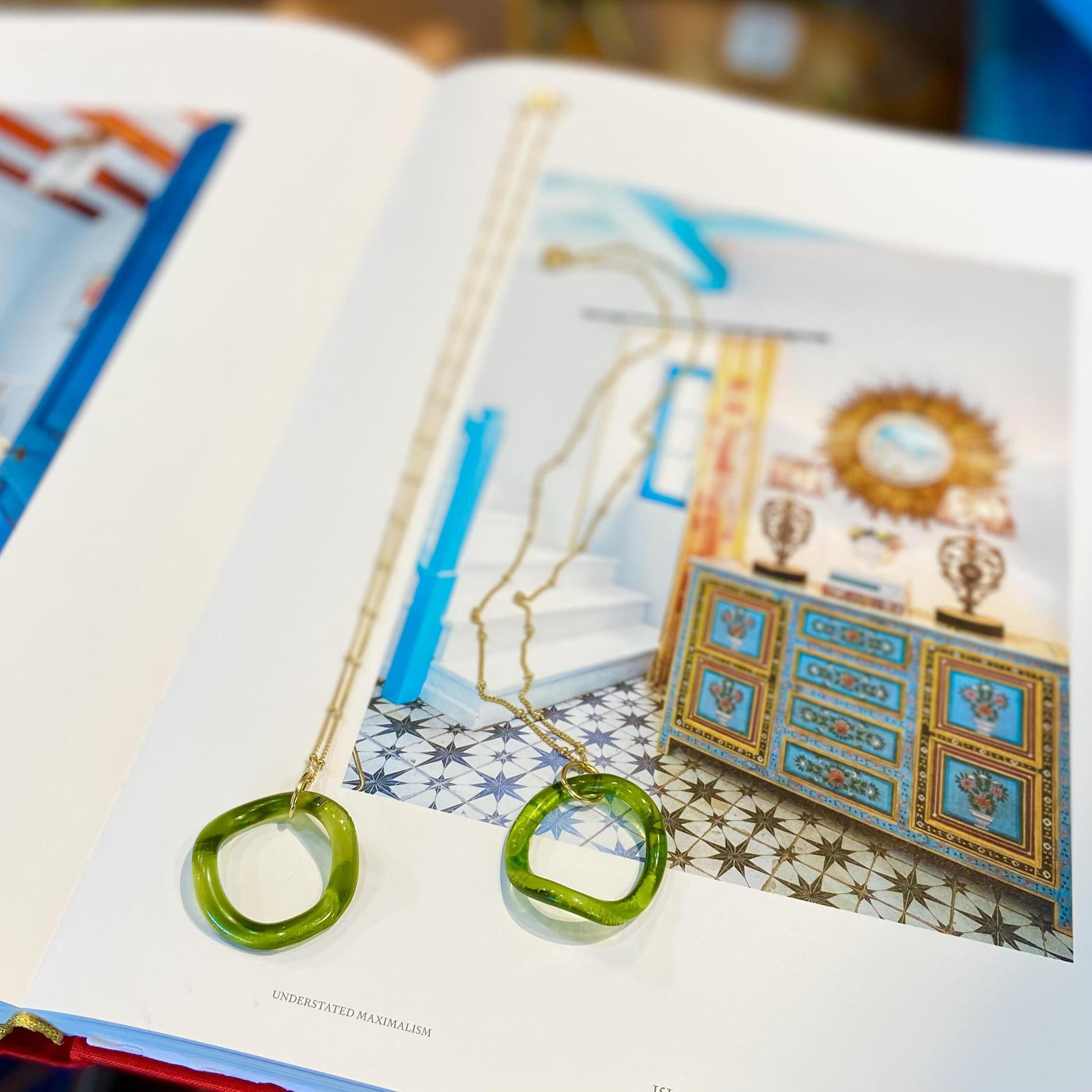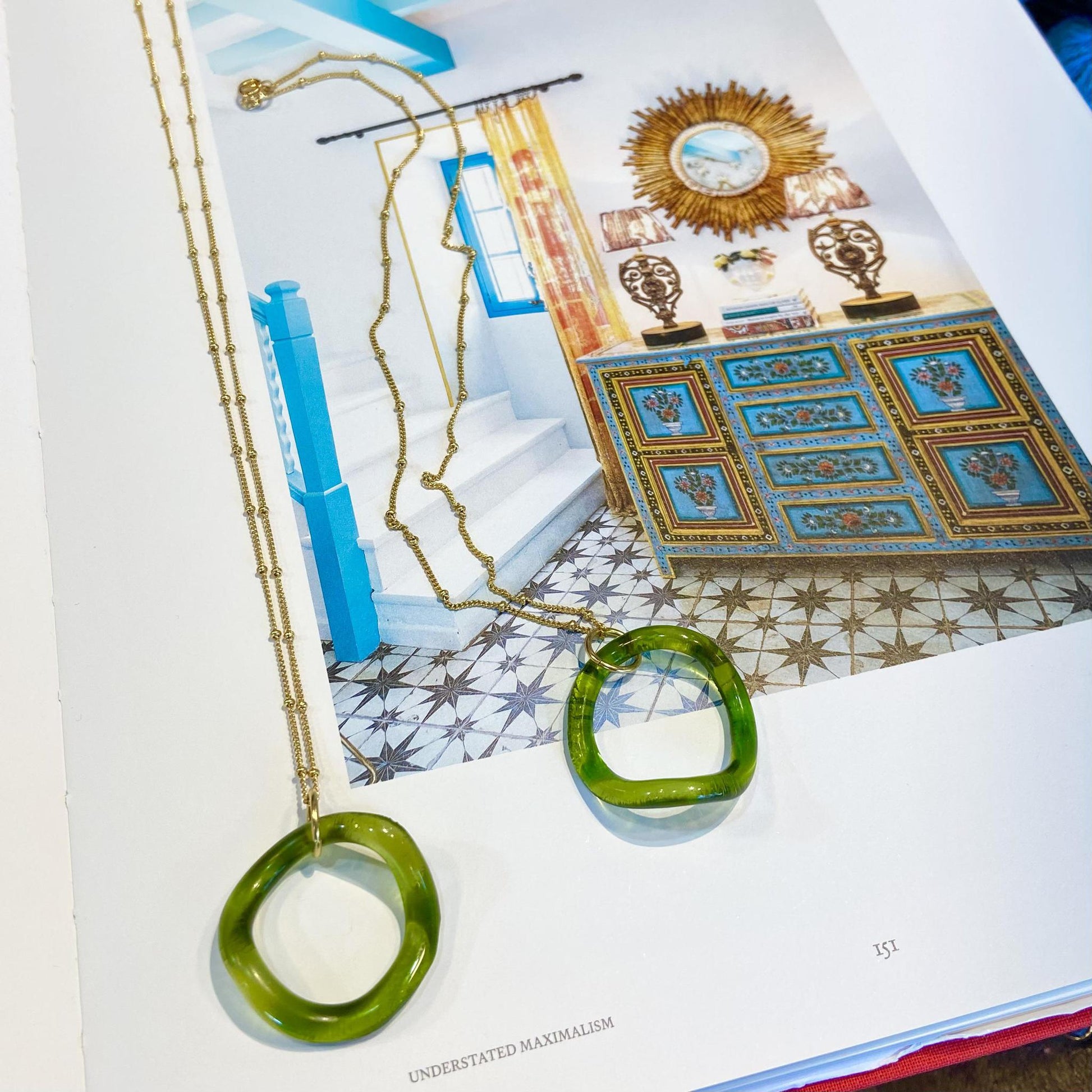 These necklaces feature reclaimed glass pieces from bottles. These necklaces are made from a slice of the bottle where the throat meets the mid-section. They become "wavy" in the kiln using cones to allow the glass to slump.