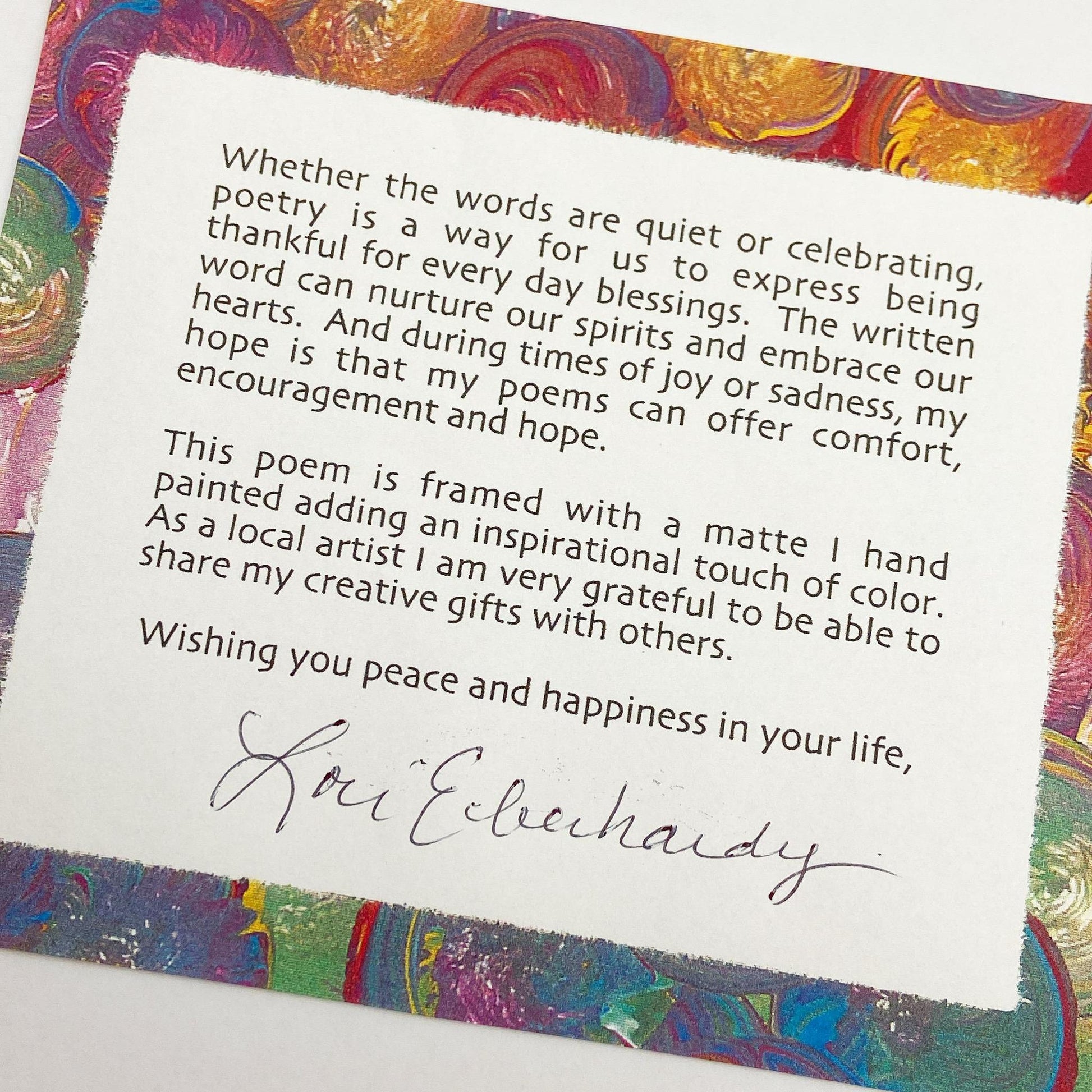 "Whether the words are quiet or celebrating, poetry is a way for us to express being thankful for every day blessings. The written word can nurture our spirits and embrace our hearts. And during times of joy or sadness, my hope is that my poems can offer comfort, encouragement, and hope. My poems are framed with a matte I hand-painted, adding an inspirational touch of color. As an artist, I am very grateful to be able to share my creative gifts with others. Wishing you peace and happiness in your life." - Lori Eberhardy