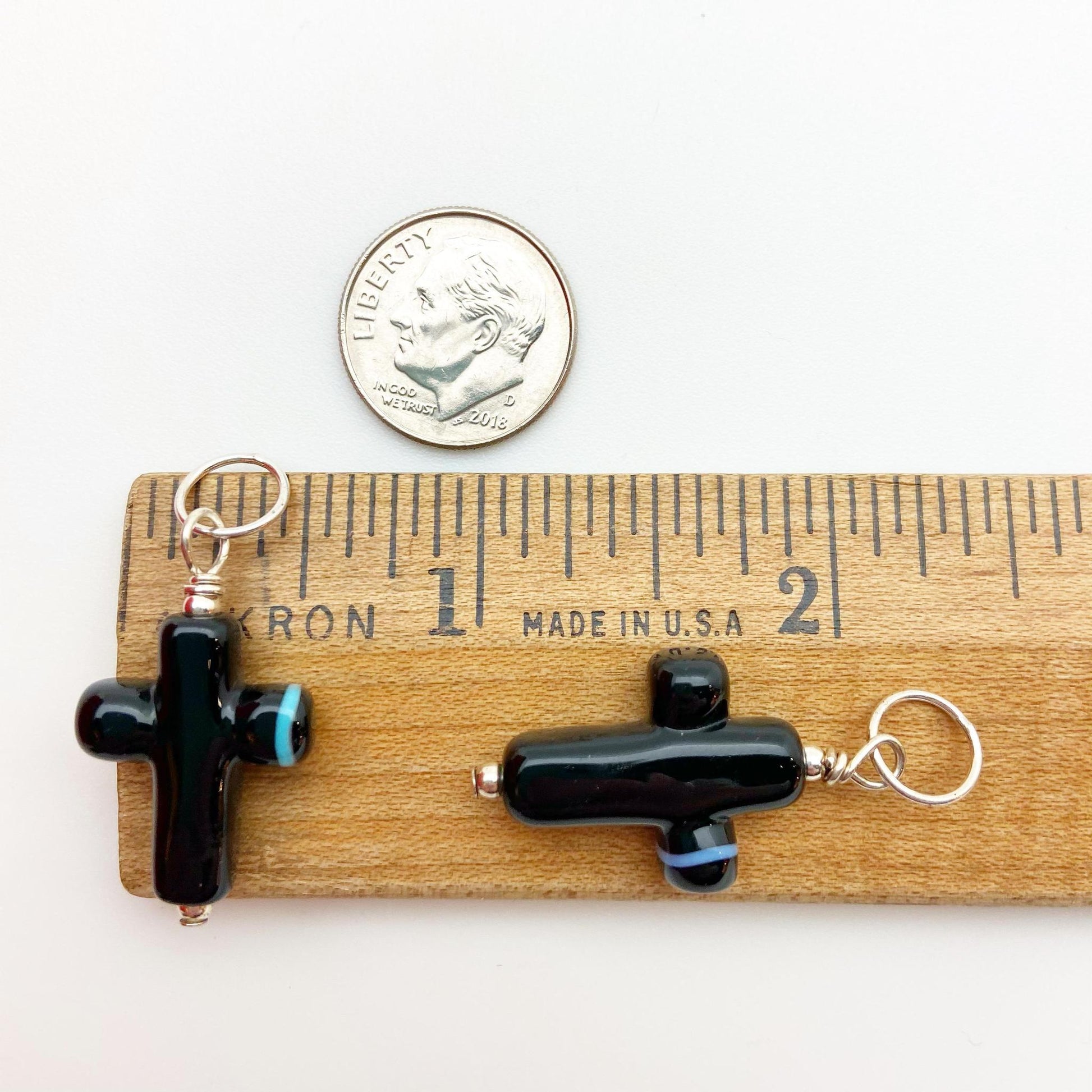 These handmade glass crosses, feature a subtle stripe on a reverent black cross. Simple, sophisticated, and understated.