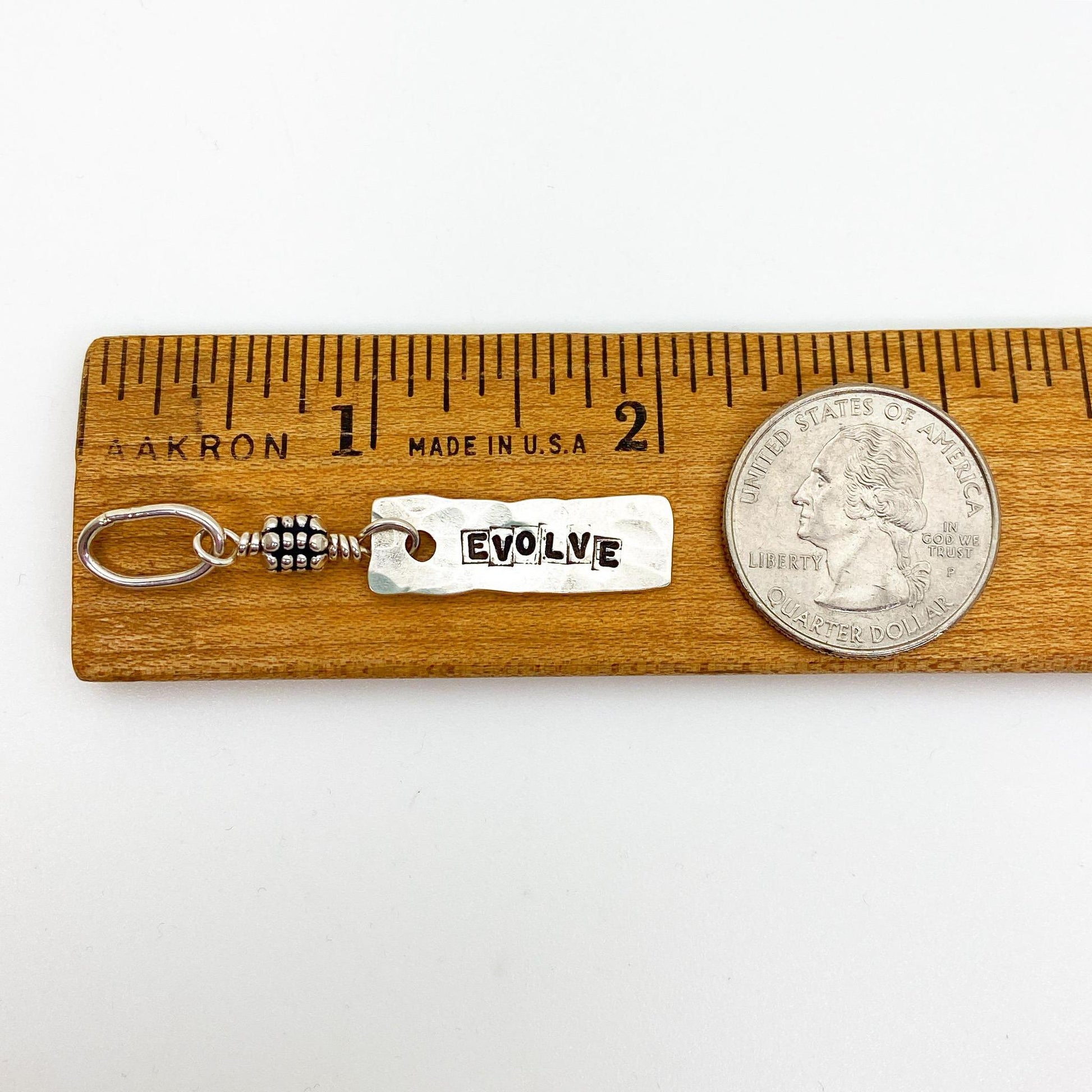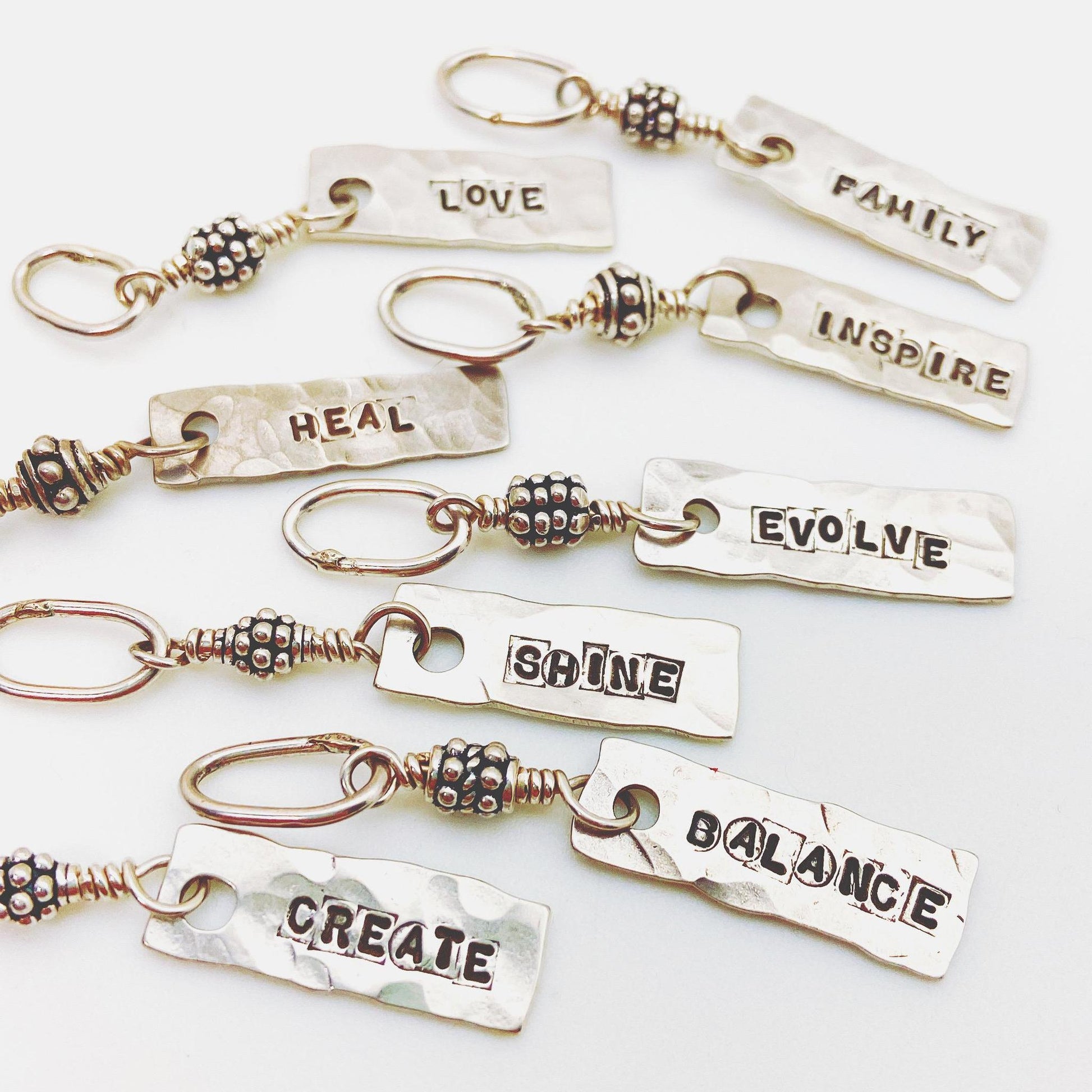 She adds sterling decorative beads and then hand-wires the charm to a handmade "oval jump ring" which is fully soldered so it cannot fall off. Each piece is hand-struck to give it a wonderful finish. Finally, it is polished to a shine, but the artist uses a technique that retains the darkened lettering. This ensures the lettering - struck deep into the silver - stands the test of time. Every piece is solid sterling silver.