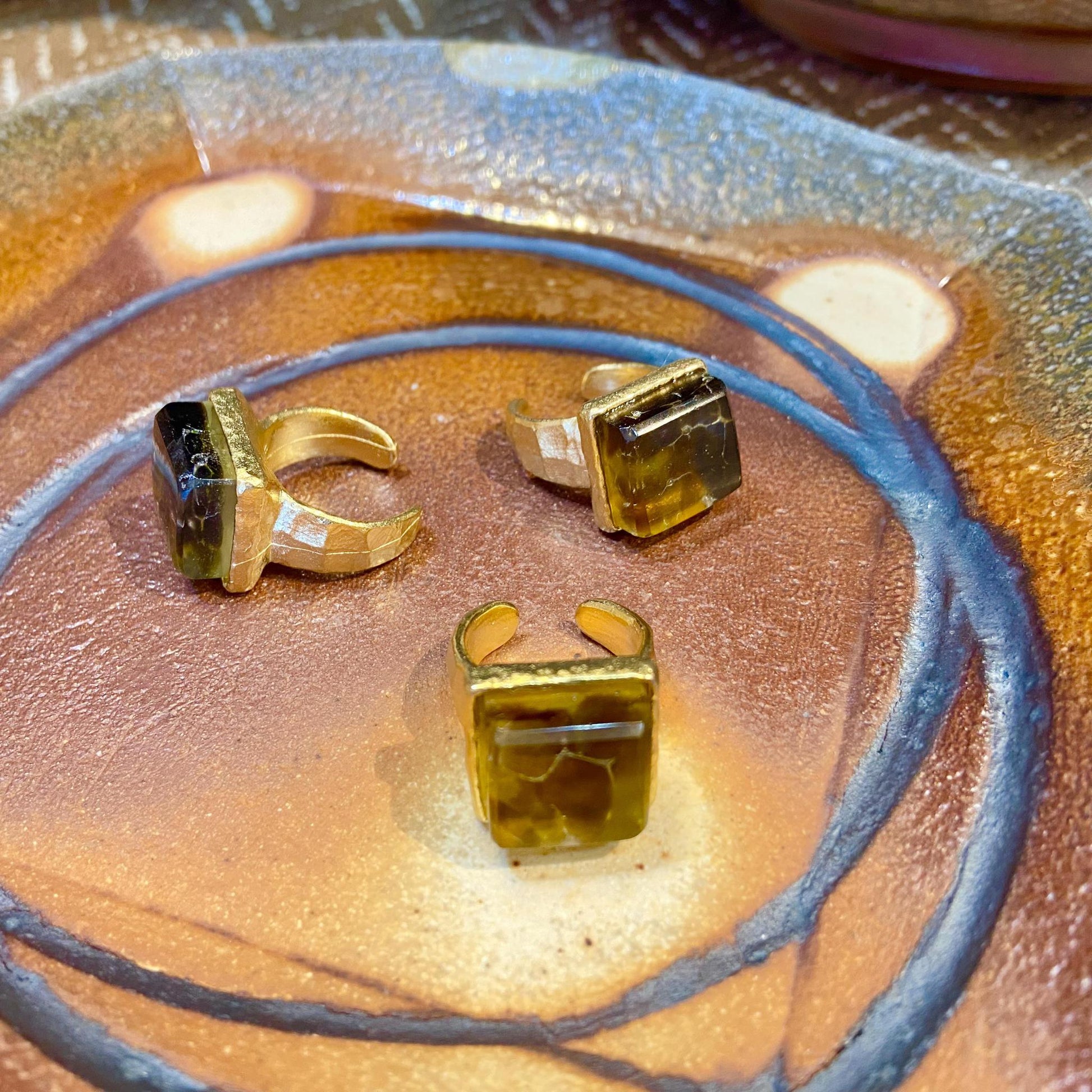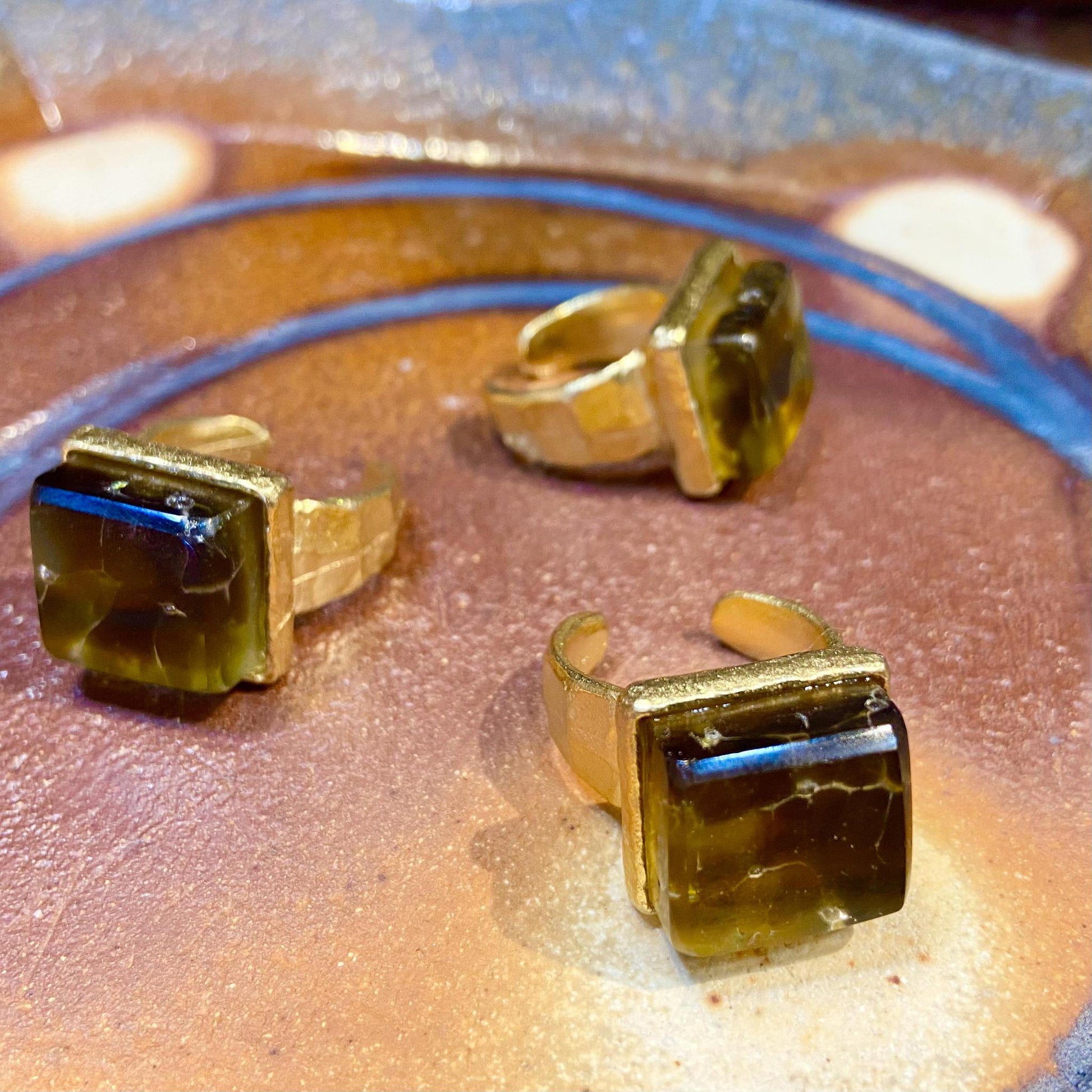 These rings feature reclaimed glass pieces from bottles. The bottles are cut and kiln-fired to create unique glass pieces. Each piece in this collection is handmade in the artist's studio. These rings are 14kt gold plated. They can be adjusted gently to fit. (We do not recommend over adjustment or adjusting them too often to help protect the plating.)