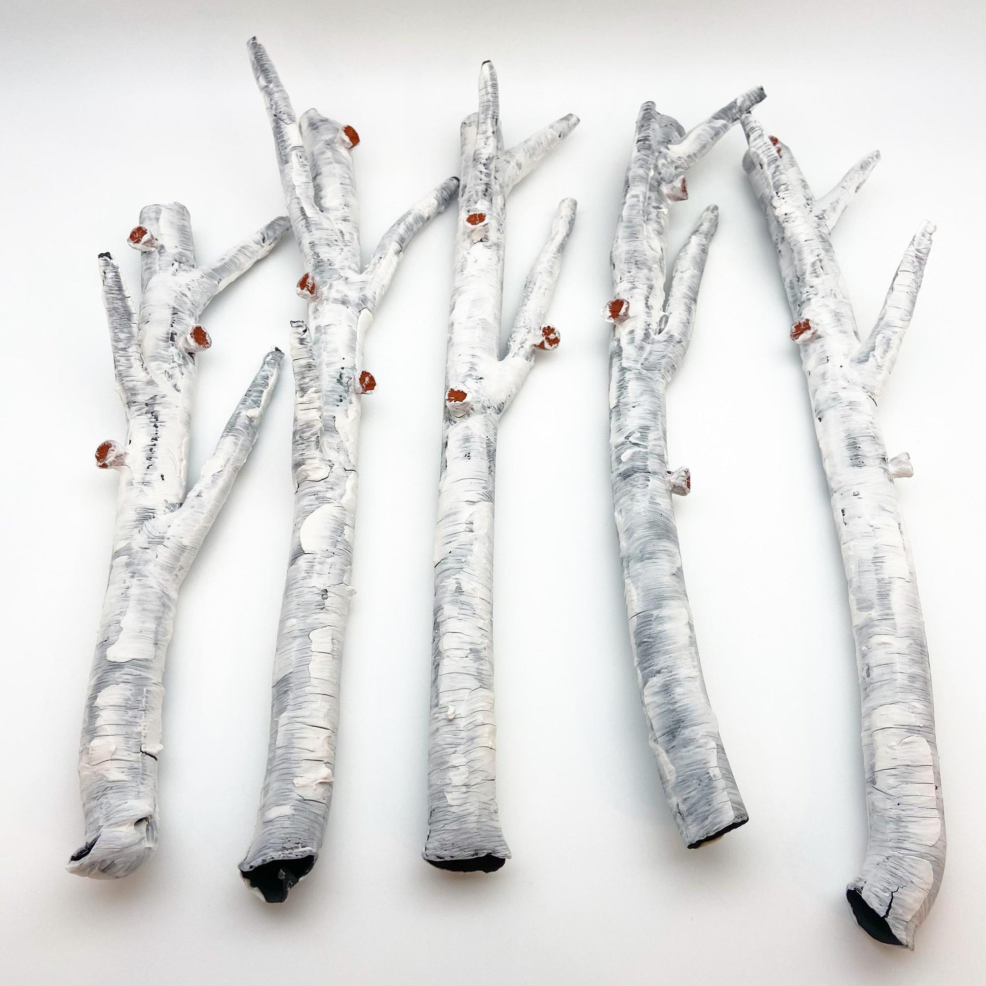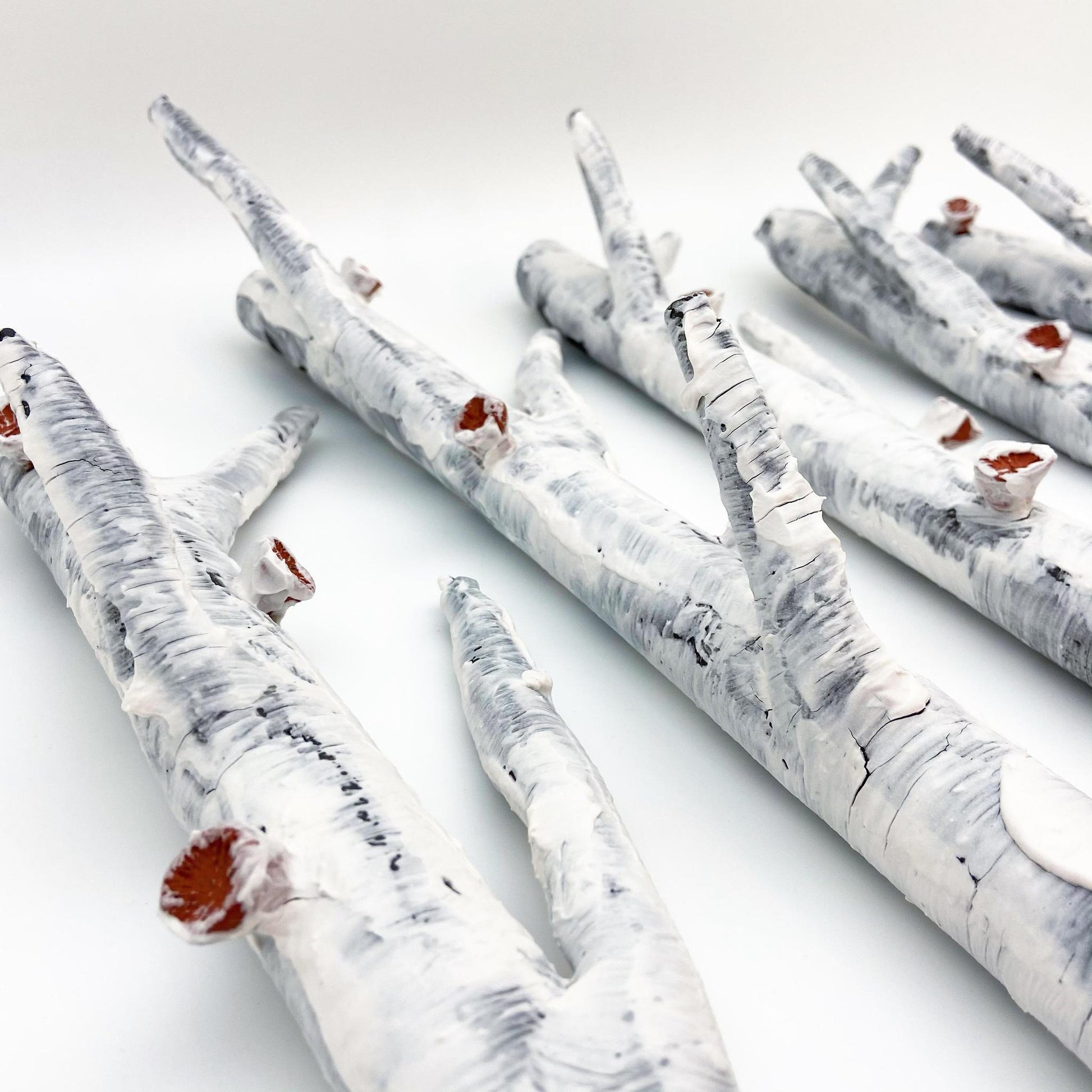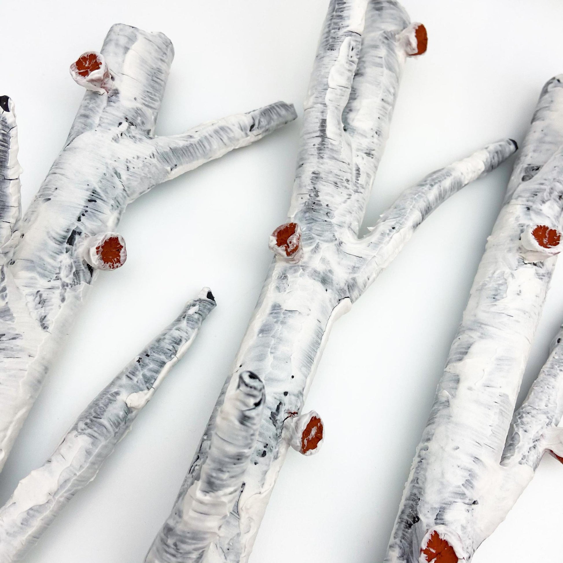 These stately aspen branches are hollow, handformed, and carved from ceramic. Kiln-glazed and fired cermamic.